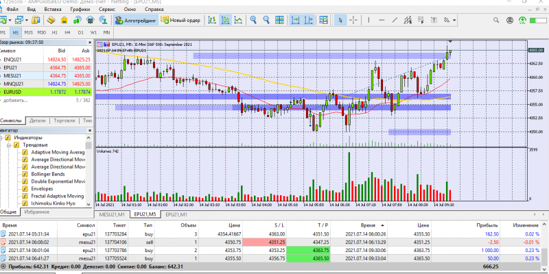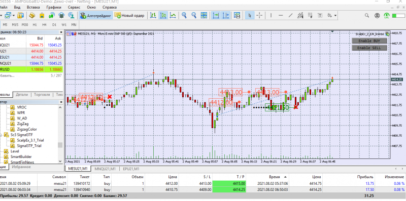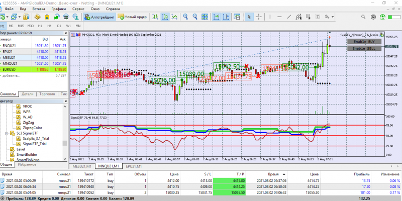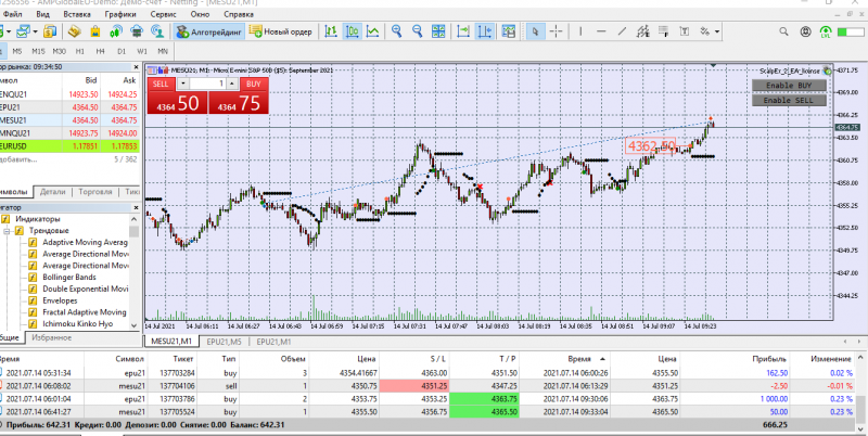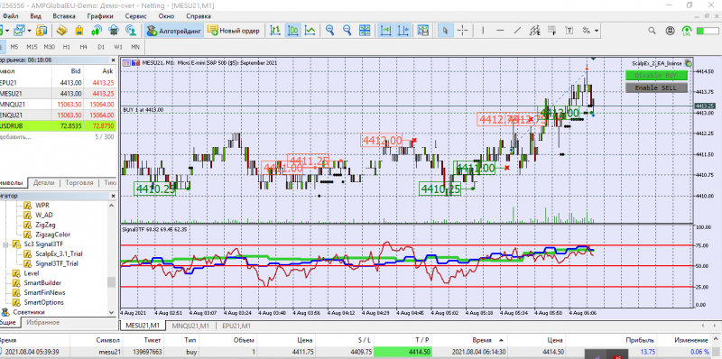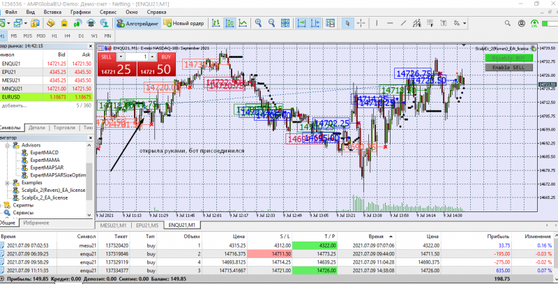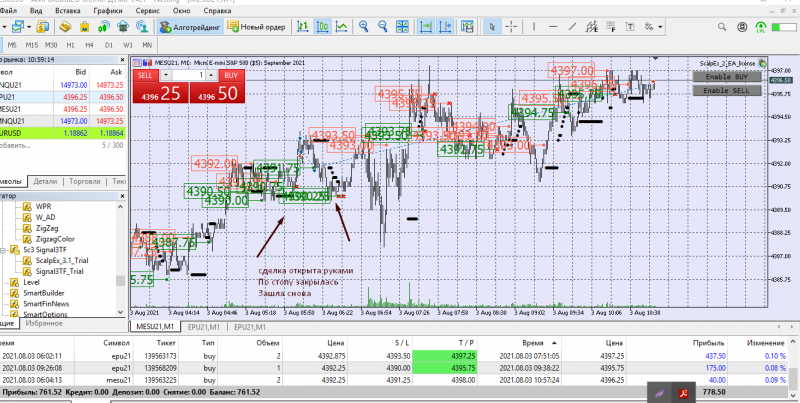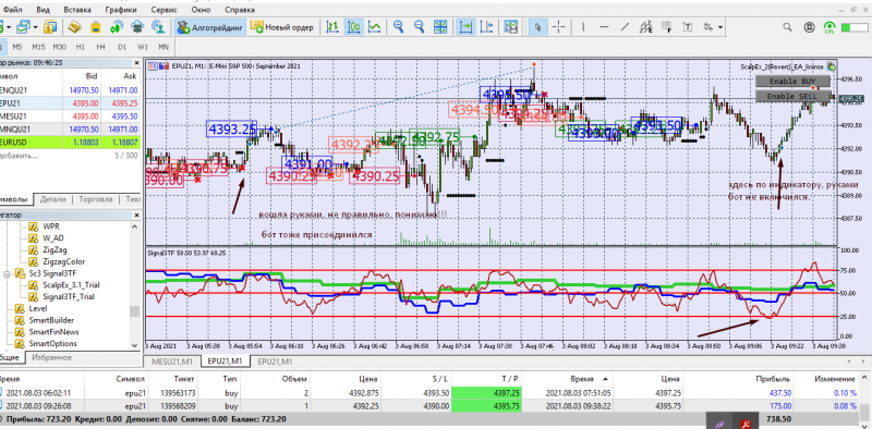Сегодня торговала с подвальным индикатором. Две сделки открыла руками на СНП -500 ( робот не открыл). Одна сделка на Наздак микро. Открыла руками, присоединился бот.