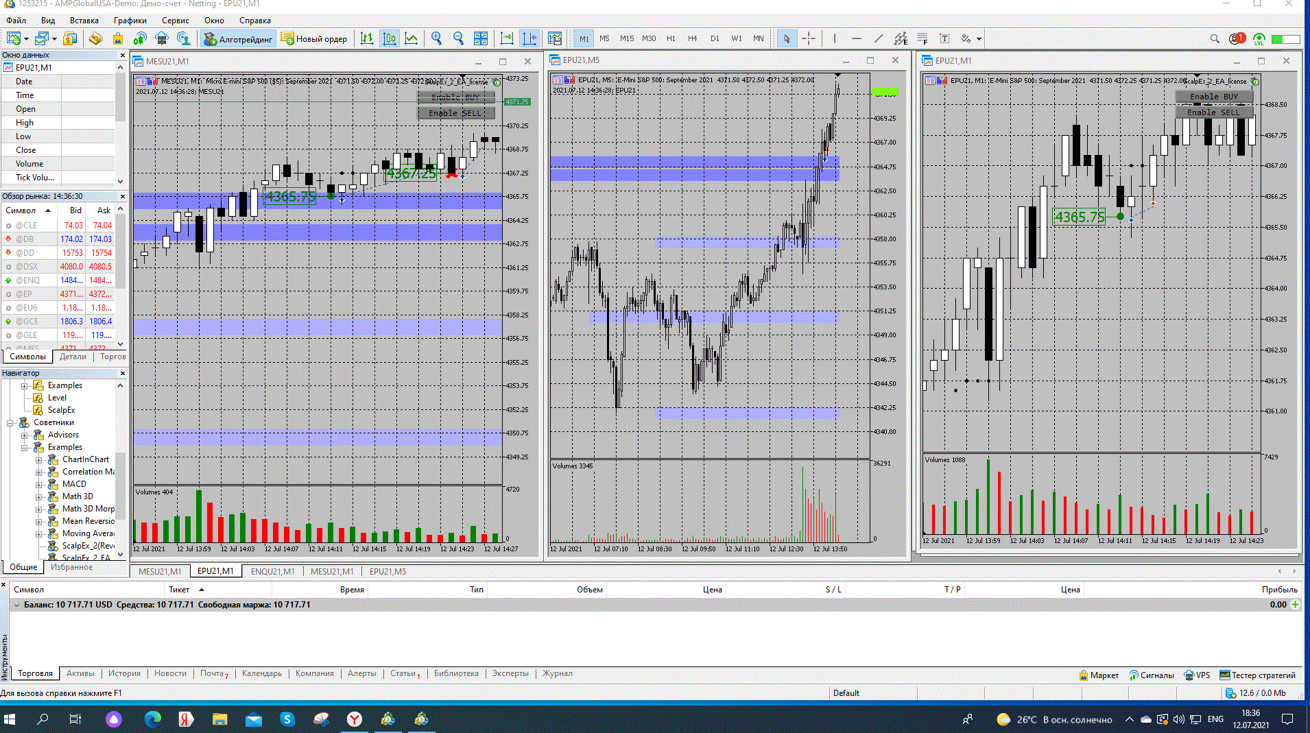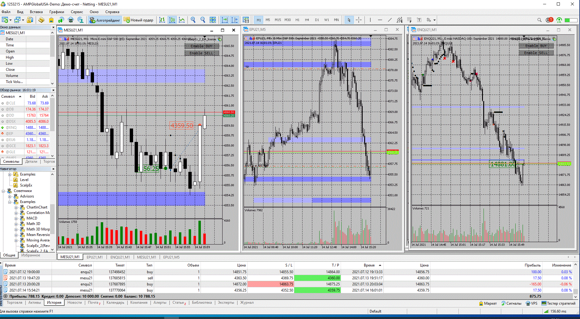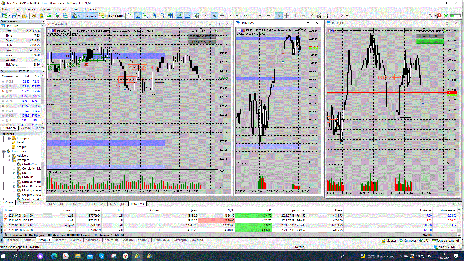 На SP500 произошел пролив и дальше он уперся в уровень и появились останавливающие объемы. На микро SP500 включил бай на отбой от уровня, ТР - 17.50, на мини SP500 бай на отбой от уровня, после достижения определенной цены бот перевел в безубыток. Решил попробовать взять тренд в интрадее и перевел ТР к началу пролива. Не выдержал и закрыл сделку руками, ТР - 787.50