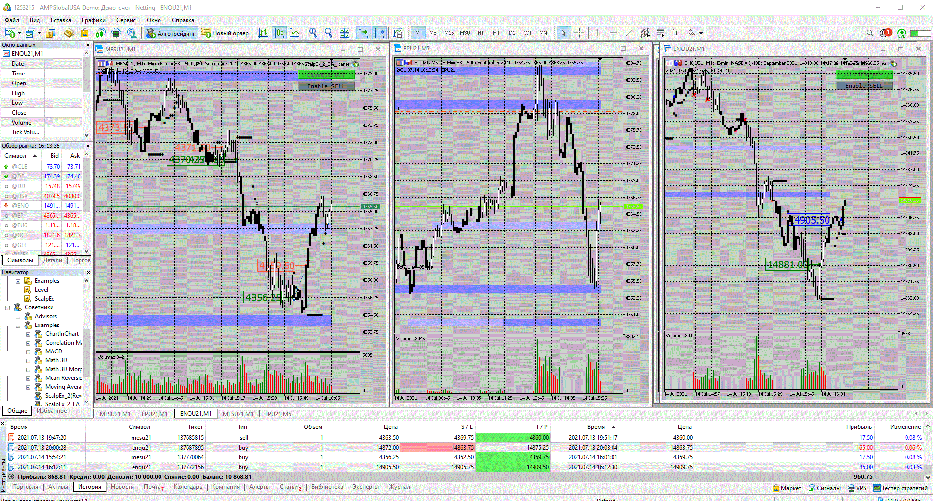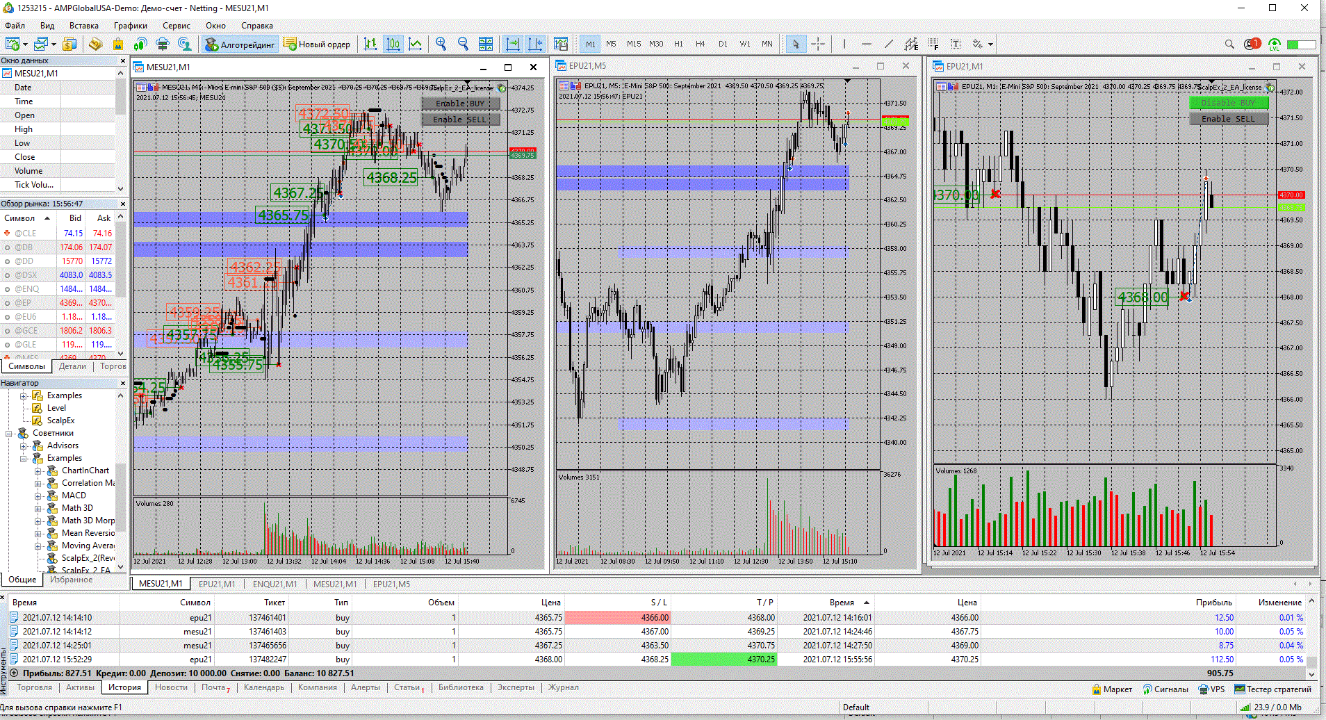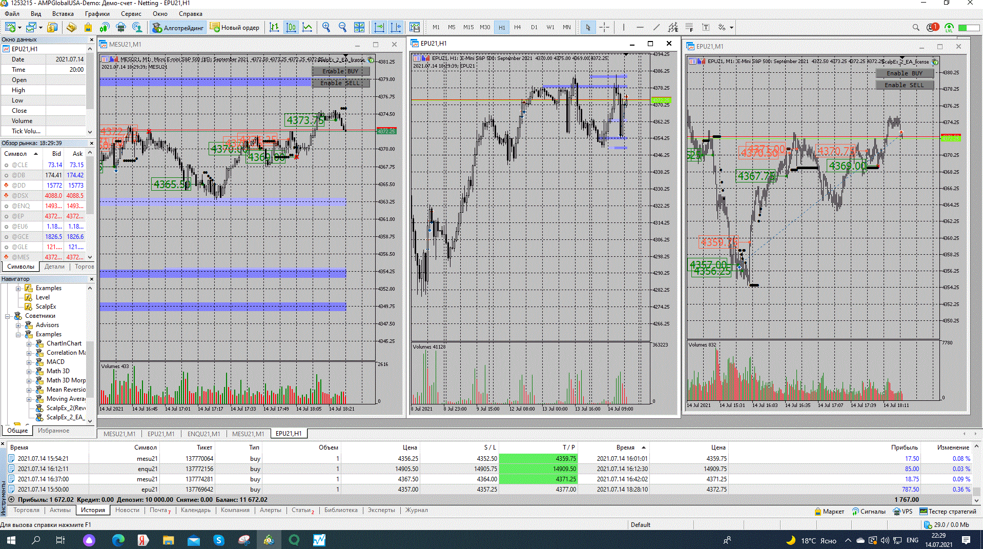 На микро SP500 бай при ретесте от уровня, ТР 12.50, на мини SP500 первый раз бай при ретесте от уровня Ретест был небольшой), бот перевел сделку в безубыток, ТР - 10.00, второй раз также бай при ретесте (ретест был после достаточного большого отклонения цены от уровня), ТР - 112.50