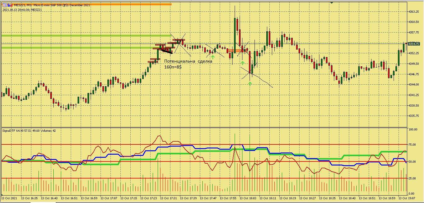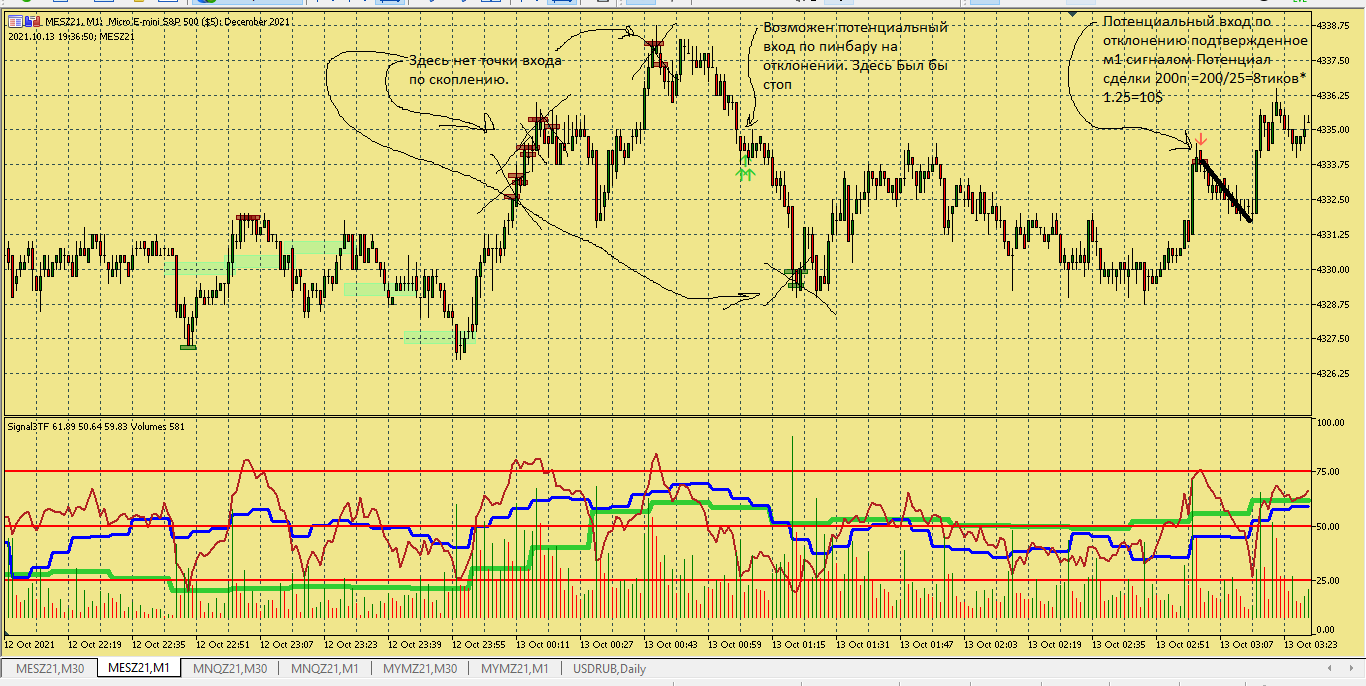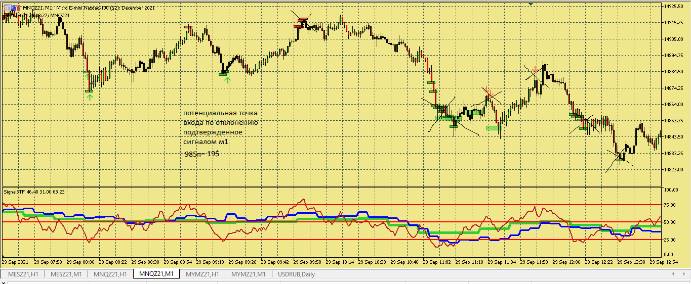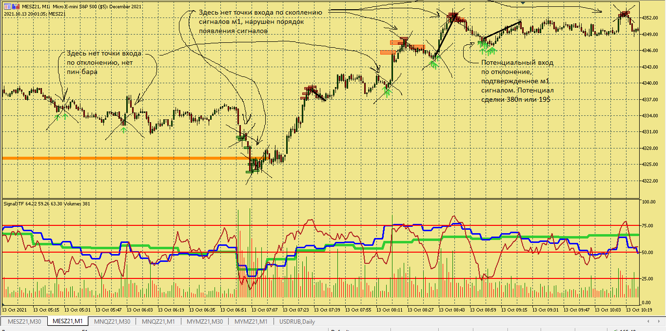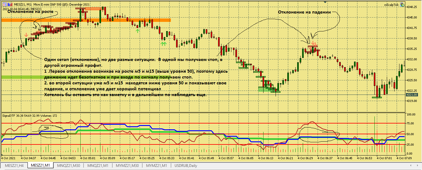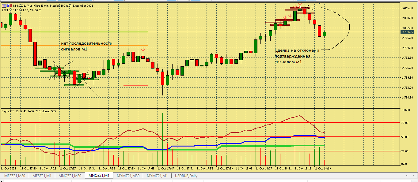 Размышление по поводу движения цены в этой ситуации. Вроде цена хорошо двигается, сигналы появляются друг за другом., отследил появление подтверждения , но сделка не пошла к цели. Здесь я думаю, что м5 была близка к зоне перепроданности и имеет свое влияние на движение цены в сторону перегруза, в то же время м15 тоже ниже 50, поэтому резкого разворота не получилось. Вот здесь надо по наблюдать, в других ситуациях с другим вариантами расположения м5 и м15 примерно в такой же ситуации.