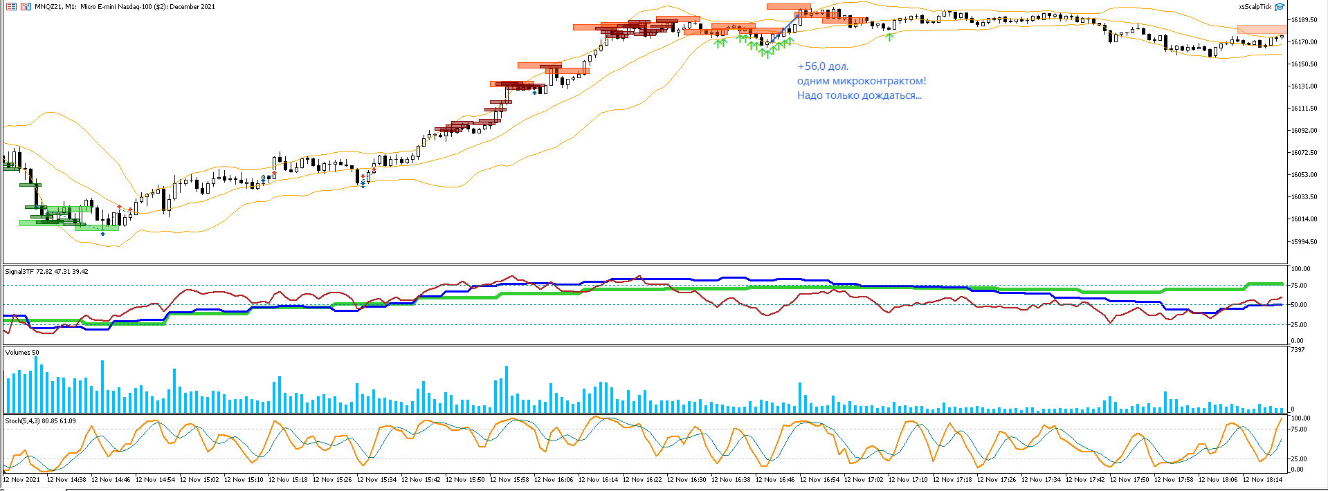 Хороший результат, вот только нечем гордиться, потому что по стратегии ни одной сделки. Дважды ловил проливы, отодвигал стоп так, как на реале бы не отодвинул и боялся сидеть по тренду. Какая-то хаотичная торговля. А все потому, что не хватает терпения дождаться сигнала. А ведь были два сигнала на МЕС и Насдаке, где можно было забрать больше и гораздо спокойнее! Просто этих сигналов так тяжело ждать часы напролет. Рынок пляшет, деньги - вот, а сигналов нет. Сидишь, ждешь, потом закрываешь терминал, а когда открыл, то сигналы как на ладони... когда тебя не было. И как с такими установками переходить на реал?.. Никак..