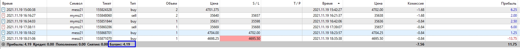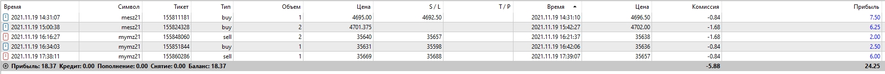 Рамиль Турабековнаписал17 ноября 2021 в 11:45Станислав Бардычевнаписал22 октября 2021 в 20:33Сижу и думаю: если работать по стратегии, то будет заработок. А если без стратегии, то будет вот такой вот ужас, как ниже. Даже стыдно такое публиковать. Даже нет никакого желания описывать каждую сделку. А все почему: забыл про новости и далее испытывал жуткое желание отыграть потери, все ждал разворот. На спокойном рынке он, может, и произошел бы. Но на новостях поносило знатно, и я этого не учел.