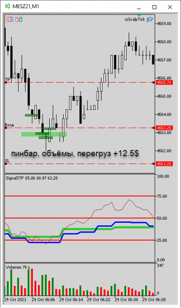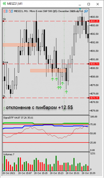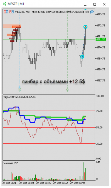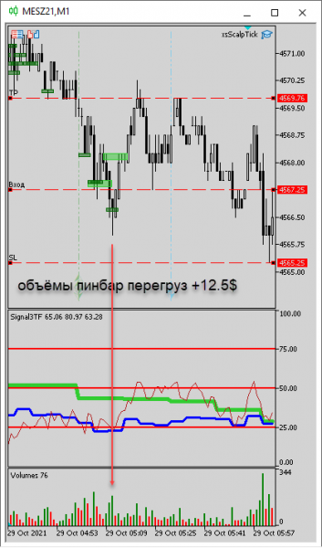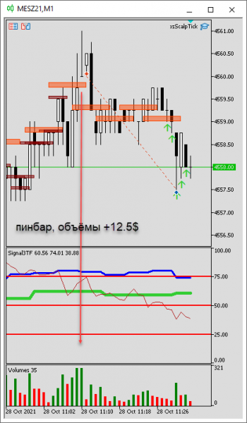 Присоединяюсь к вопросам! И хочу уточнить, что на приведенной иллюстрации - пин-бар с перегрузом М1. То есть как бы отвечает на первый вопрос Сергея. А вот, правда, если не будет ни перегруза М1, ни М5, ни М15 - просто пин-бар и объемы, то входить или нет? И, если входить, то выше пин-бара на 1 тик?