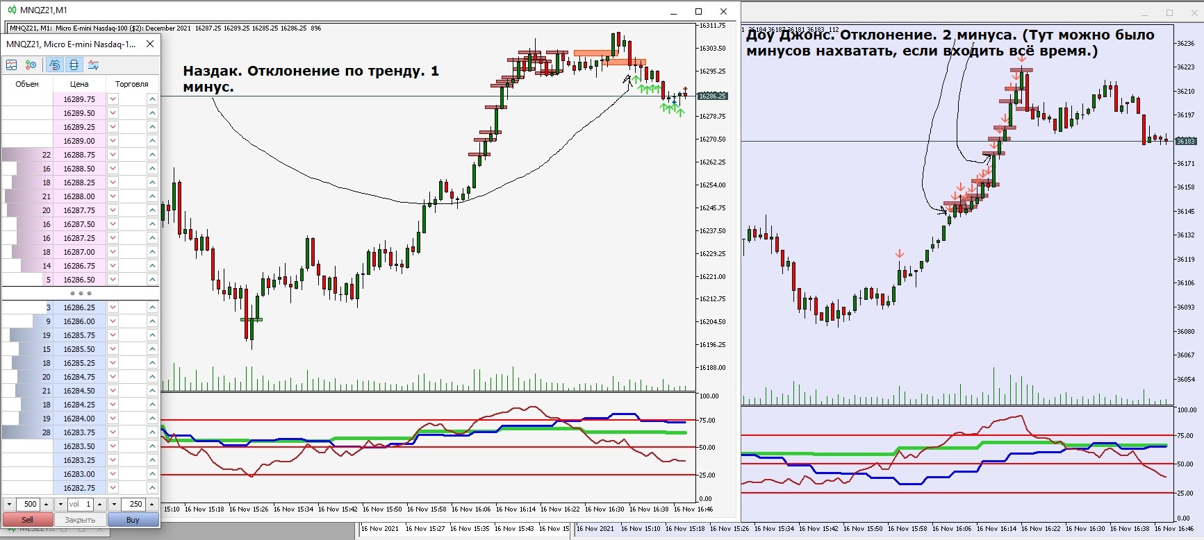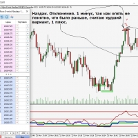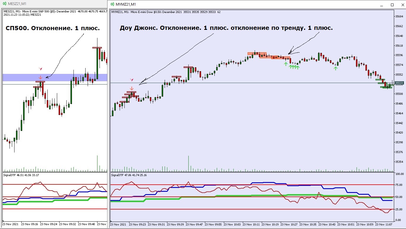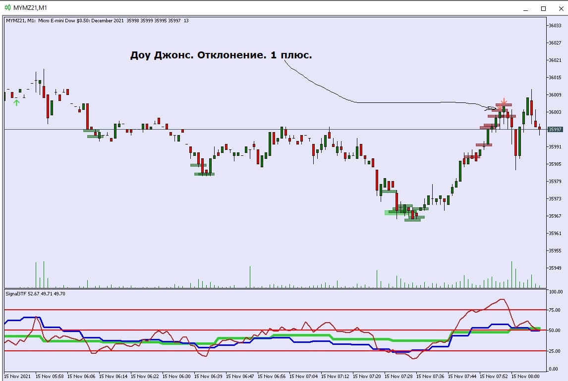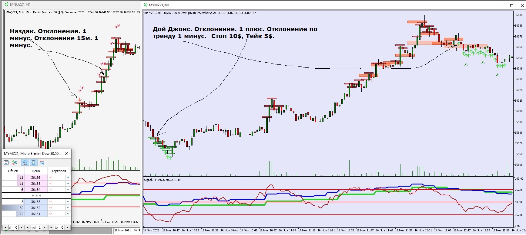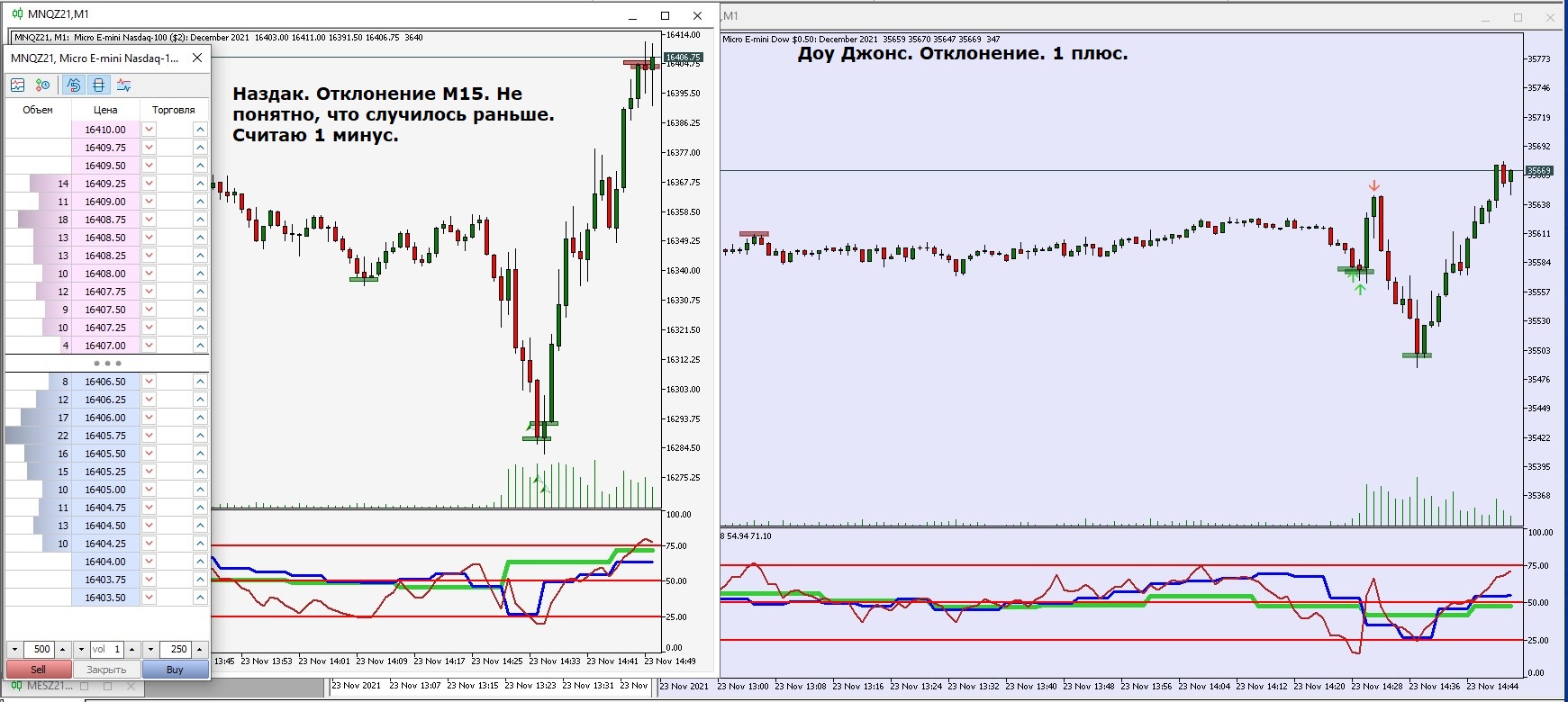Я делаю проверку сигналов на истории за прошлый день, чтобы было легче по итогам принимать решение на входы по стратегии. Пока торгую редко по разным причинам. Провожу тестирование на трёх микро инструментах: Наздак, СП500 и Доу Джонс по двум стратегиям с 8 до 20ч. по терминальному времени по следующим правилам. 1. Отклонения. Беру все отклонения. Вход на открытии первой свечи после сигнала (стрелка и полоска). Тейк 5$, стоп 10$. Больше двух отклонений в одной непрерывной серии не беру. Если не понятно, по истории на минутках, что было раньше стоп или тейк, этот сигнал пропускаю, но если он в серии, то считаю, что он был с 0 результатом, поэтому в этой серии беру ещё только один следующий сигнал. 2. Дивергенция. Считаю все дивергенции в том числе и без перегруза, и с неявной 2 волной, и с явной 4 волной. Не считаю дивергенции, где по индикатору линия М1 ушла за 50% в промежутке между 1 и 3 волнами.