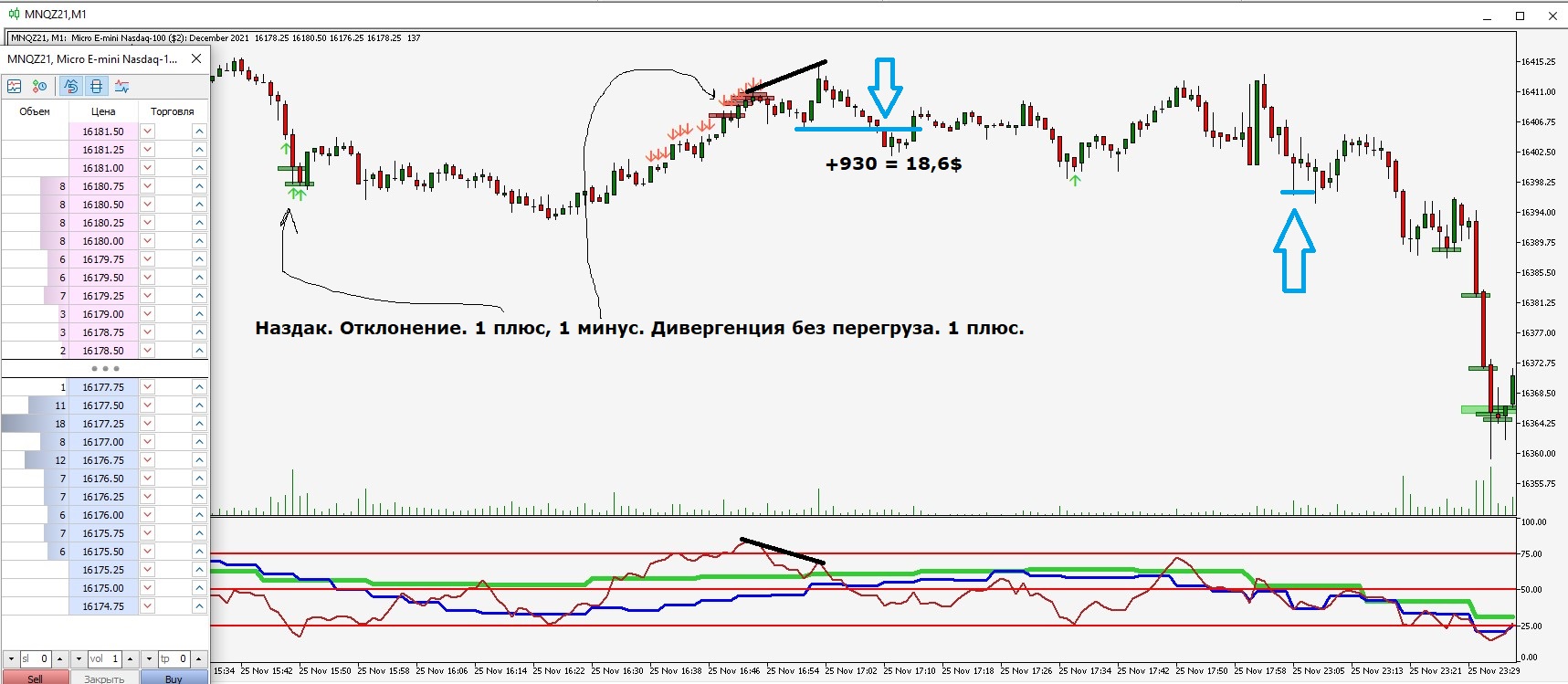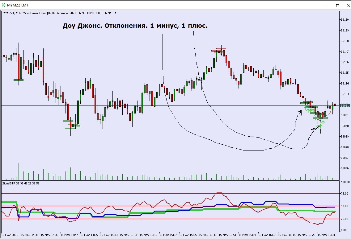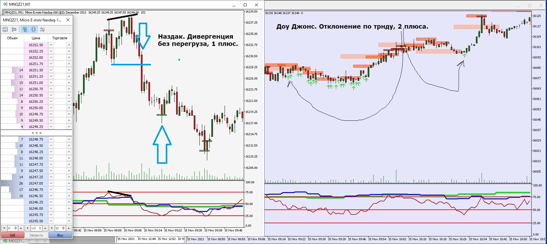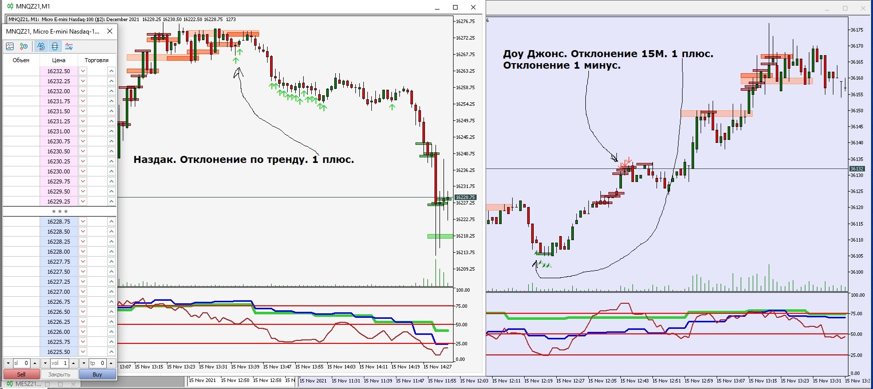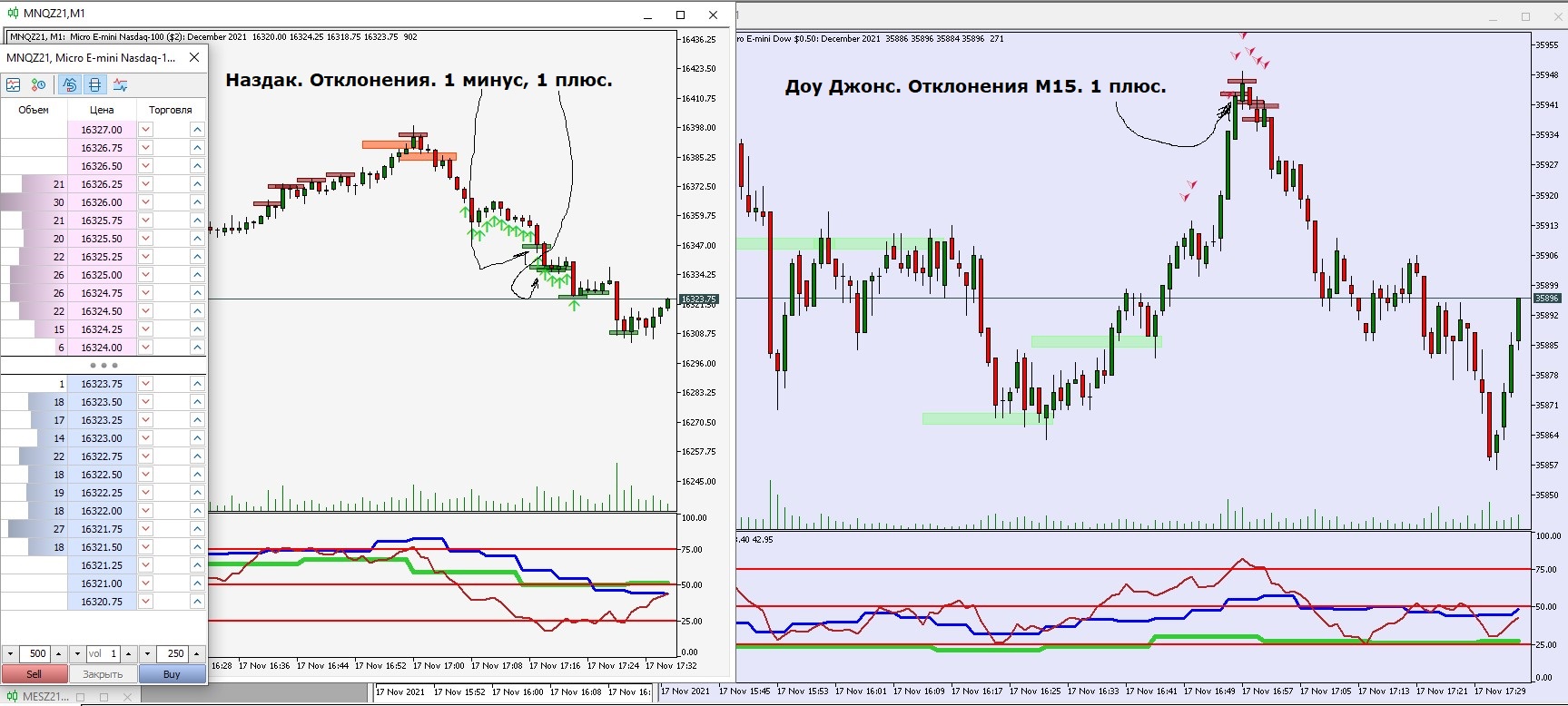 Я делаю проверку сигналов на истории за прошлый день, чтобы было легче по итогам принимать решение на входы по стратегии. Пока торгую редко по разным причинам. Провожу тестирование на трёх микро инструментах: Наздак, СП500 и Доу Джонс по двум стратегиям с 8 до 20ч. по терминальному времени по следующим правилам. 1. Отклонения. Беру все отклонения. Вход на открытии первой свечи после сигнала (стрелка и полоска). Тейк 5$, стоп 10$. Больше двух отклонений в одной непрерывной серии не беру. Если не понятно, по истории на минутках, что было раньше стоп или тейк, этот сигнал пропускаю, но если он в серии, то считаю, что он был с 0 результатом, поэтому в этой серии беру ещё только один следующий сигнал. 2. Дивергенция. Считаю все дивергенции в том числе и без перегруза, и с неявной 2 волной, и с явной 4 волной. Не считаю дивергенции, где по индикатору линия М1 ушла за 50% в промежутке между 1 и 3 волнами.