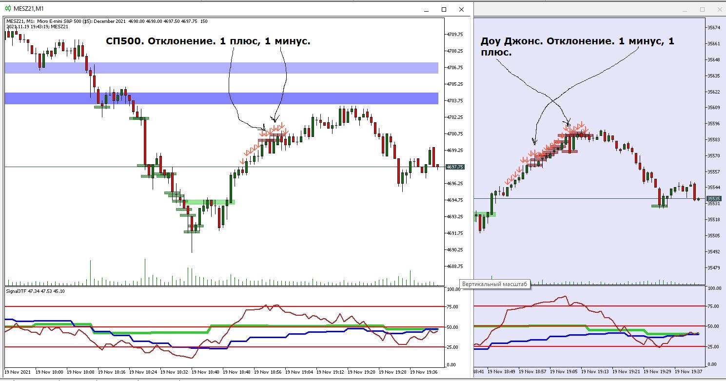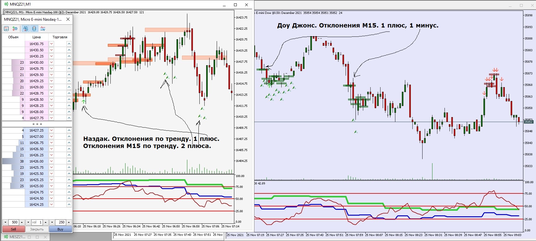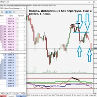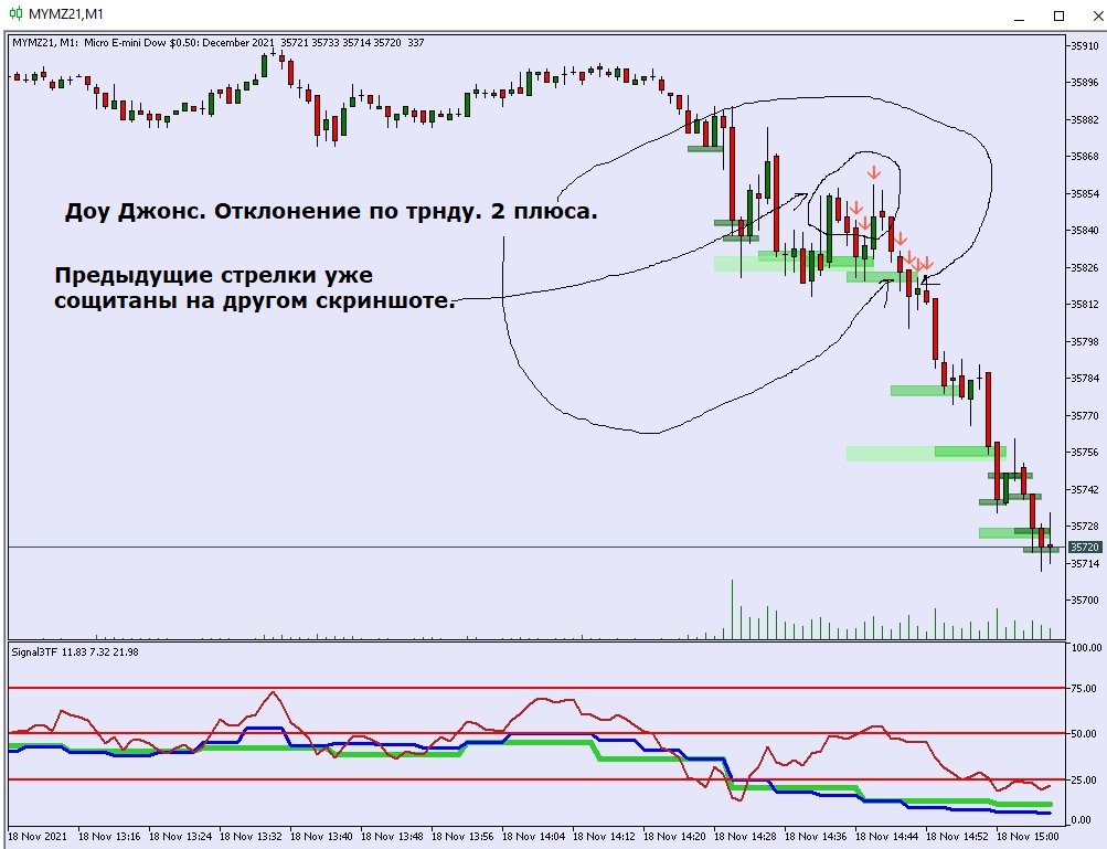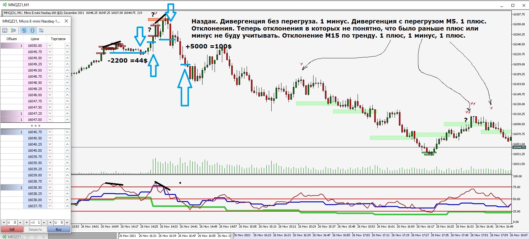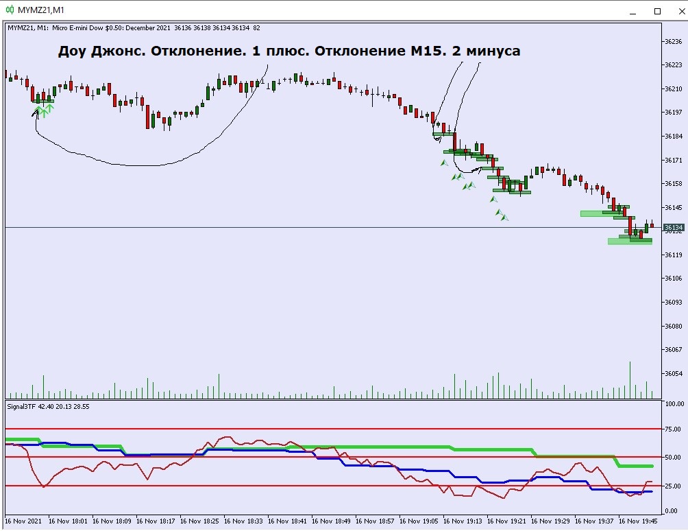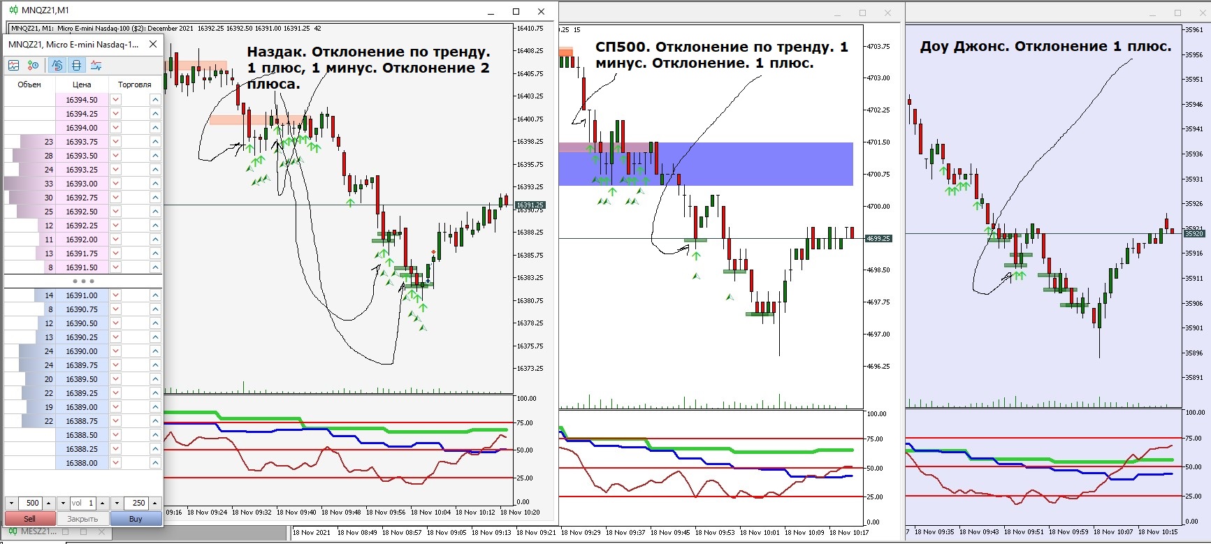 Я делаю проверку сигналов на истории за прошлый день, чтобы было легче по итогам принимать решение на входы по стратегии. Пока торгую редко по разным причинам. Провожу тестирование на трёх микро инструментах: Наздак, СП500 и Доу Джонс по двум стратегиям с 8 до 20ч. по терминальному времени по следующим правилам. 1. Отклонения. Беру все отклонения. Вход на открытии первой свечи после сигнала (стрелка и полоска). Тейк 5$, стоп 10$. Больше двух отклонений в одной непрерывной серии не беру. Если не понятно, по истории на минутках, что было раньше стоп или тейк, этот сигнал пропускаю, но если он в серии, то считаю, что он был с 0 результатом, поэтому в этой серии беру ещё только один следующий сигнал. 2. Дивергенция. Считаю все дивергенции в том числе и без перегруза, и с неявной 2 волной, и с явной 4 волной. Не считаю дивергенции, где по индикатору линия М1 ушла за 50% в промежутке между 1 и 3 волнами.