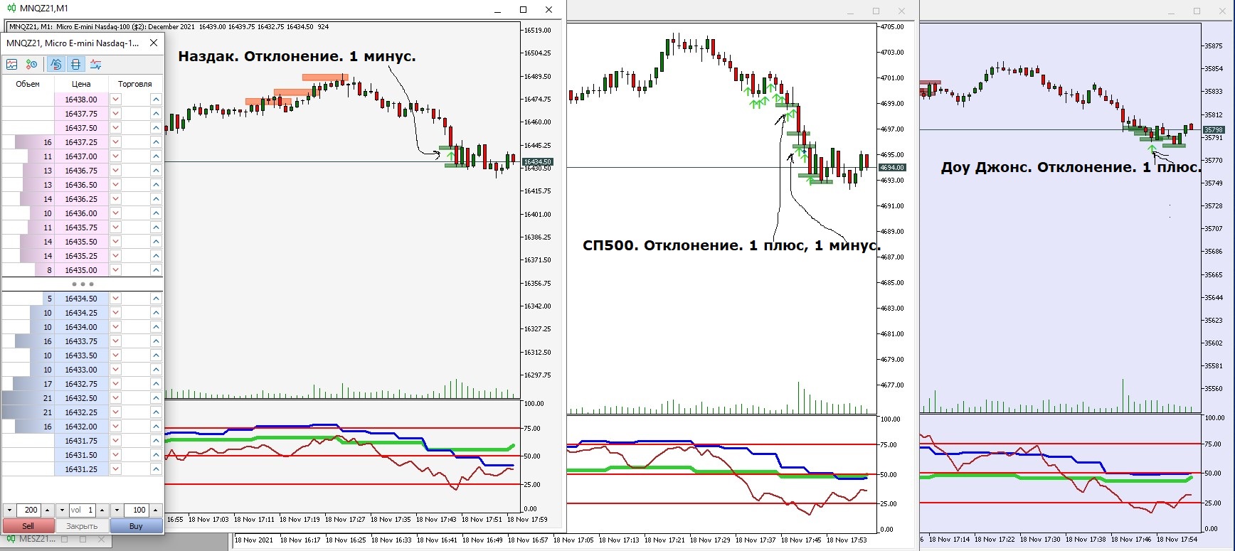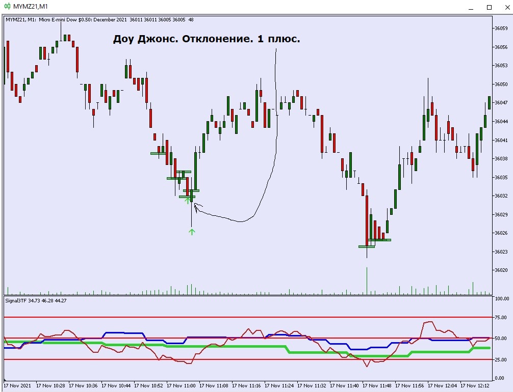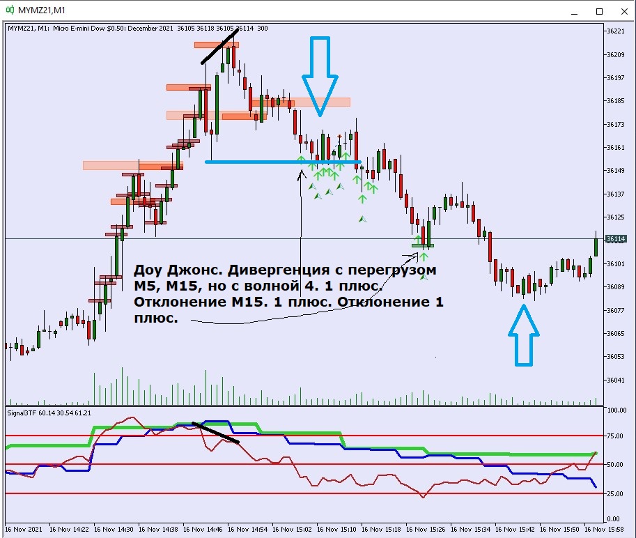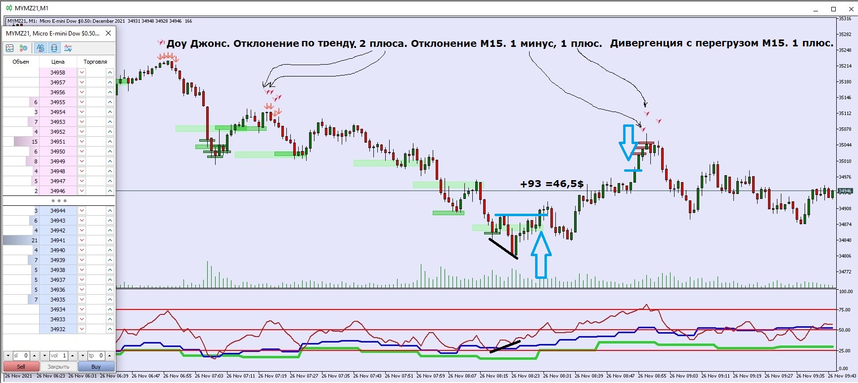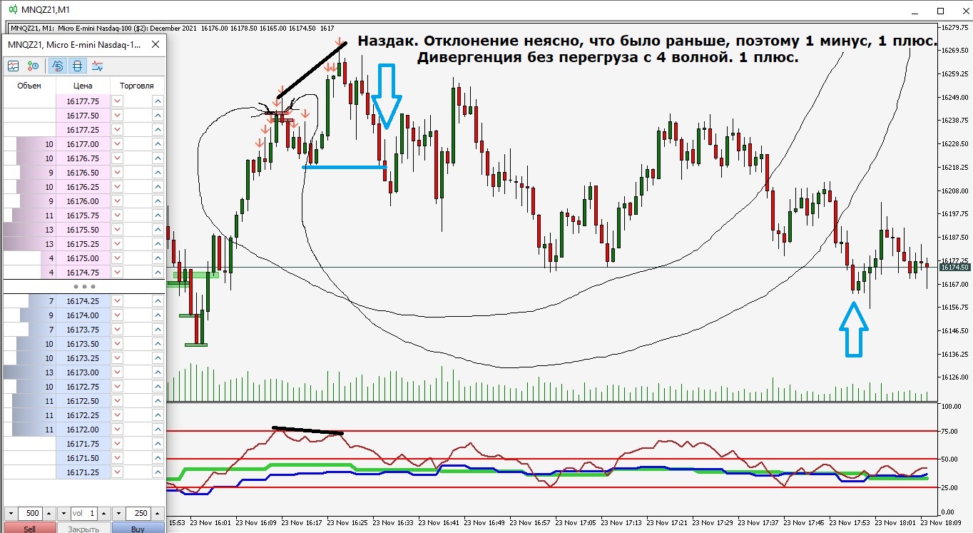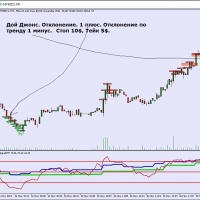 Я делаю проверку сигналов на истории за прошлый день, чтобы было легче по итогам принимать решение на входы по стратегии. Пока торгую редко по разным причинам. Провожу тестирование на трёх микро инструментах: Наздак, СП500 и Доу Джонс по двум стратегиям с 8 до 20ч. по терминальному времени по следующим правилам. 1. Отклонения. Беру все отклонения. Вход на открытии первой свечи после сигнала (стрелка и полоска). Тейк 5$, стоп 10$. Больше двух отклонений в одной непрерывной серии не беру. Если не понятно, по истории на минутках, что было раньше стоп или тейк, этот сигнал пропускаю, но если он в серии, то считаю, что он был с 0 результатом, поэтому в этой серии беру ещё только один следующий сигнал. 2. Дивергенция. Считаю все дивергенции в том числе и без перегруза, и с неявной 2 волной, и с явной 4 волной. Не считаю дивергенции, где по индикатору линия М1 ушла за 50% в промежутке между 1 и 3 волнами.