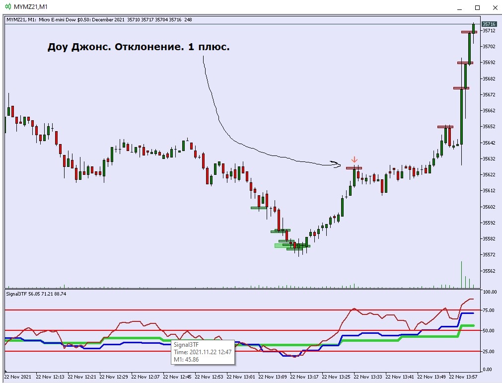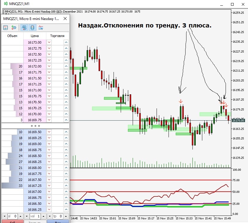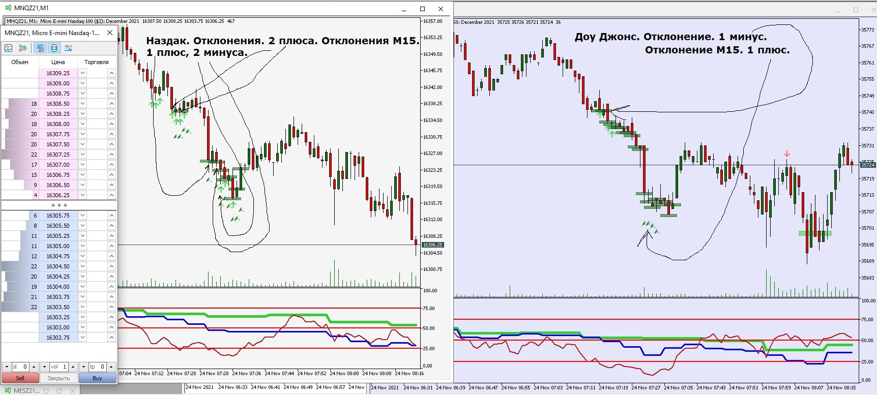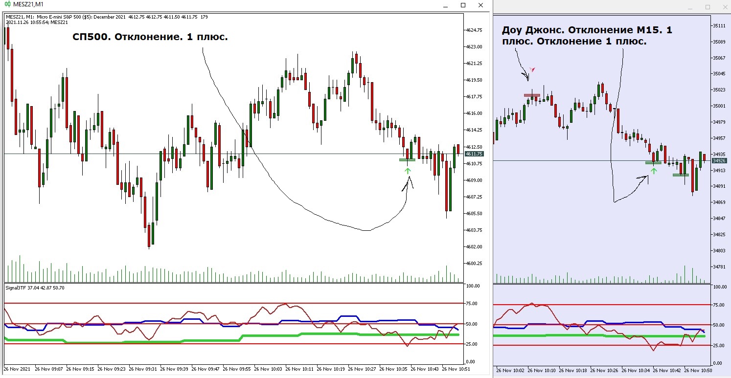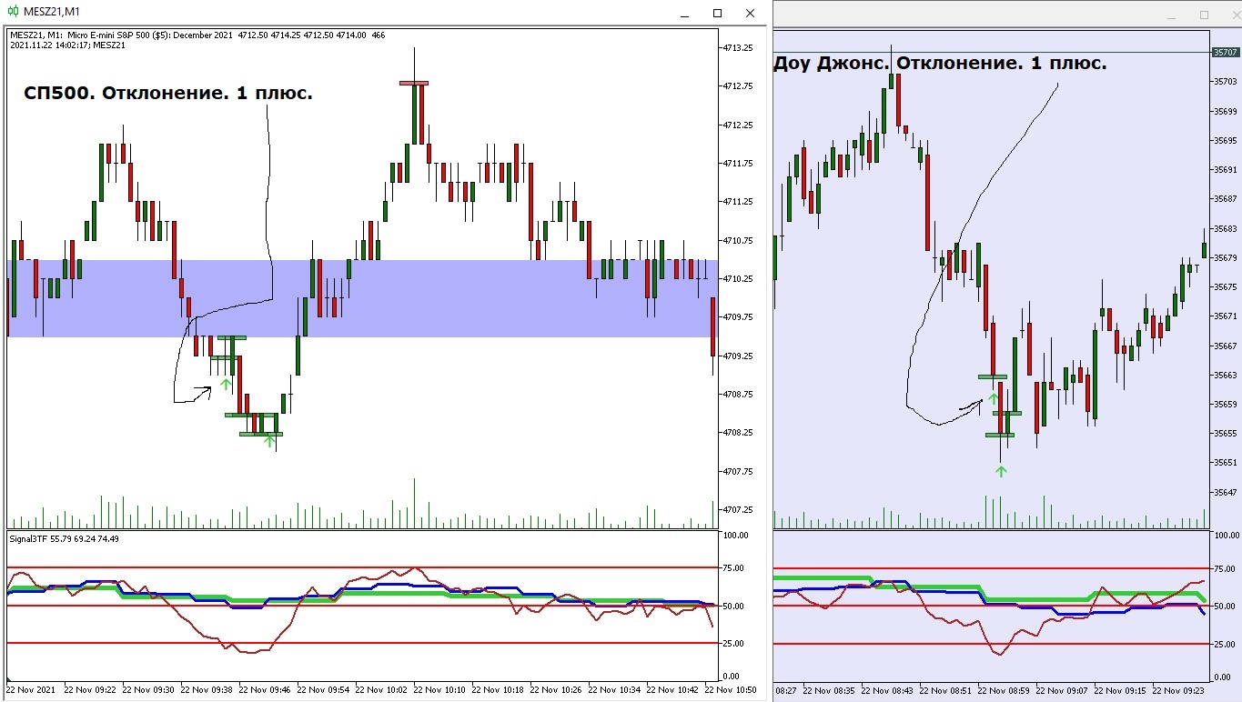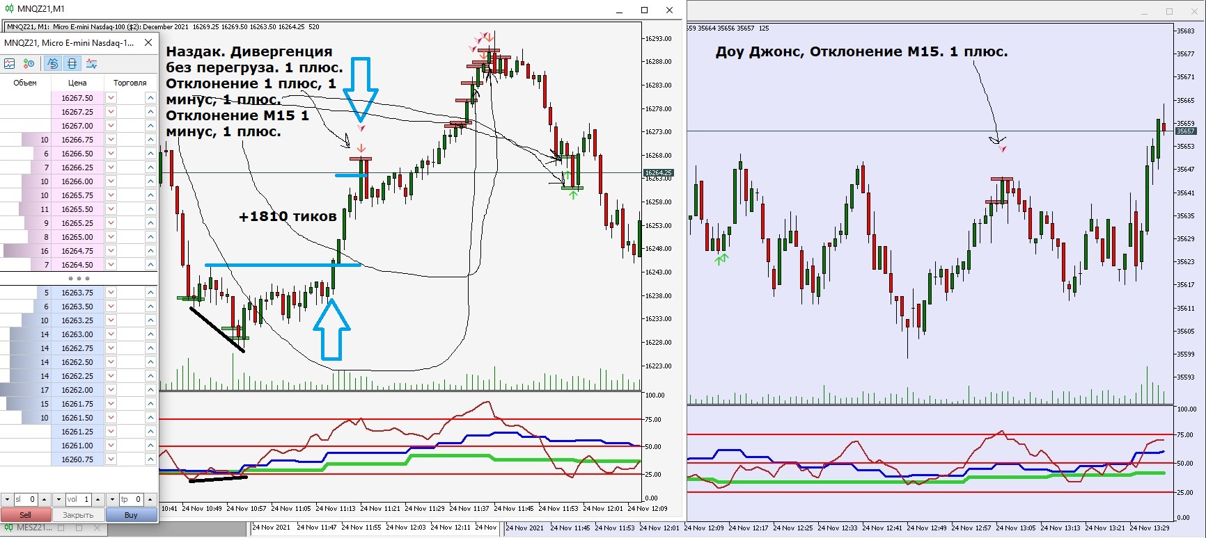 Я делаю проверку сигналов на истории за прошлый день, чтобы было легче по итогам принимать решение на входы по стратегии. Пока торгую редко по разным причинам. Провожу тестирование на трёх микро инструментах: Наздак, СП500 и Доу Джонс по двум стратегиям с 8 до 20ч. по терминальному времени по следующим правилам. 1. Отклонения. Беру все отклонения. Вход на открытии первой свечи после сигнала (стрелка и полоска). Тейк 5$, стоп 10$. Больше двух отклонений в одной непрерывной серии не беру. Если не понятно, по истории на минутках, что было раньше стоп или тейк, этот сигнал пропускаю, но если он в серии, то считаю, что он был с 0 результатом, поэтому в этой серии беру ещё только один следующий сигнал. 2. Дивергенция. Считаю все дивергенции в том числе и без перегруза, и с неявной 2 волной, и с явной 4 волной. Не считаю дивергенции, где по индикатору линия М1 ушла за 50% в промежутке между 1 и 3 волнами.
