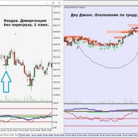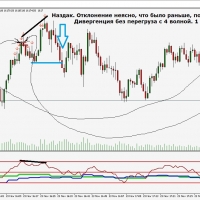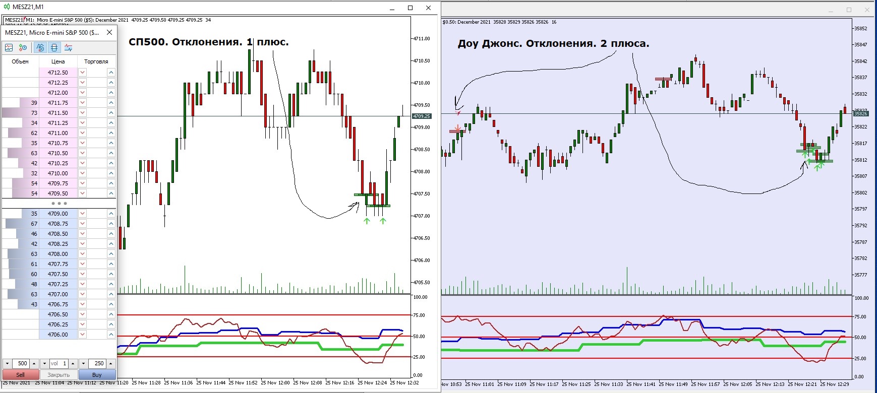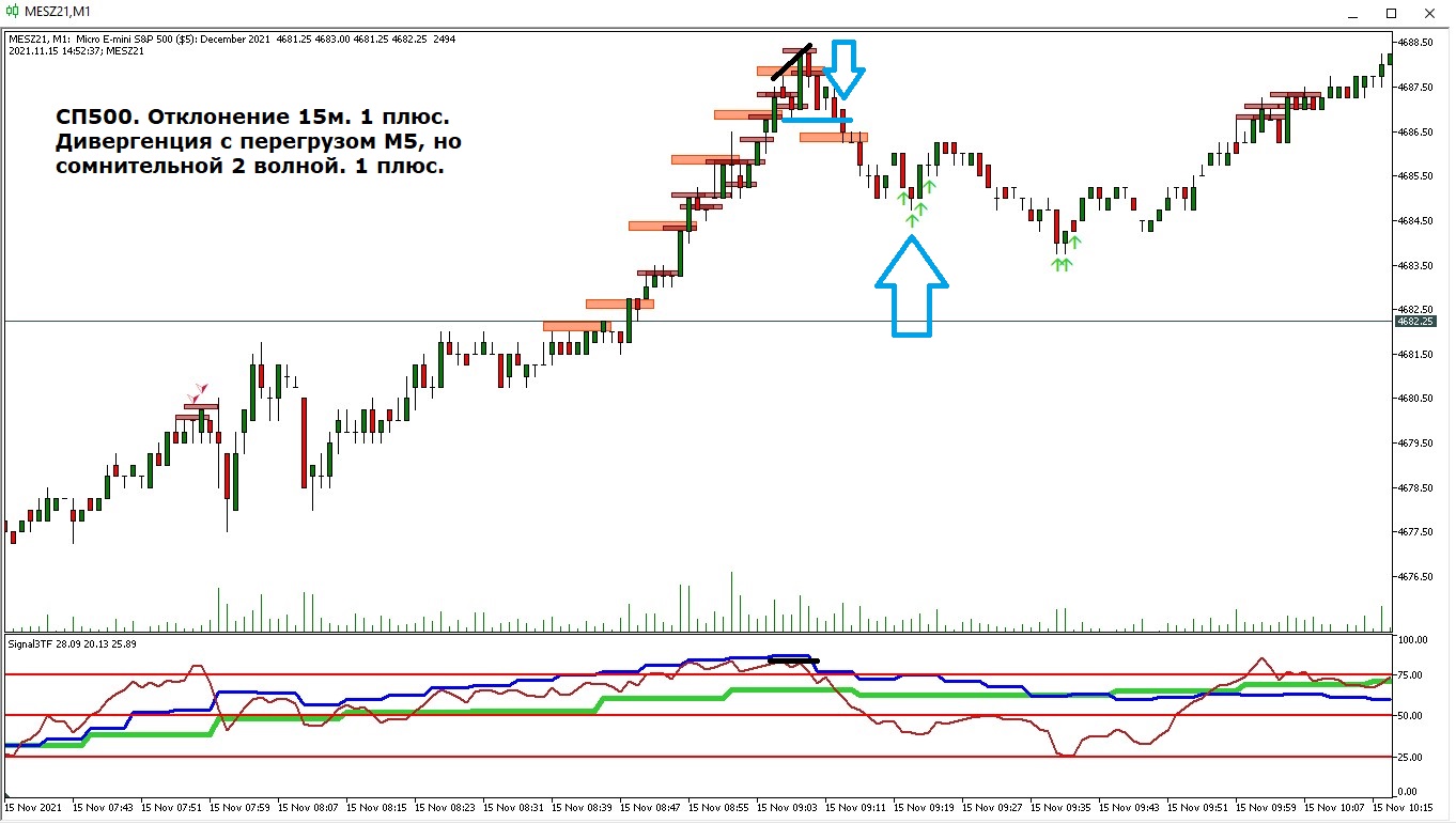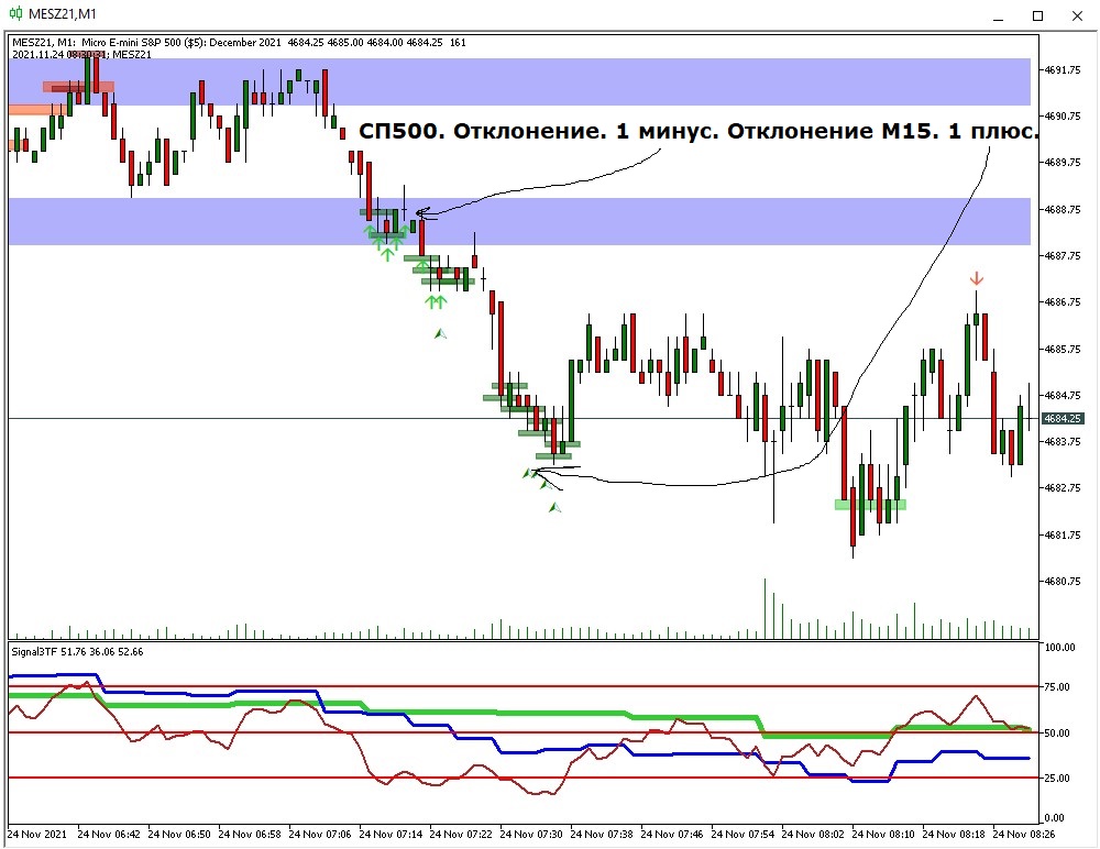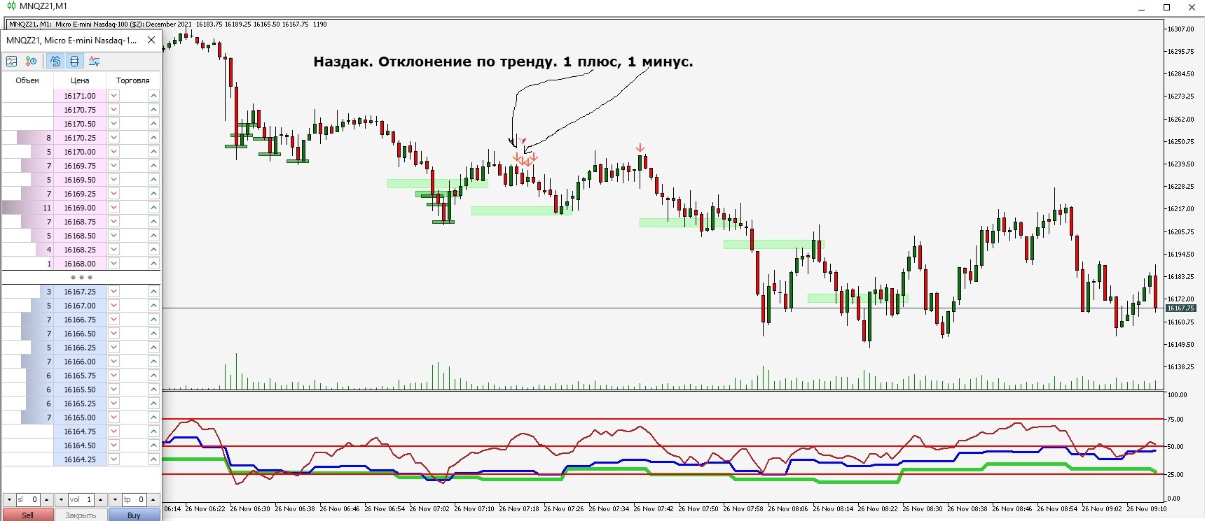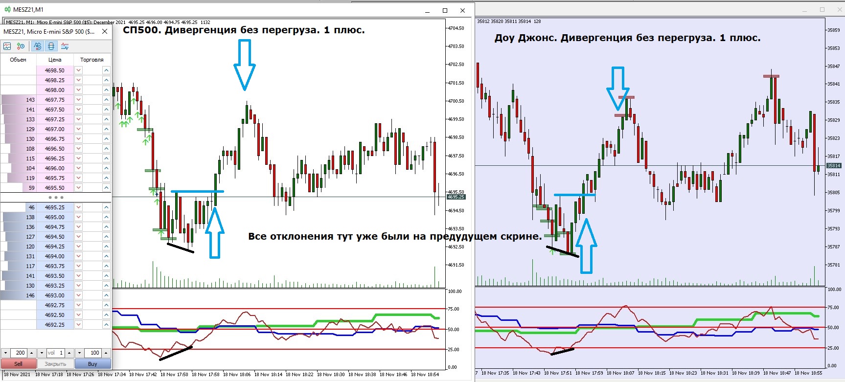 Я делаю проверку сигналов на истории за прошлый день, чтобы было легче по итогам принимать решение на входы по стратегии. Пока торгую редко по разным причинам. Провожу тестирование на трёх микро инструментах: Наздак, СП500 и Доу Джонс по двум стратегиям с 8 до 20ч. по терминальному времени по следующим правилам. 1. Отклонения. Беру все отклонения. Вход на открытии первой свечи после сигнала (стрелка и полоска). Тейк 5$, стоп 10$. Больше двух отклонений в одной непрерывной серии не беру. Если не понятно, по истории на минутках, что было раньше стоп или тейк, этот сигнал пропускаю, но если он в серии, то считаю, что он был с 0 результатом, поэтому в этой серии беру ещё только один следующий сигнал. 2. Дивергенция. Считаю все дивергенции в том числе и без перегруза, и с неявной 2 волной, и с явной 4 волной. Не считаю дивергенции, где по индикатору линия М1 ушла за 50% в промежутке между 1 и 3 волнами.