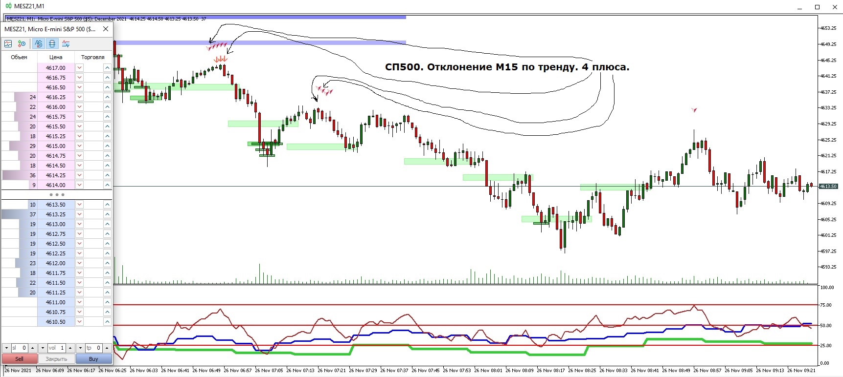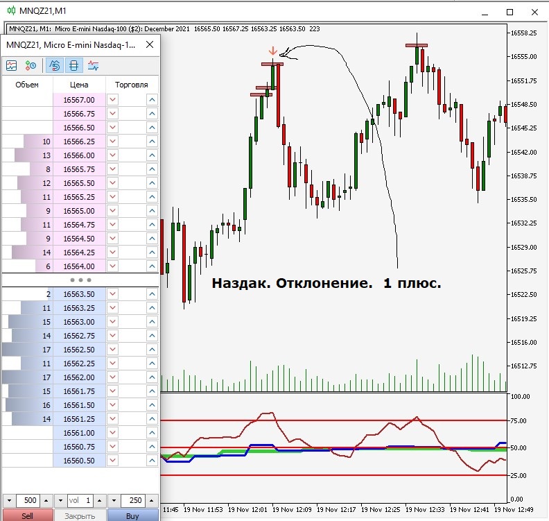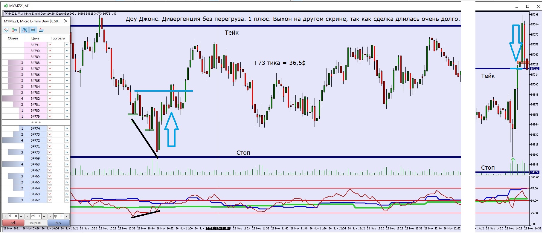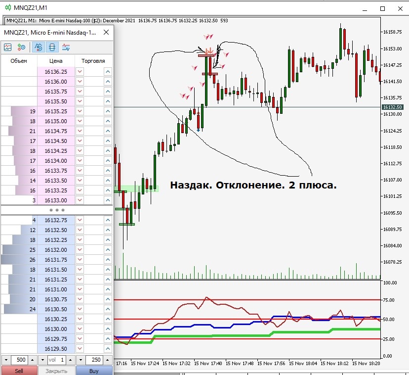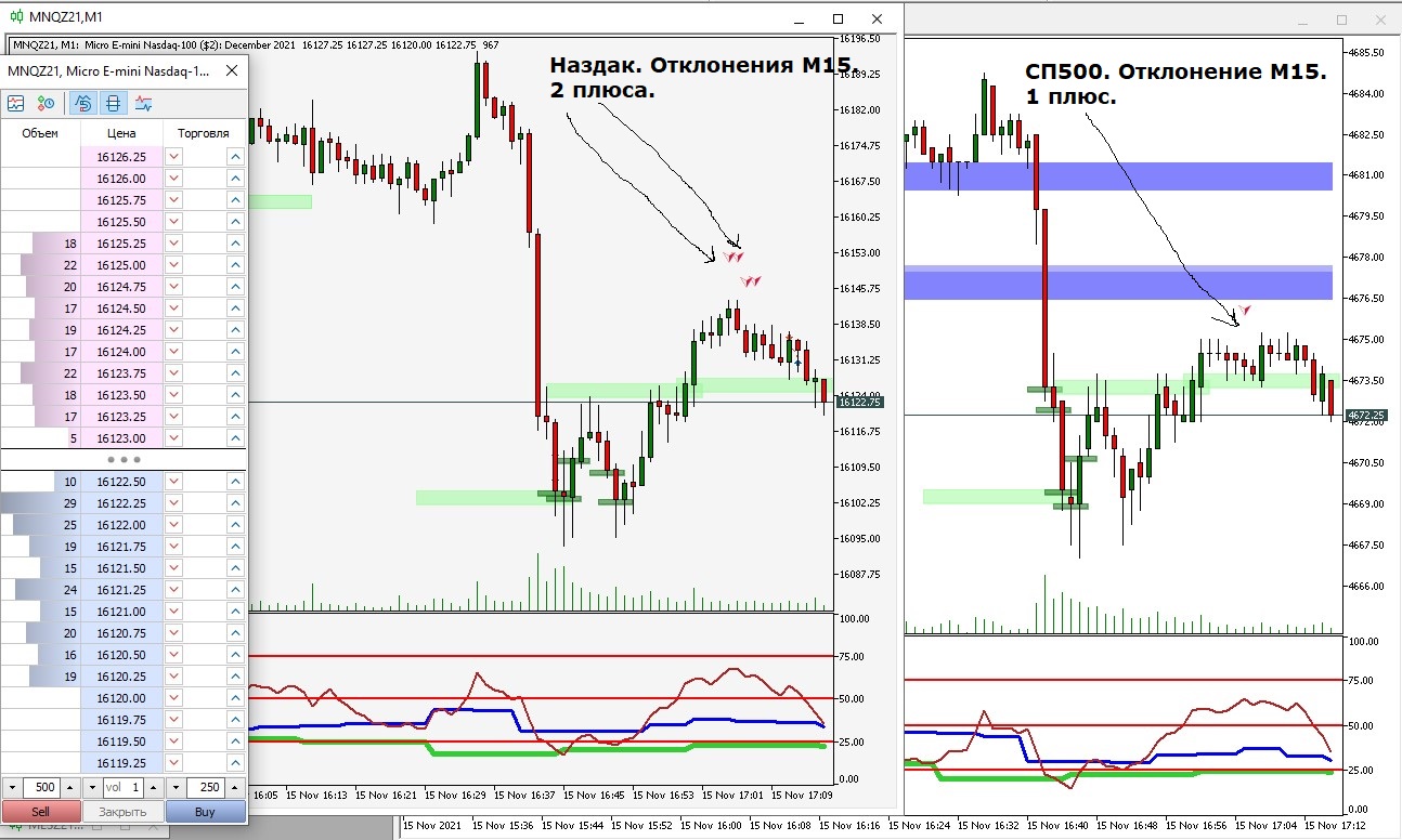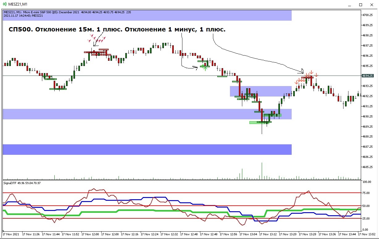 Я делаю проверку сигналов на истории за прошлый день, чтобы было легче по итогам принимать решение на входы по стратегии. Пока торгую редко по разным причинам. Провожу тестирование на трёх микро инструментах: Наздак, СП500 и Доу Джонс по двум стратегиям с 8 до 20ч. по терминальному времени по следующим правилам. 1. Отклонения. Беру все отклонения. Вход на открытии первой свечи после сигнала (стрелка и полоска). Тейк 5$, стоп 10$. Больше двух отклонений в одной непрерывной серии не беру. Если не понятно, по истории на минутках, что было раньше стоп или тейк, этот сигнал пропускаю, но если он в серии, то считаю, что он был с 0 результатом, поэтому в этой серии беру ещё только один следующий сигнал. 2. Дивергенция. Считаю все дивергенции в том числе и без перегруза, и с неявной 2 волной, и с явной 4 волной. Не считаю дивергенции, где по индикатору линия М1 ушла за 50% в промежутке между 1 и 3 волнами.