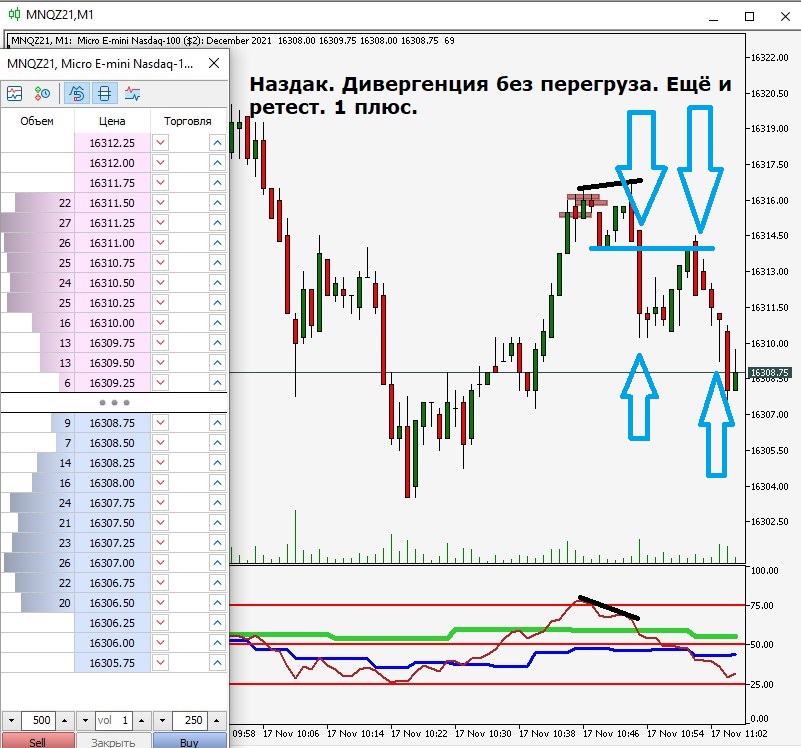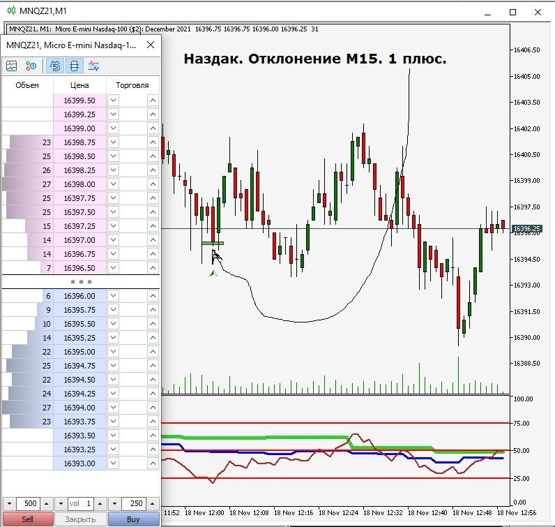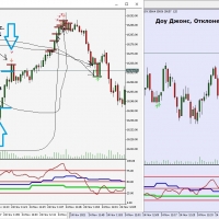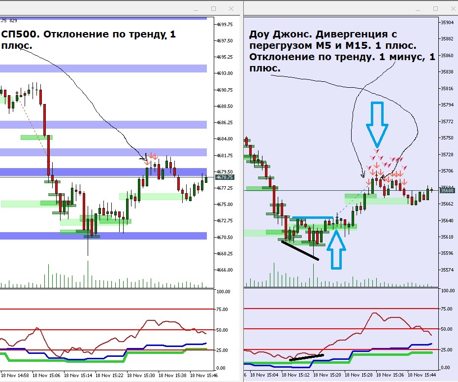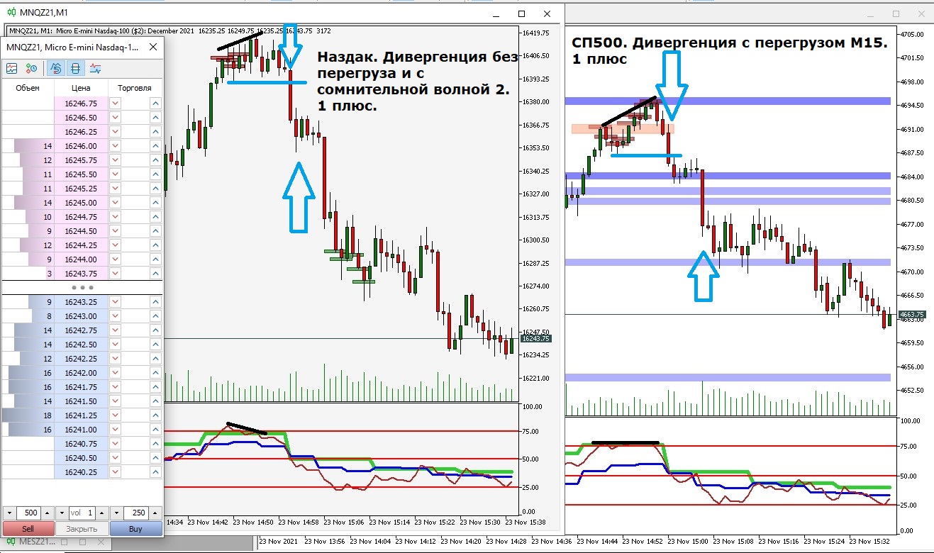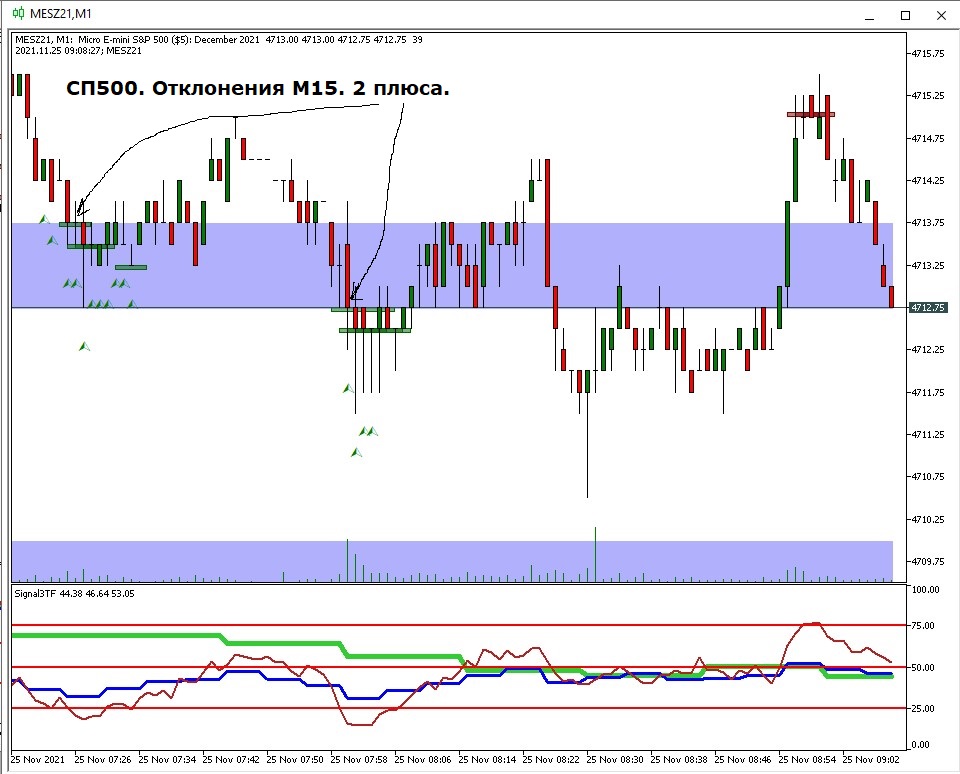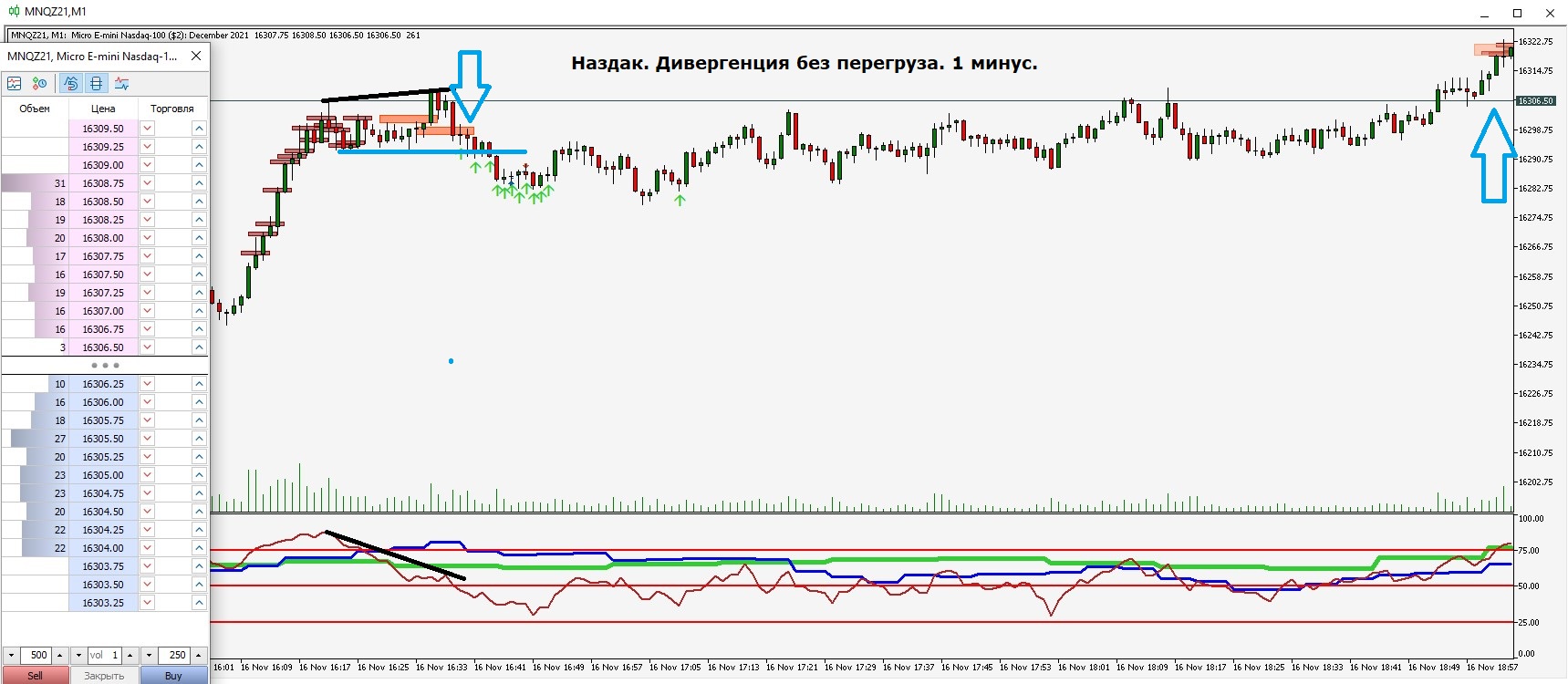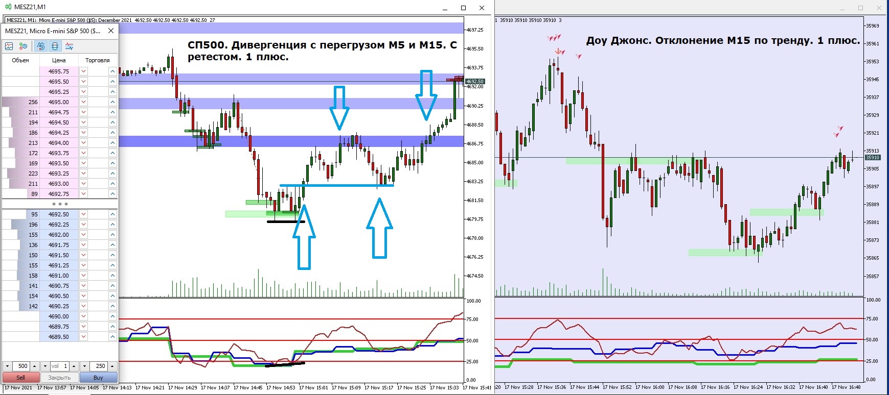 Я делаю проверку сигналов на истории за прошлый день, чтобы было легче по итогам принимать решение на входы по стратегии. Пока торгую редко по разным причинам. Провожу тестирование на трёх микро инструментах: Наздак, СП500 и Доу Джонс по двум стратегиям с 8 до 20ч. по терминальному времени по следующим правилам. 1. Отклонения. Беру все отклонения. Вход на открытии первой свечи после сигнала (стрелка и полоска). Тейк 5$, стоп 10$. Больше двух отклонений в одной непрерывной серии не беру. Если не понятно, по истории на минутках, что было раньше стоп или тейк, этот сигнал пропускаю, но если он в серии, то считаю, что он был с 0 результатом, поэтому в этой серии беру ещё только один следующий сигнал. 2. Дивергенция. Считаю все дивергенции в том числе и без перегруза, и с неявной 2 волной, и с явной 4 волной. Не считаю дивергенции, где по индикатору линия М1 ушла за 50% в промежутке между 1 и 3 волнами.