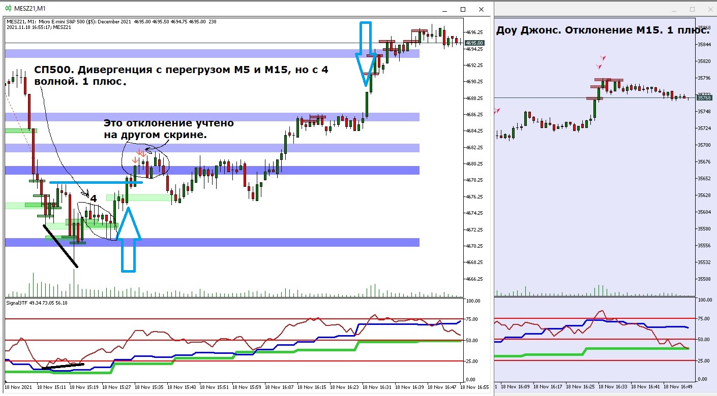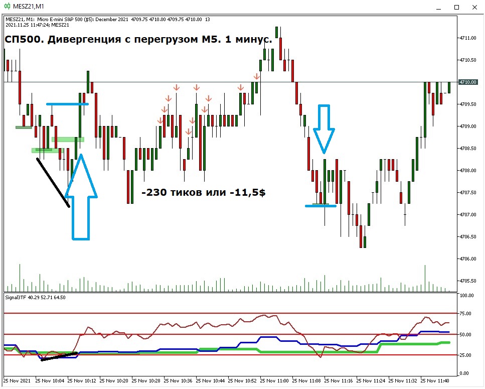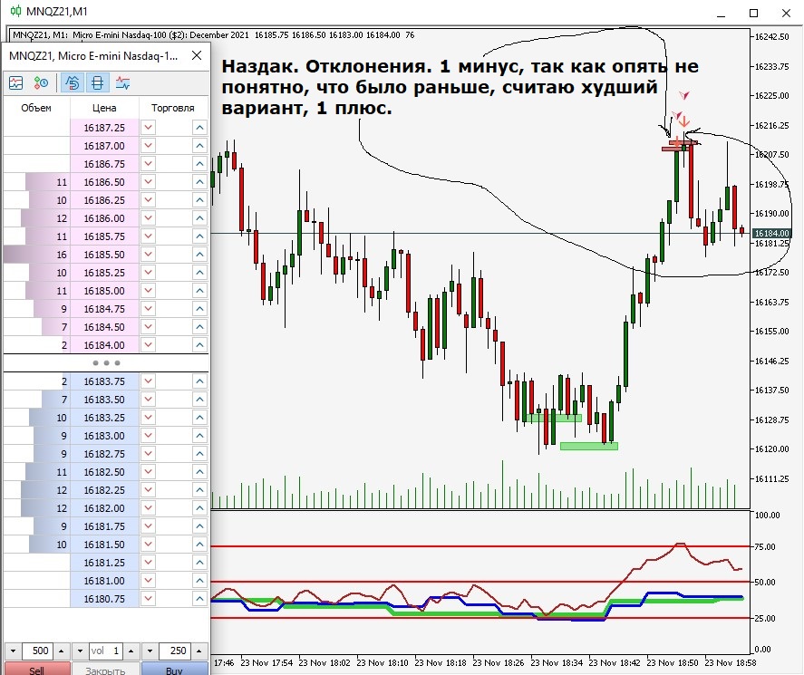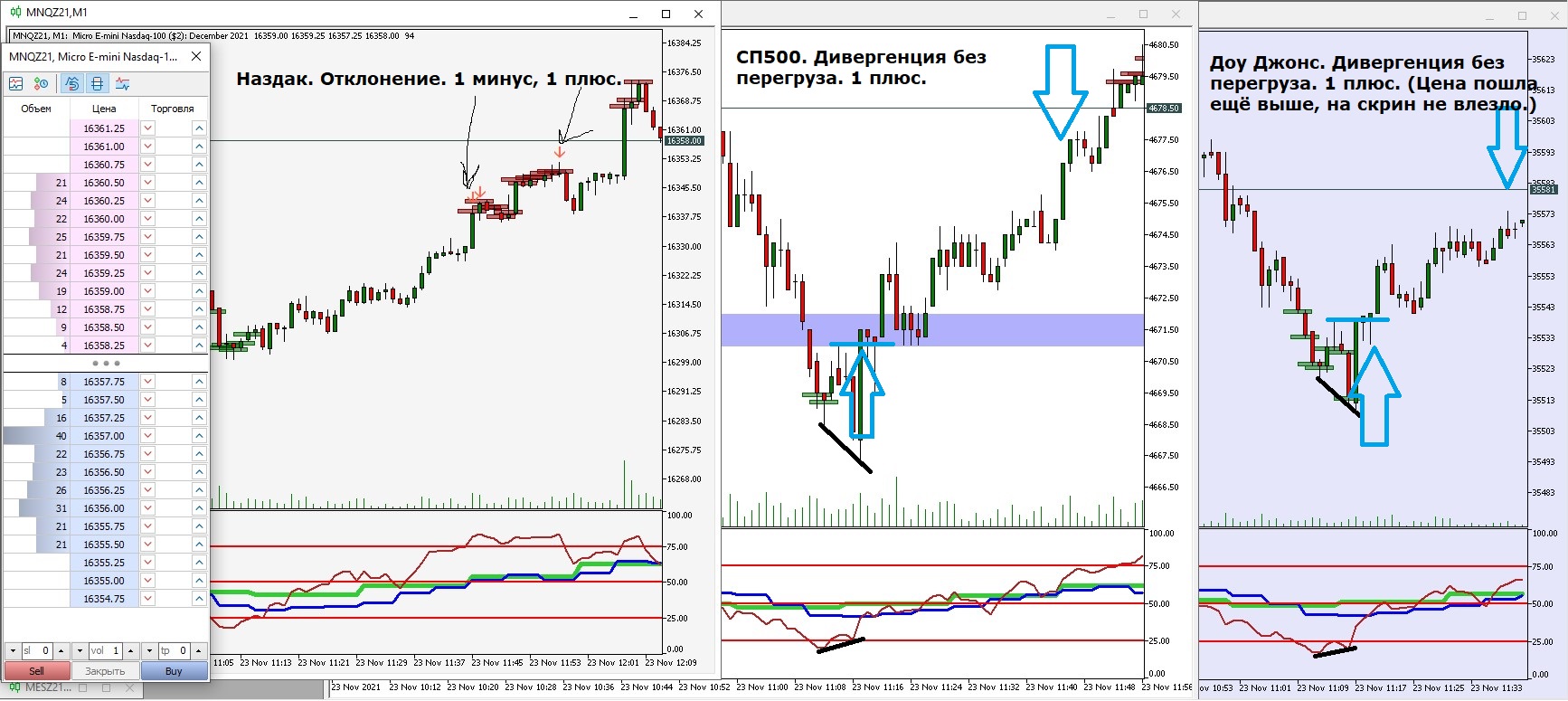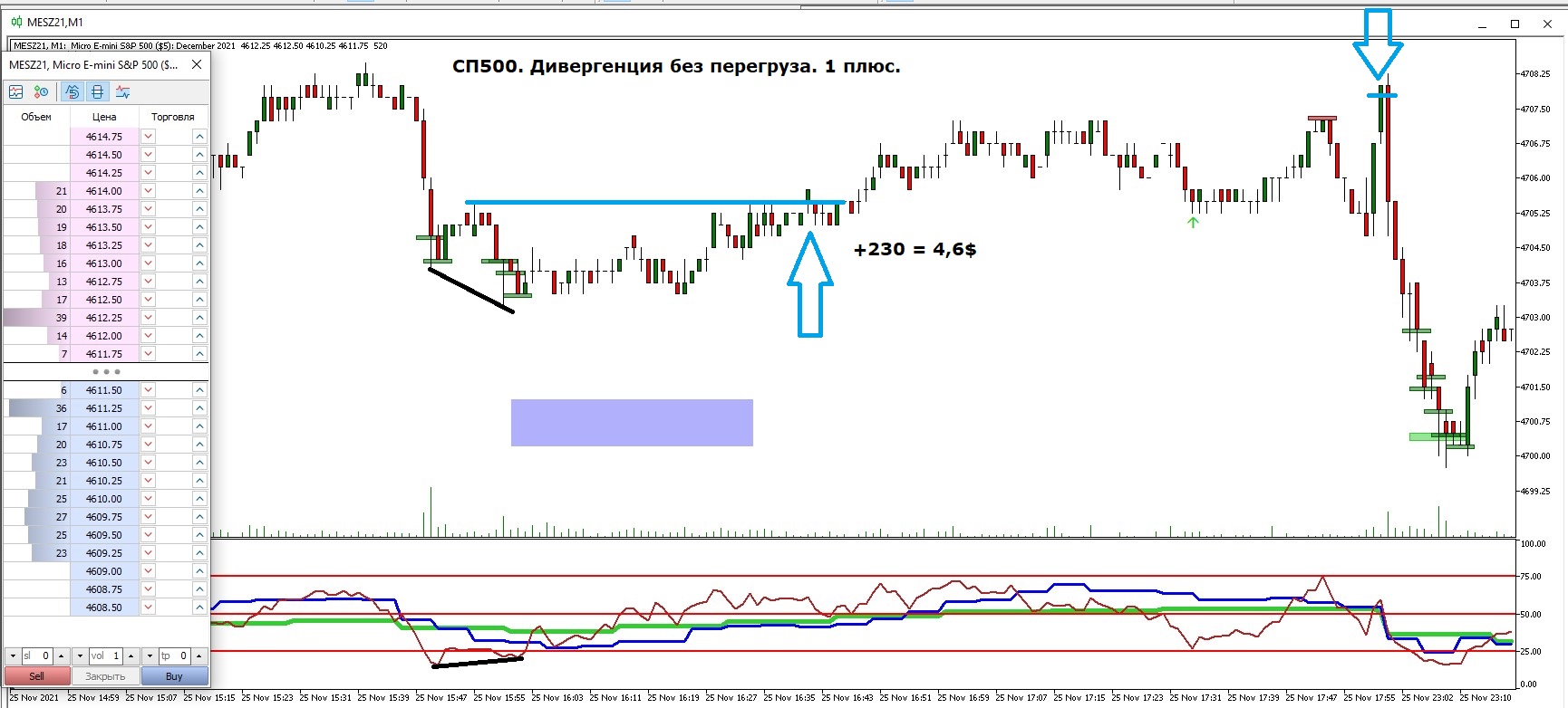 За 23.11.21. нашёл 9 плюсовых отклонений и 4 минусовых, причём из них 3 спорных то ли плюс, то ли минус. Итого получил бы в худшем случае плюс 5$. Дивергенции хотя и все не по стратегии, но получил бы 6 плюсовых и 1 минусовую, правда не маленькую. Начну, пожалуй, подсчитывать и дивергенции в $.