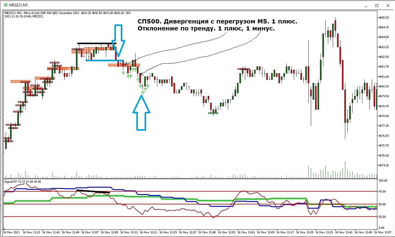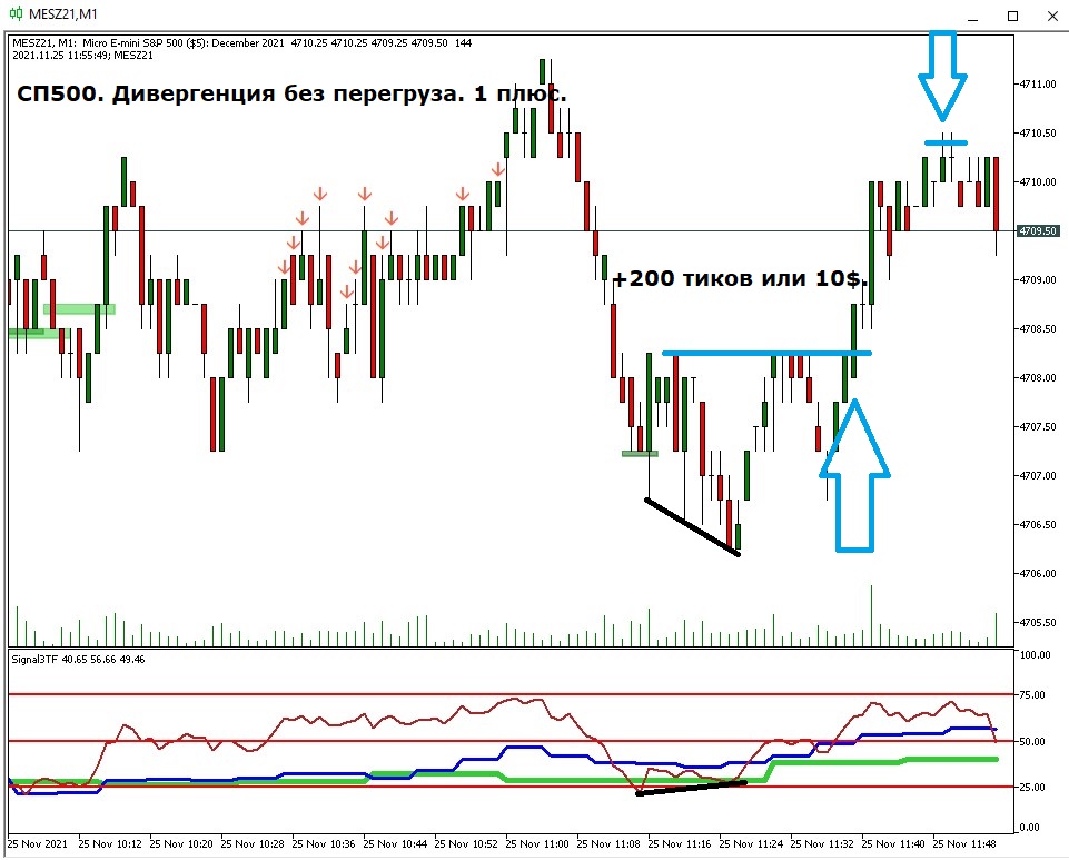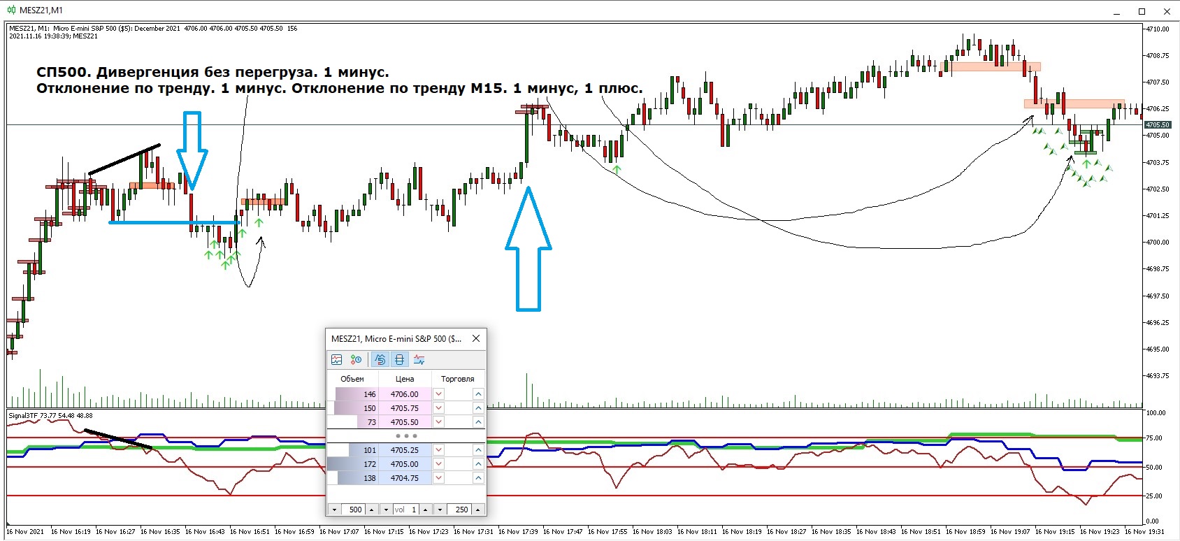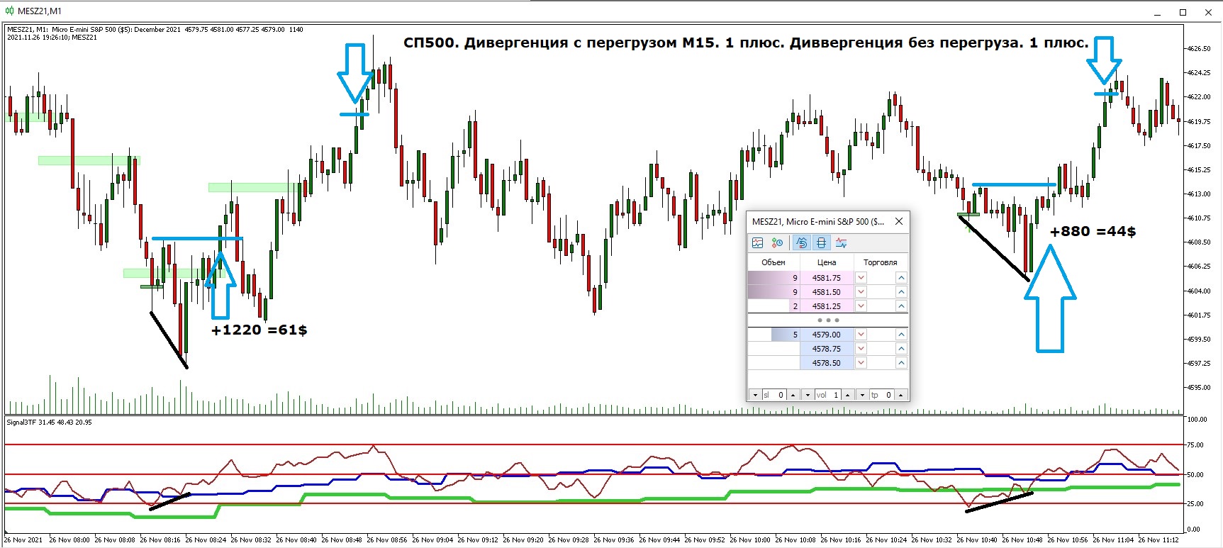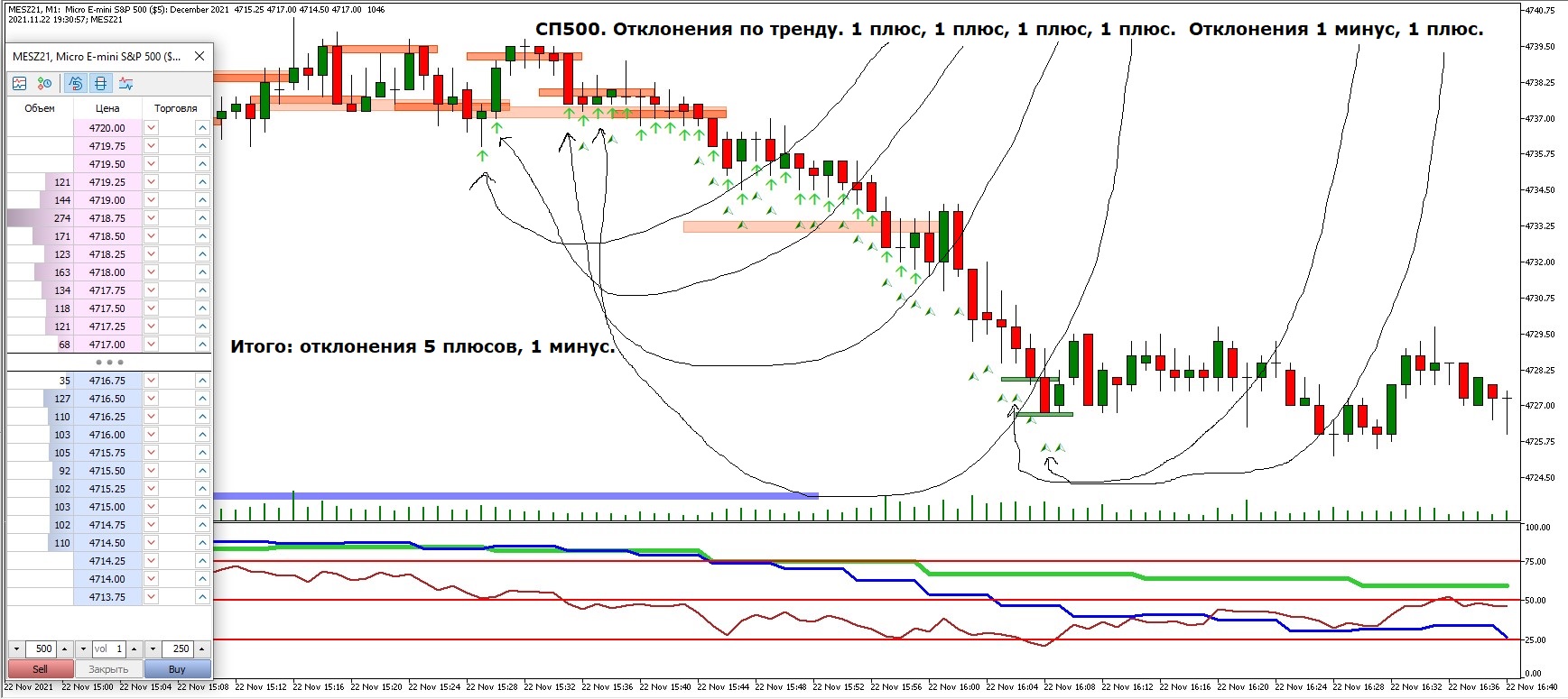 За 23.11.21. нашёл 9 плюсовых отклонений и 4 минусовых, причём из них 3 спорных то ли плюс, то ли минус. Итого получил бы в худшем случае плюс 5$. Дивергенции хотя и все не по стратегии, но получил бы 6 плюсовых и 1 минусовую, правда не маленькую. Начну, пожалуй, подсчитывать и дивергенции в $.