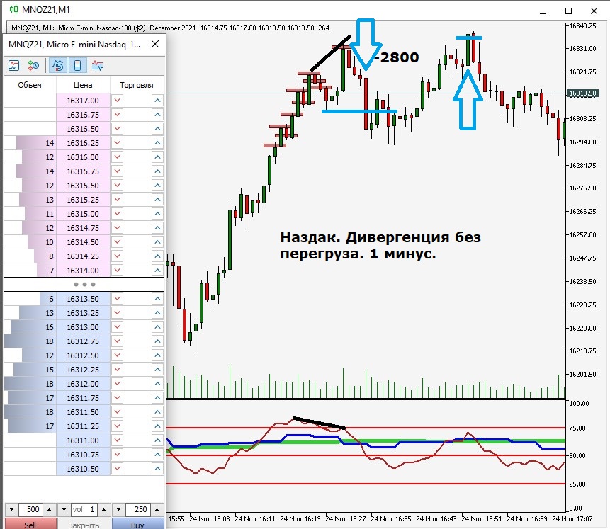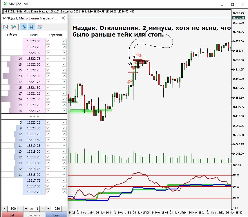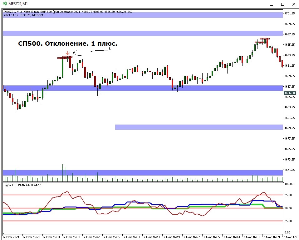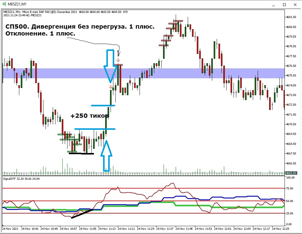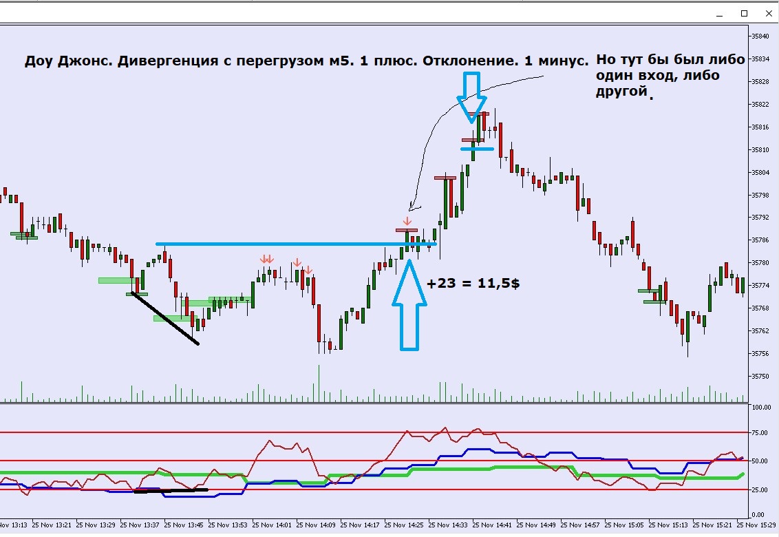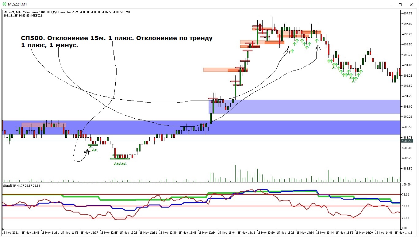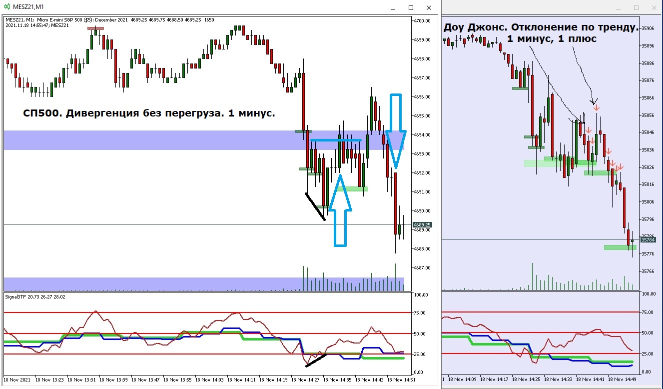 За 23.11.21. нашёл 9 плюсовых отклонений и 4 минусовых, причём из них 3 спорных то ли плюс, то ли минус. Итого получил бы в худшем случае плюс 5$. Дивергенции хотя и все не по стратегии, но получил бы 6 плюсовых и 1 минусовую, правда не маленькую. Начну, пожалуй, подсчитывать и дивергенции в $.