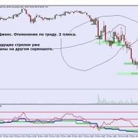 За вчерашний день можно было входить по отклонениям 10 раз из них было бы 7 плюсовых, 3 минусовых входа. Напоминаю, у меня тейк и стоп 1 к 2, то есть соответственно 5 и 10$, и не более 2 входов в одной серии непрерывных стрелок. Дивергенции рассматриваю с перегрузом и без. По дивергенциям было бы 2 плюсовых входа.