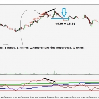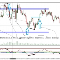 Вчера начал подсчитывать возможные доходы от дивергенции, но начало оказалось не удачным. Было 3 дивергенции без перегруза и хотя 2 сработали в плюс, но в денежном выражении получился убыток -7,5$. По отклонениям получился редкий кошмар 9 плюсовых и 10 минусовых. Так как тейк к стопу равен 1 к 2, то это ещё -55$.