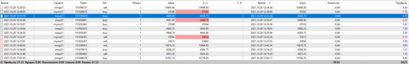 После первого занятия наступило просветление в мозгах, и вот сегодня уже не плохо получилось, +27 дол. Времени для торговли было мало, однако сделок получилось аж тринадцать. Я не всегда успевала делать скрины. Вот некоторые сделки: