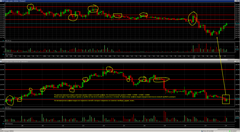 На данном скриншоте видны ключевые уровни в фоне (часовой график). Это психологические уровни 113000 - 114000 - 115000 - 116000