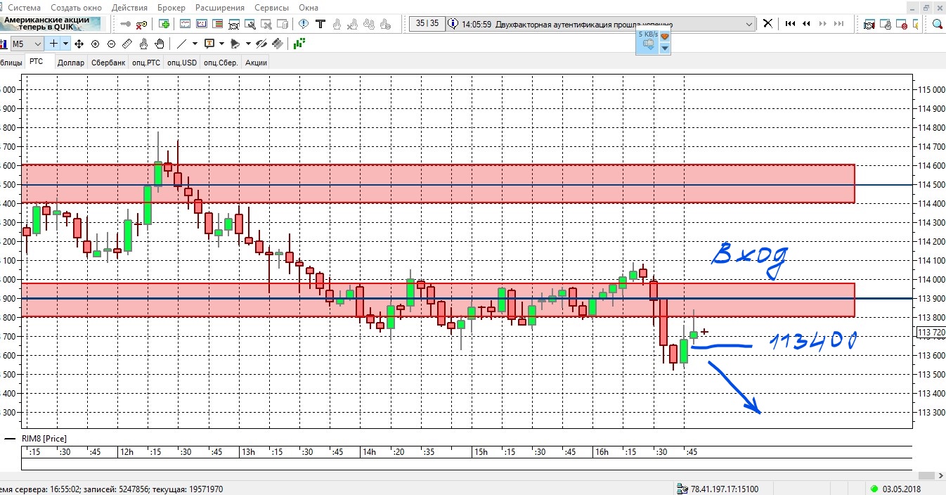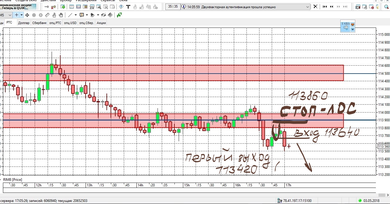 Вошёл на продажу 2 фьючерсами по лимиту на 113640,ставлю сразу стоп-лосс на 113860 и первый выход(покупка) первого фьючерса на уровень 113420.