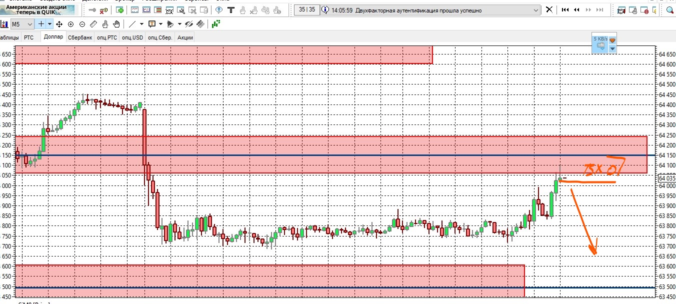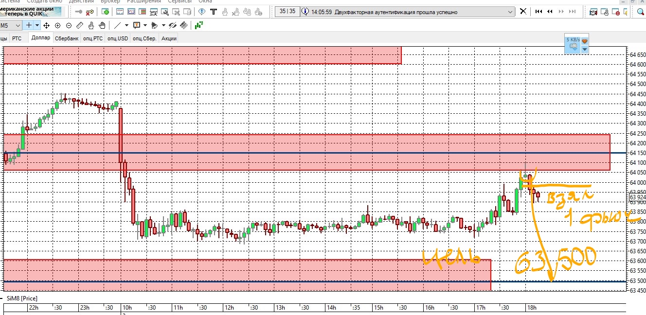 Сработал лимит по доллару на продажу 2 фьючерса вход 64022,стоп-лосс на 64101,на уровень риска 79 пунктов ставлю выход первого фьючерса-уровень 63942