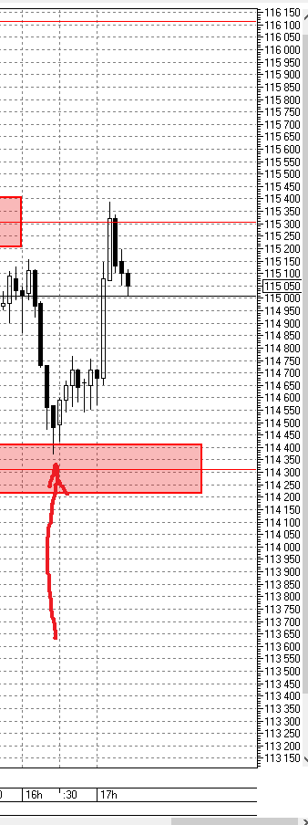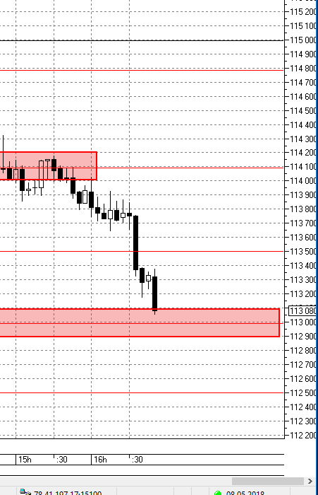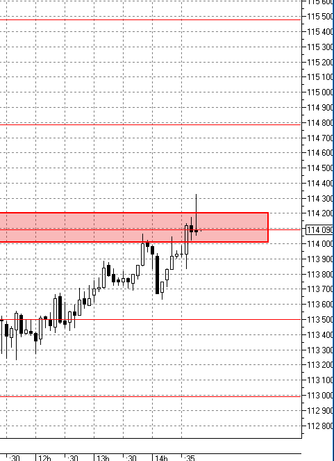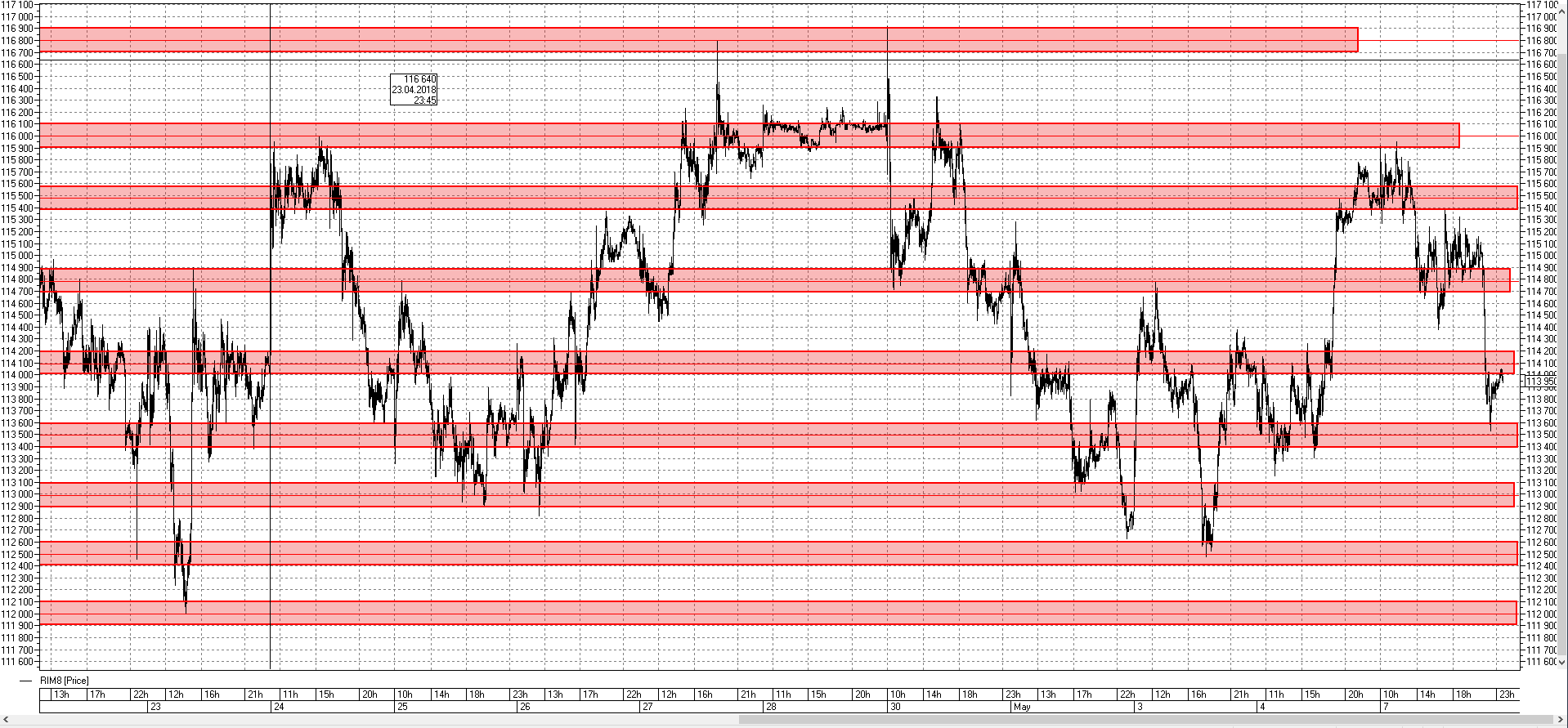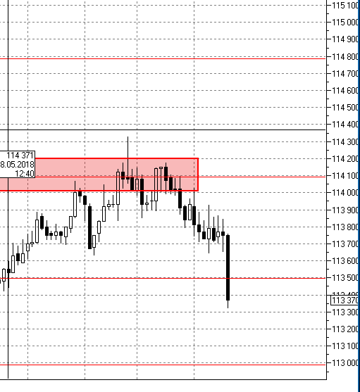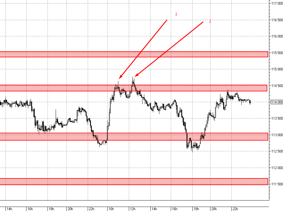 1. В 14:25 сформировался пин-бар на границе диапазона уровня, планируем вход на 113900.