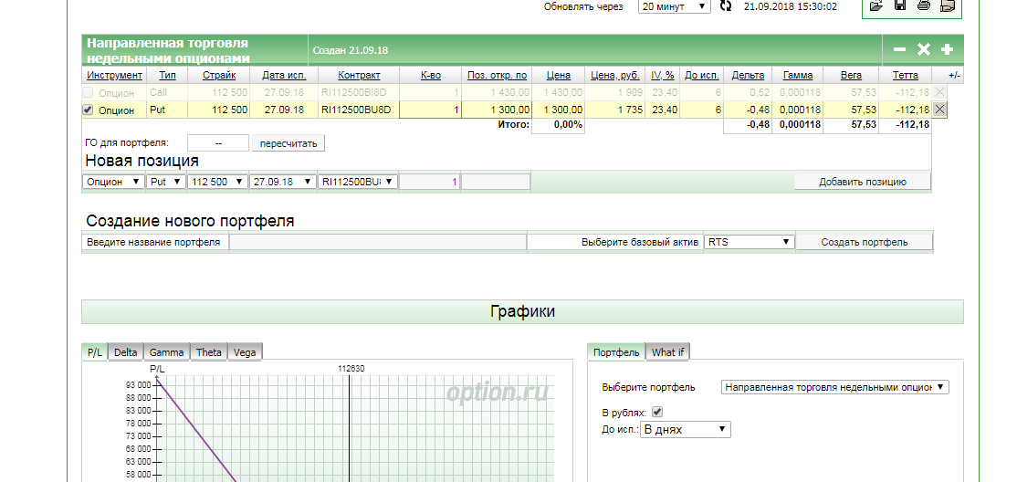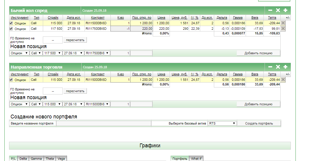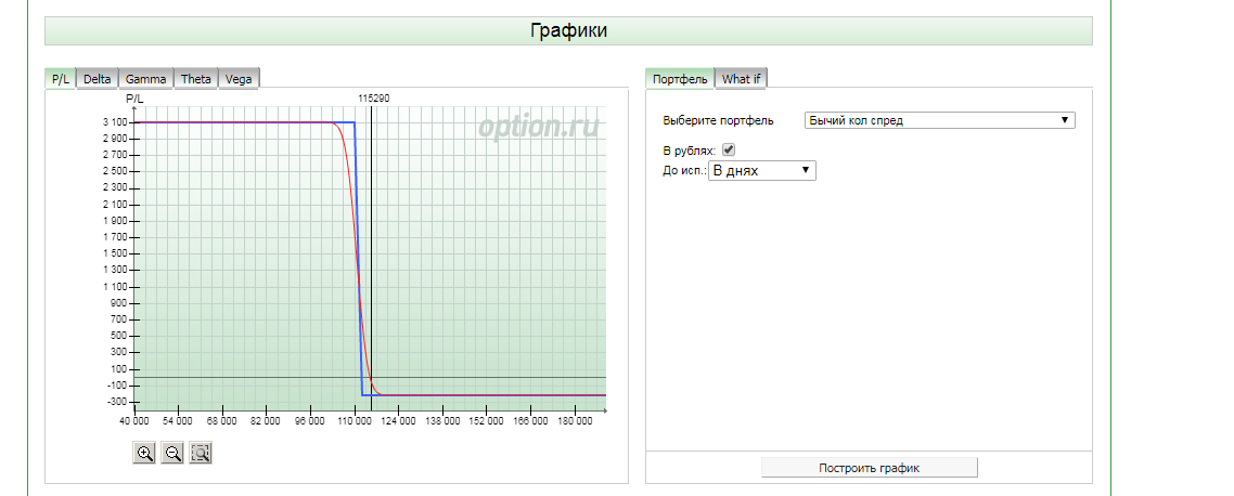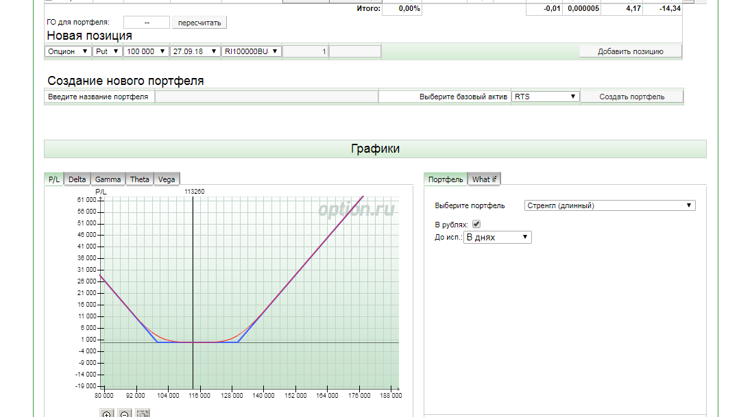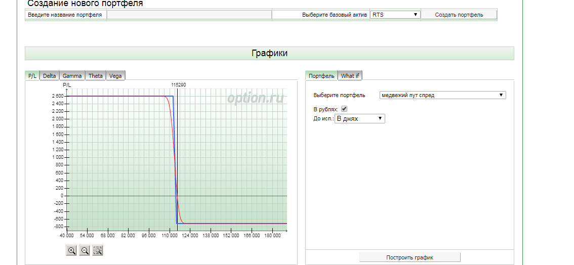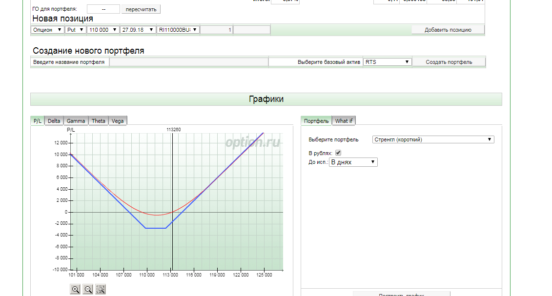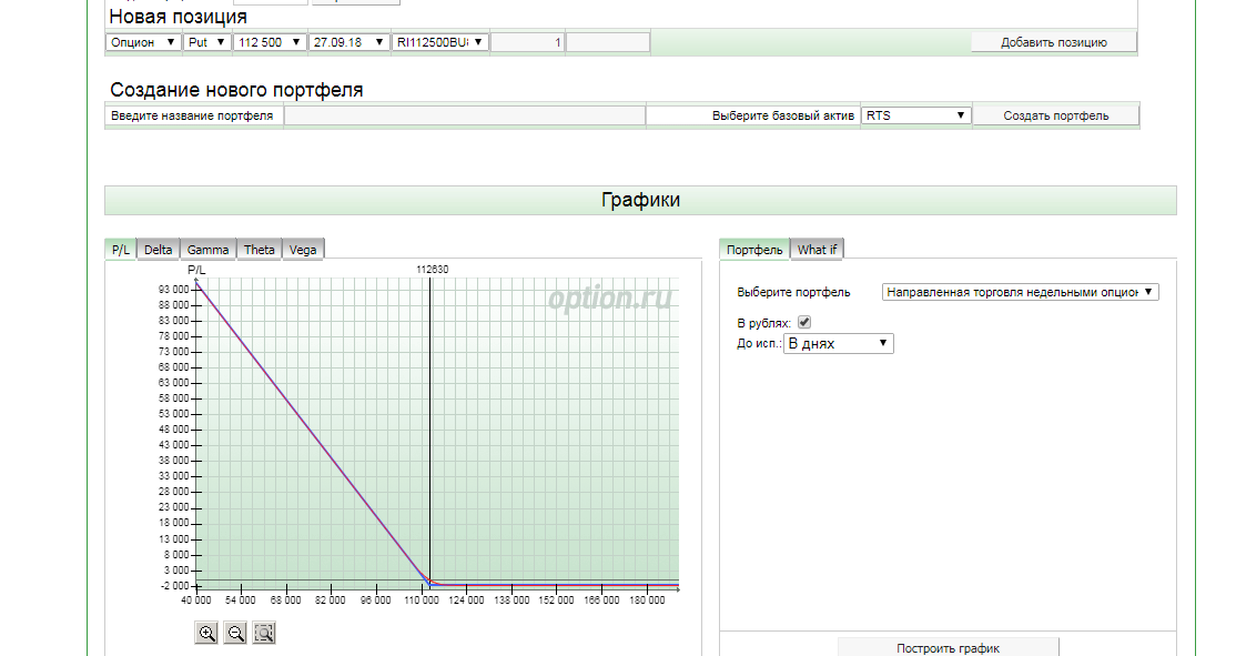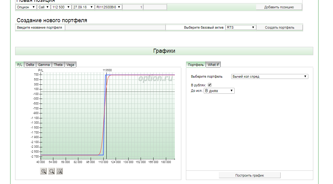Как построить график? Заполнил: выбрал инструмент - RTS, нажал - создать портфель, выбрал страйк текущий - 112500, выбрал срок экспирации - 27.09.2018. Нажимаю на - построить график - не отображает. Как построить график?