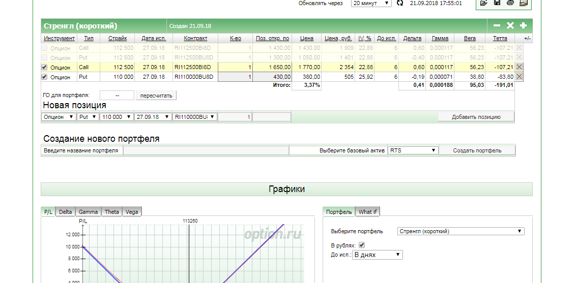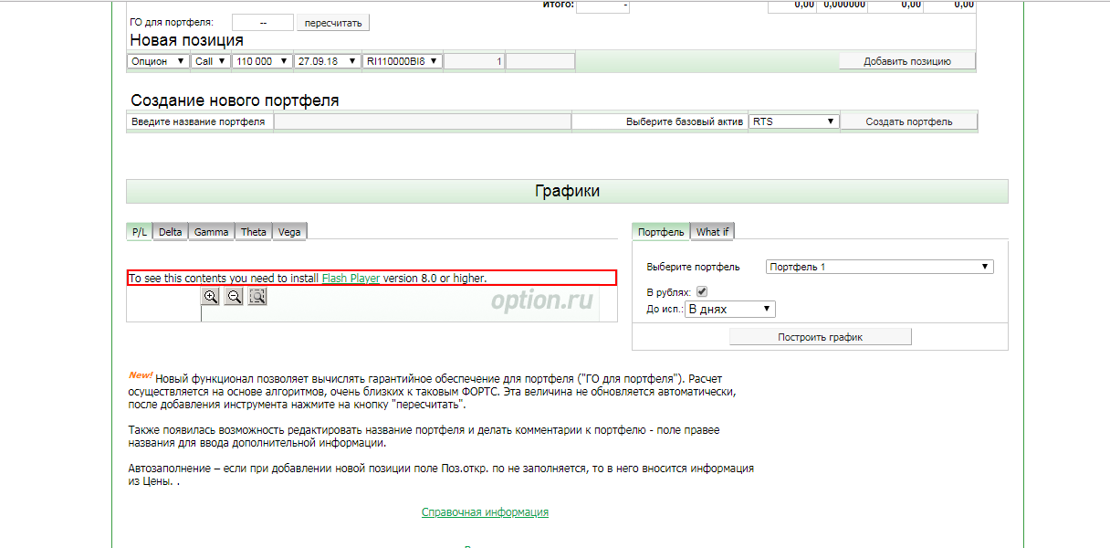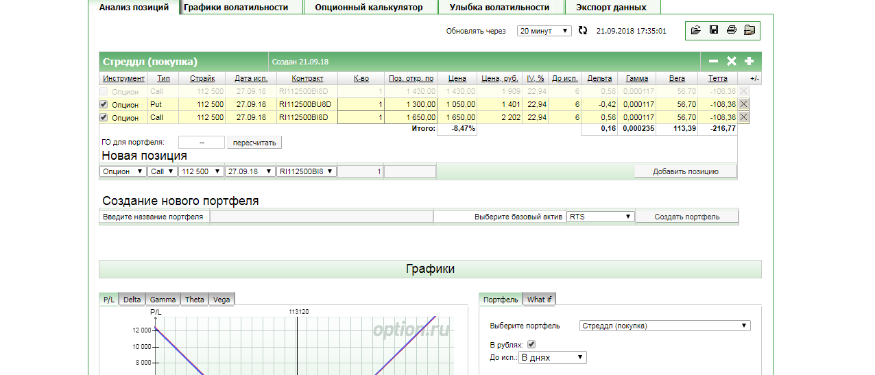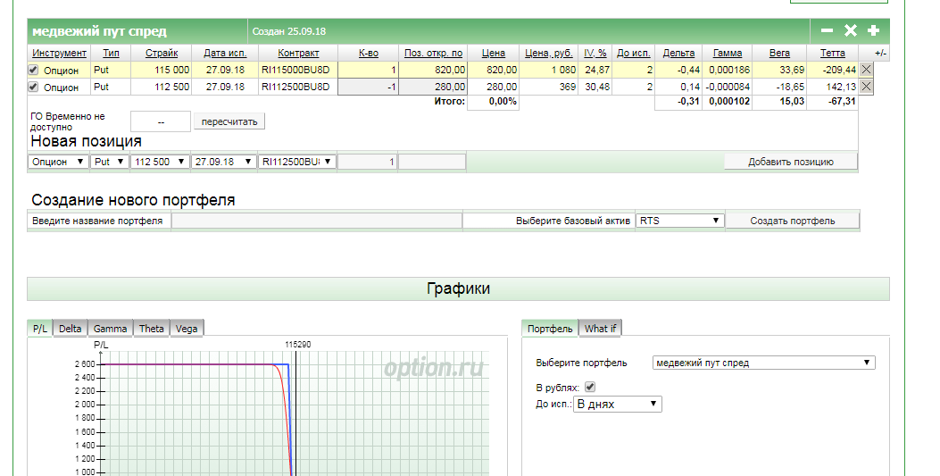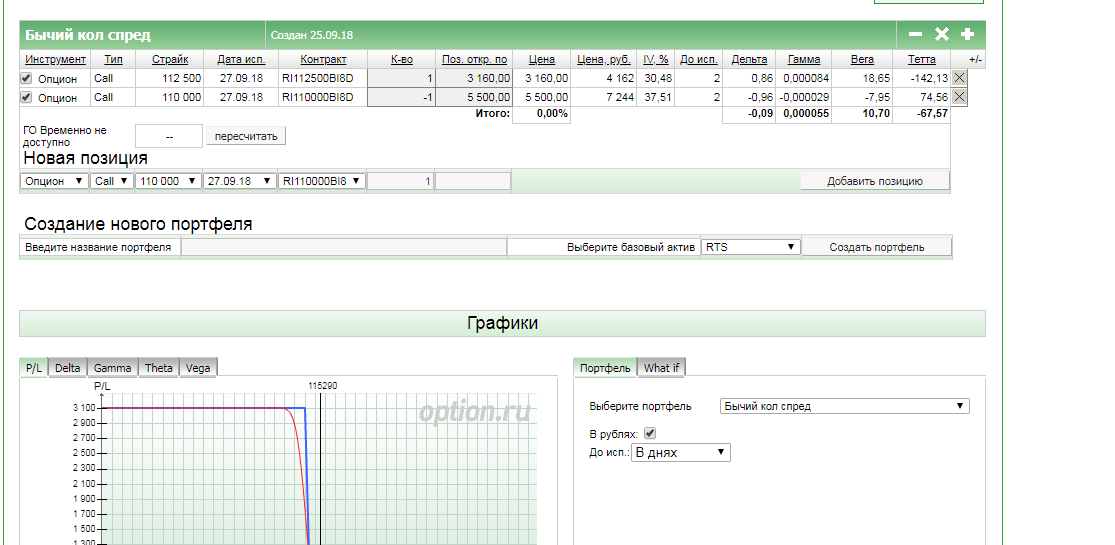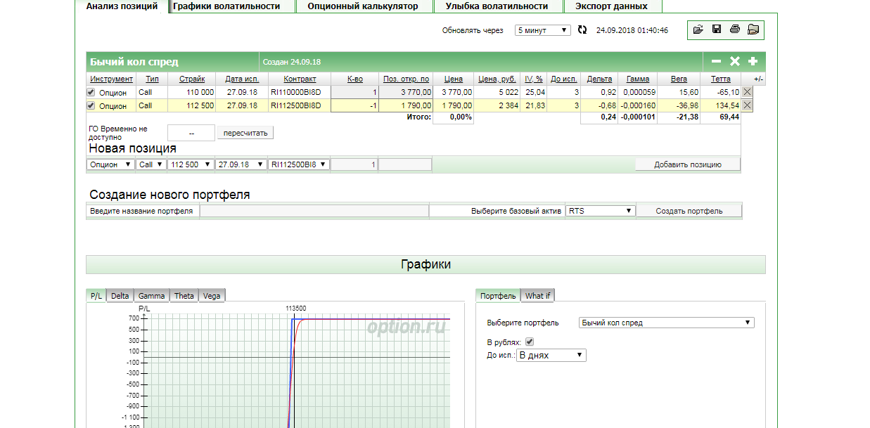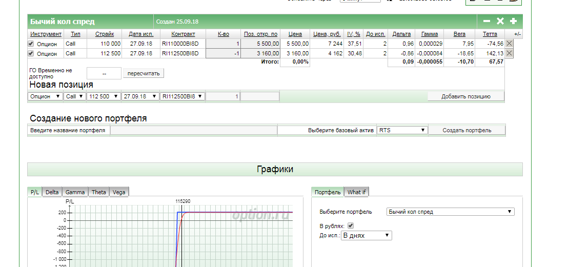 Как построить график? Заполнил: выбрал инструмент - RTS, нажал - создать портфель, выбрал страйк текущий - 112500, выбрал срок экспирации - 27.09.2018. Нажимаю на - построить график - не отображает. Как построить график?