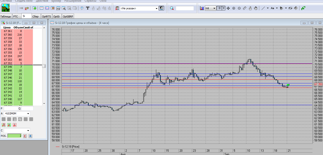 Зашел на покупку фьючерса двумя контрактами 67374. На ТФ4 на Si. На уровне 67122 произошел "неудавшийся размах" и появилась свеча "поглащение". стоп-лимит 66800, 2 тейк профит - 70500. 1ТП -68100.