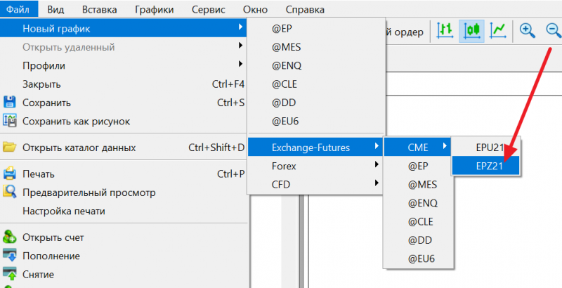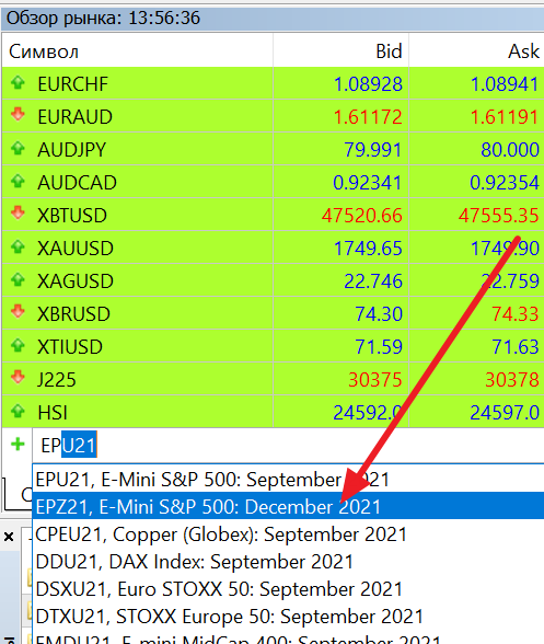 сейчас скрыта) в поле «Добавить» введите символ инструмента EPZ21 (или символ MESZ21, если вы работаете с микро контрактом) и нажмите клавишу enter.