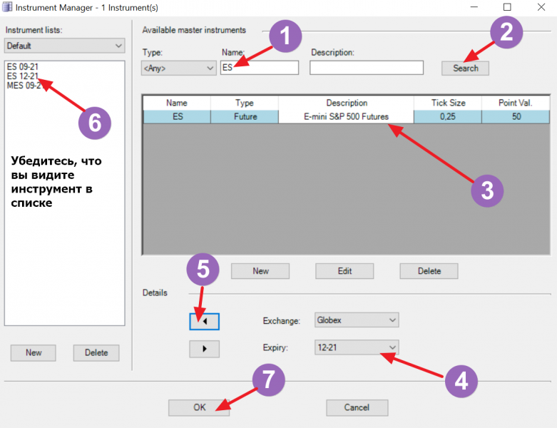 Далее в диалоговом окне выбрать инструмент ES 12-21 (или MES 12-21 если вы торгуете микро-контракт) и добавить его в список: