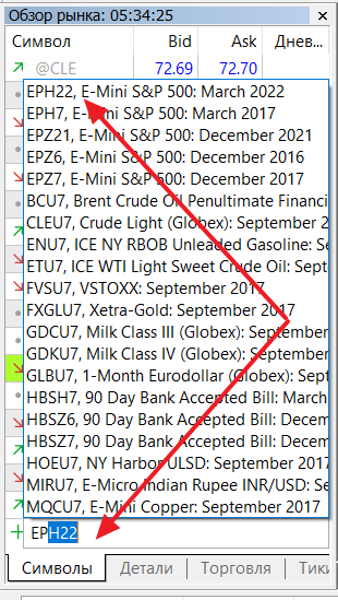 В мартовском контракте код Z сменится на H, год на 22, а символ EP останется прежним. Мы получим: EPH22 — это мини фьючерс. MESH22 — это микро фьючерс.