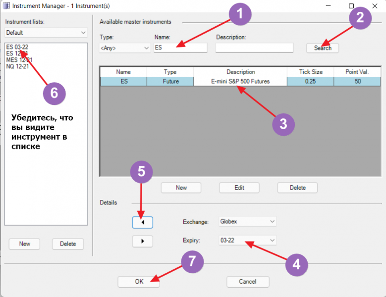 Далее в диалоговом окне выбрать инструмент ES 03-22 (или MES 03-22 если вы торгуете микро-контракт) и добавить его в список: