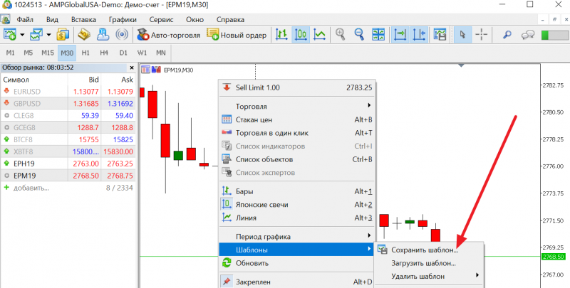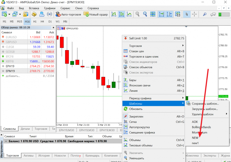 4. Загрузите настроенный ранее шаблон графика: клик правой кнопкой мыши на свободном поле → Шаблоны → выбрать сохраненный ранее шаблон