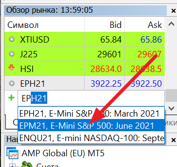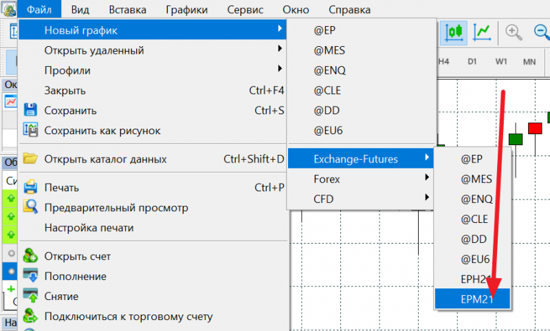 В мартовском контракте код Z сменится на H, год на 21, а символ останется прежним. Мы получим: EPH21 — это мини фьючерс. MESH21 — это микро фьючерс.