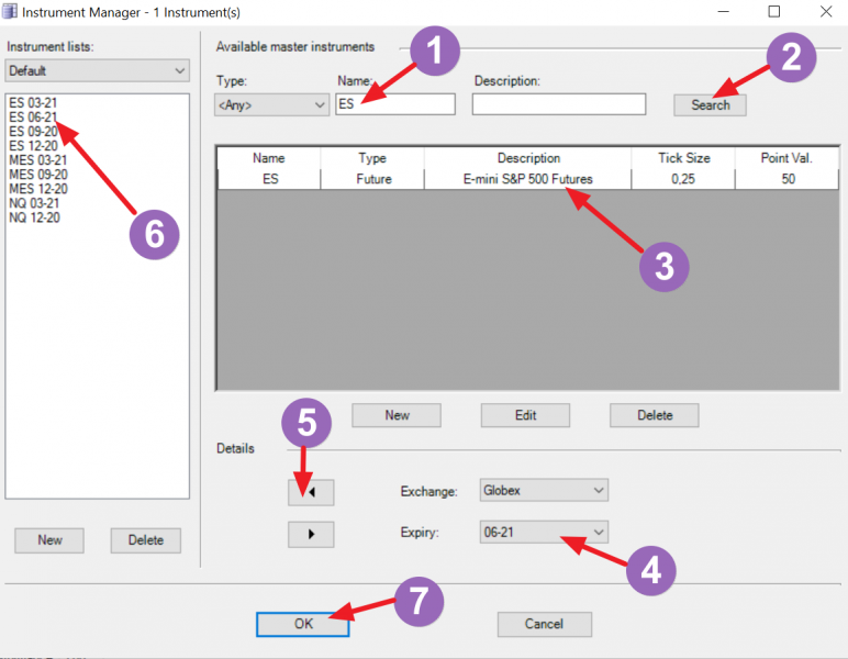Далее в диалоговом окне выбрать инструмент ES 06-21 (или MES 06-21 если вы торгуете микро-контракт) и добавить его в список: