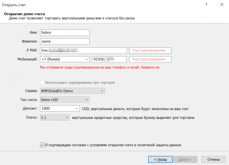 Открываю демо-счет на евроМТ-5, просит подтверждения с эл. почты и телефона. При этом код на почту приходит, а на телефон нет. И что делать?
