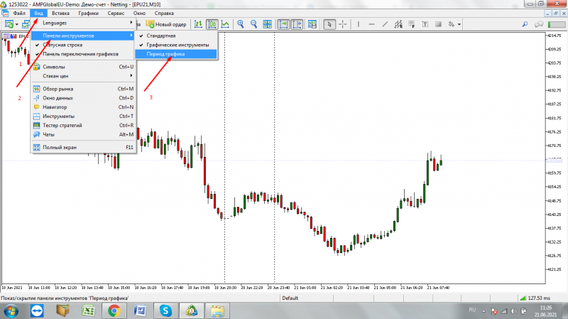 Здравствуйте! Установила терминал и график. Но чет нет панельки с периодами и другими вкладками