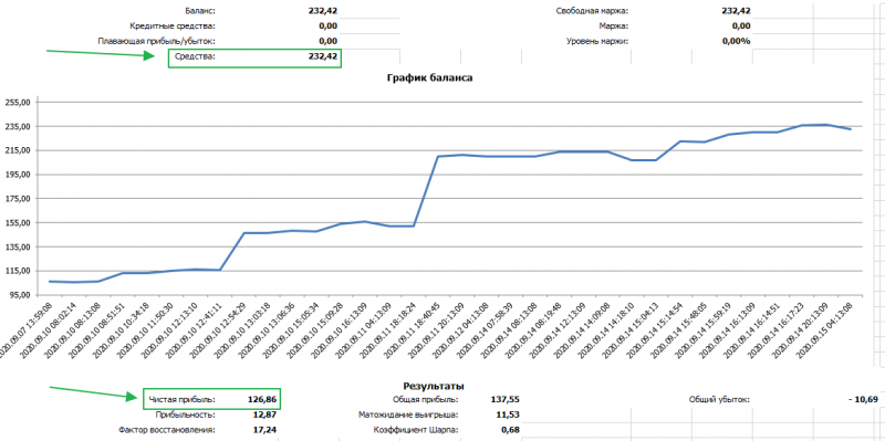 А так выглядит кривая доходности за 3 дня. Да, сделки совершались всего 3 дня, а прибыль составила около 120%!