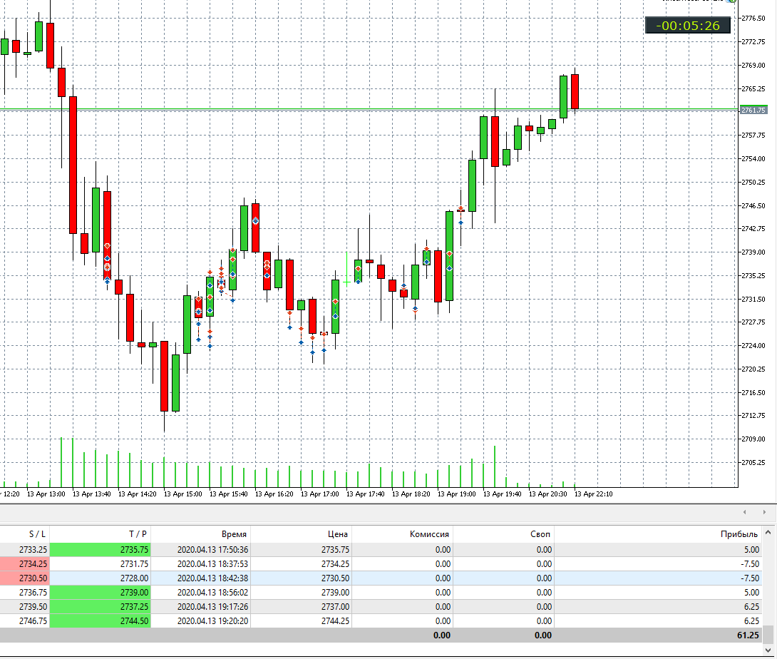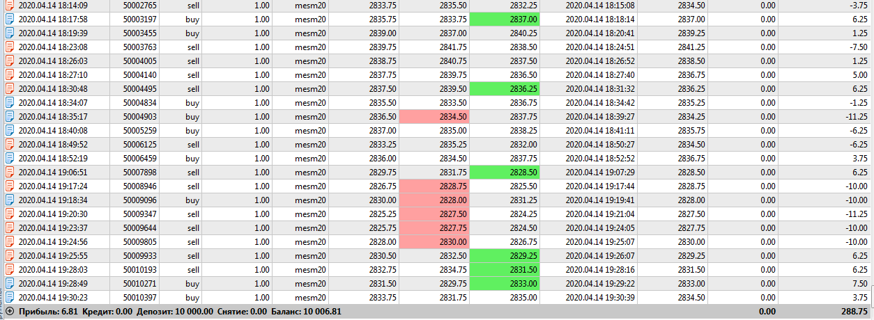 в понедельник провел первую пробу но ...какие там 2-3 сделки и хорош! это же скальпинг: все сделки по нескольку секунд! Правда, сильно не спешил, но за весь вечер сделок полно, но по правилам, и прибыль в $61, в минус не уходил, но откаты так же есть