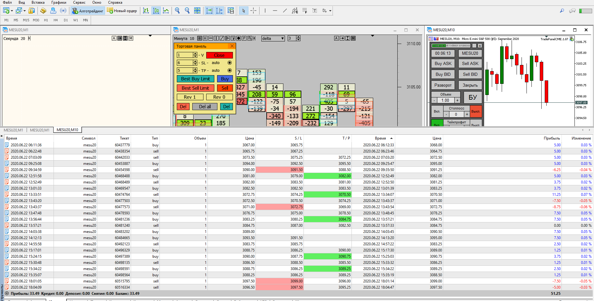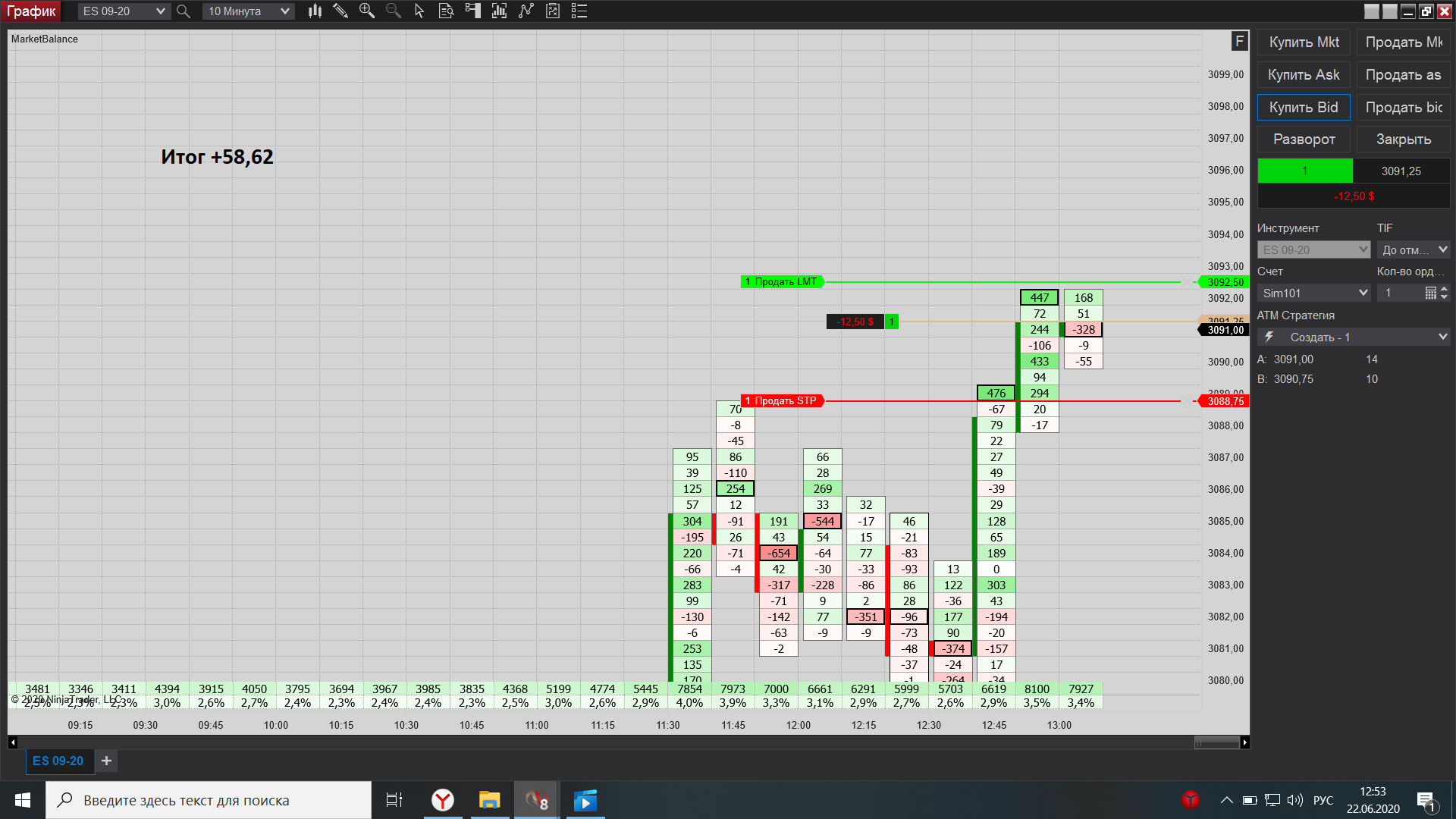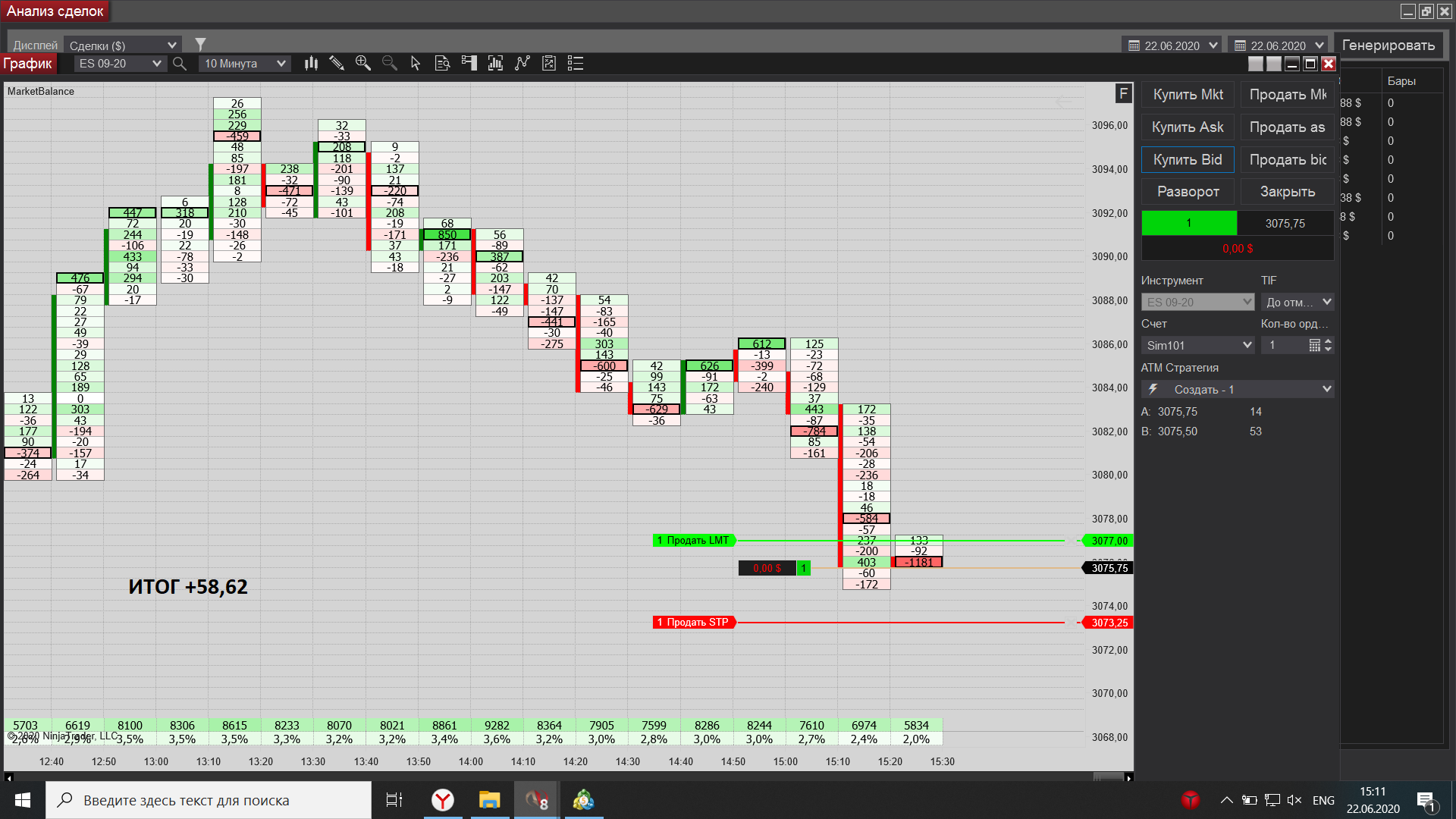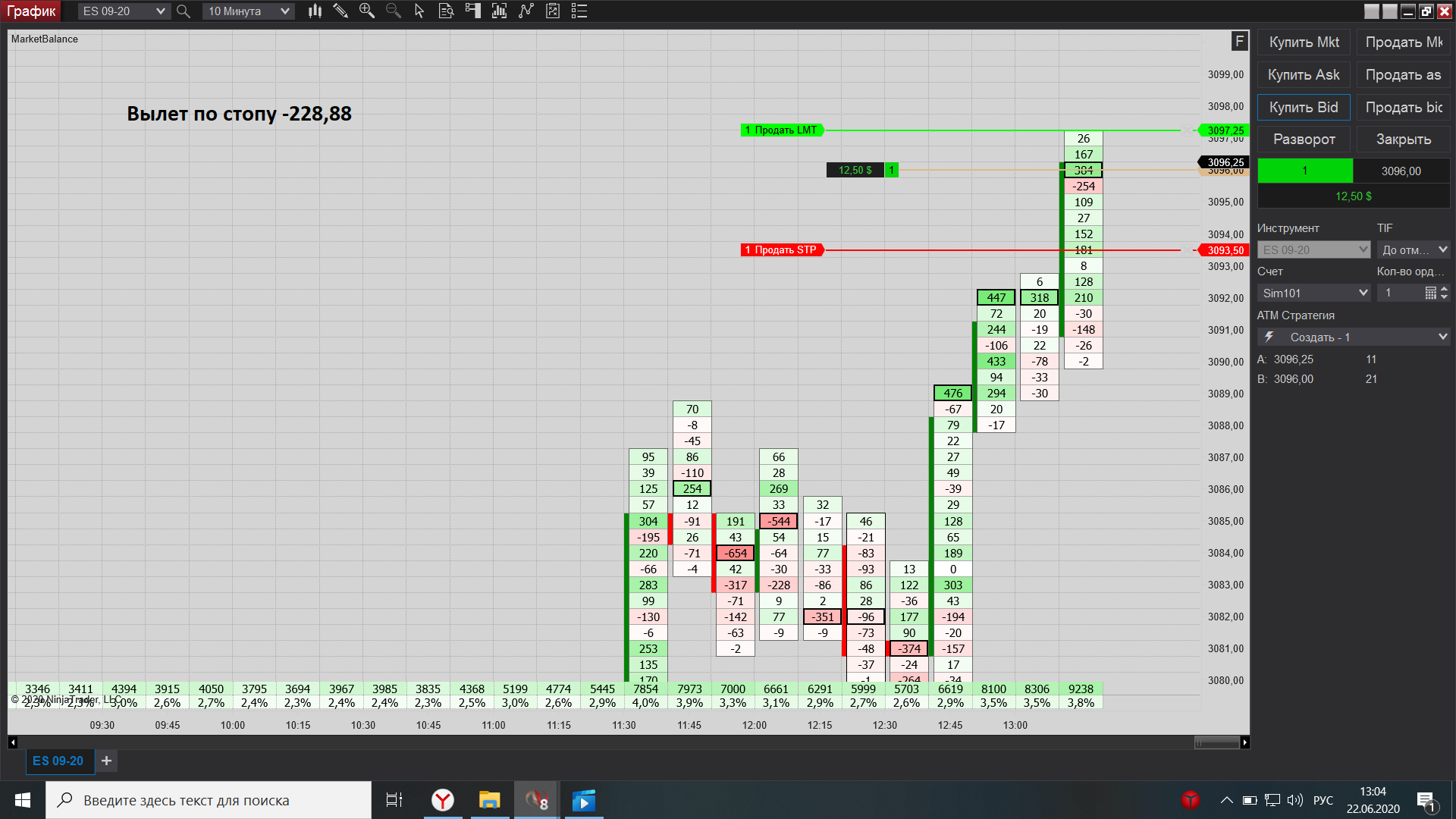 Евгений выкладываю свою торговлю за сегодня, как договаривались на вэбинаре, начиная с америки подключил истинный футпринт, он значительно лучше показывает места остановки, что значительно увеличило кол-во прибыльных сделок по сравнению с убыточными.