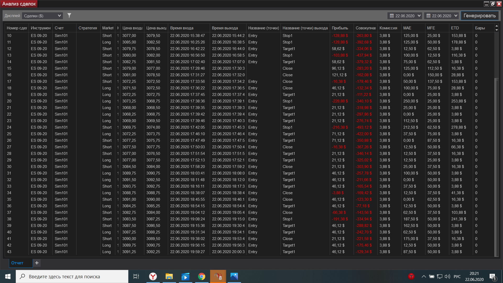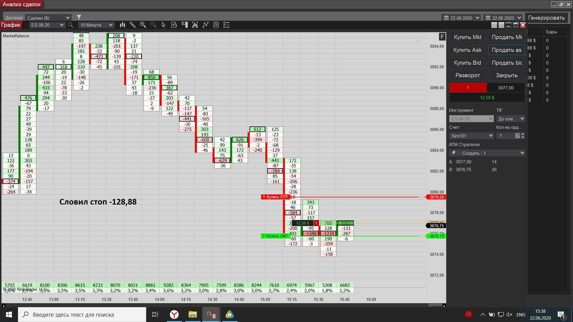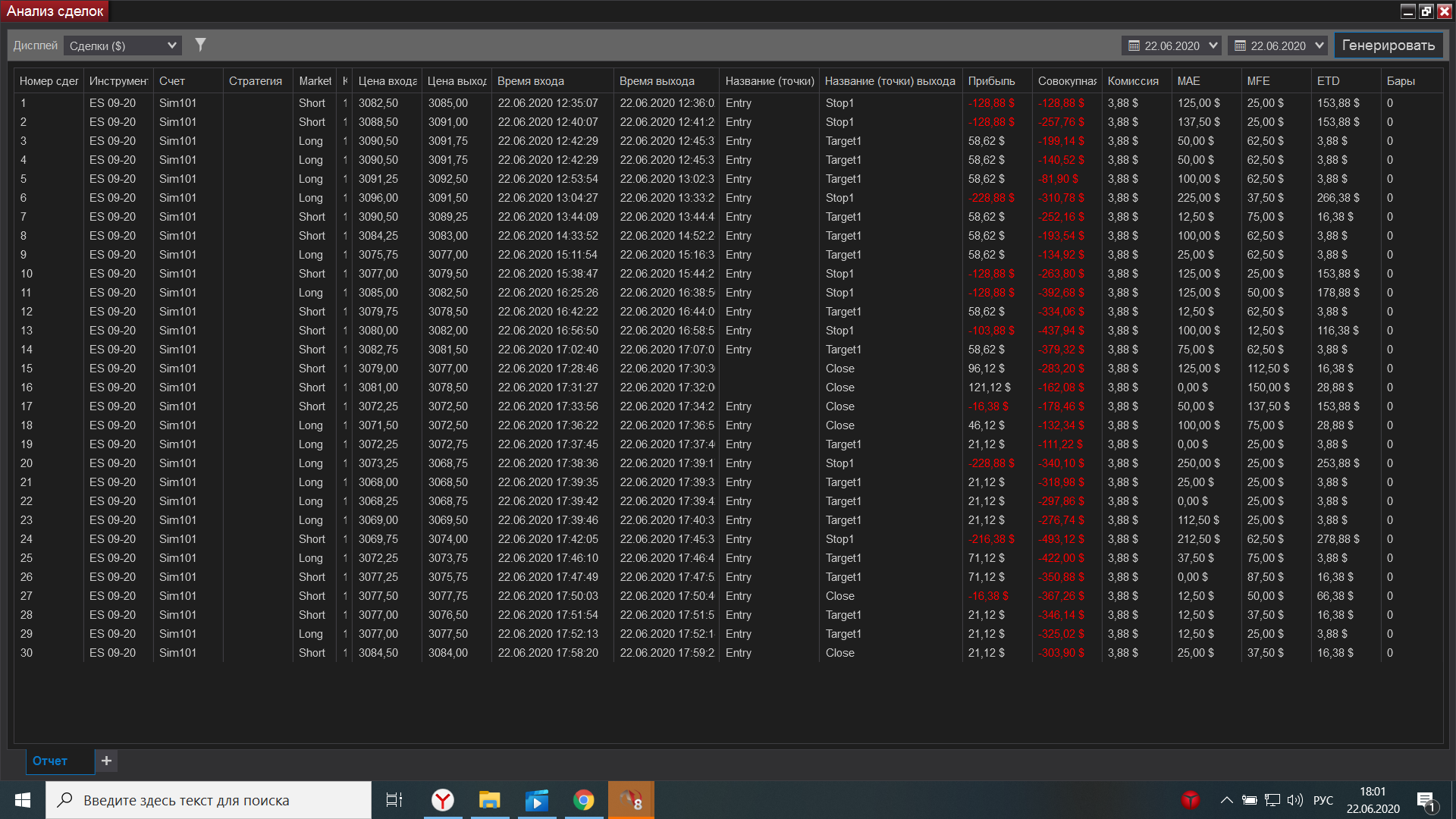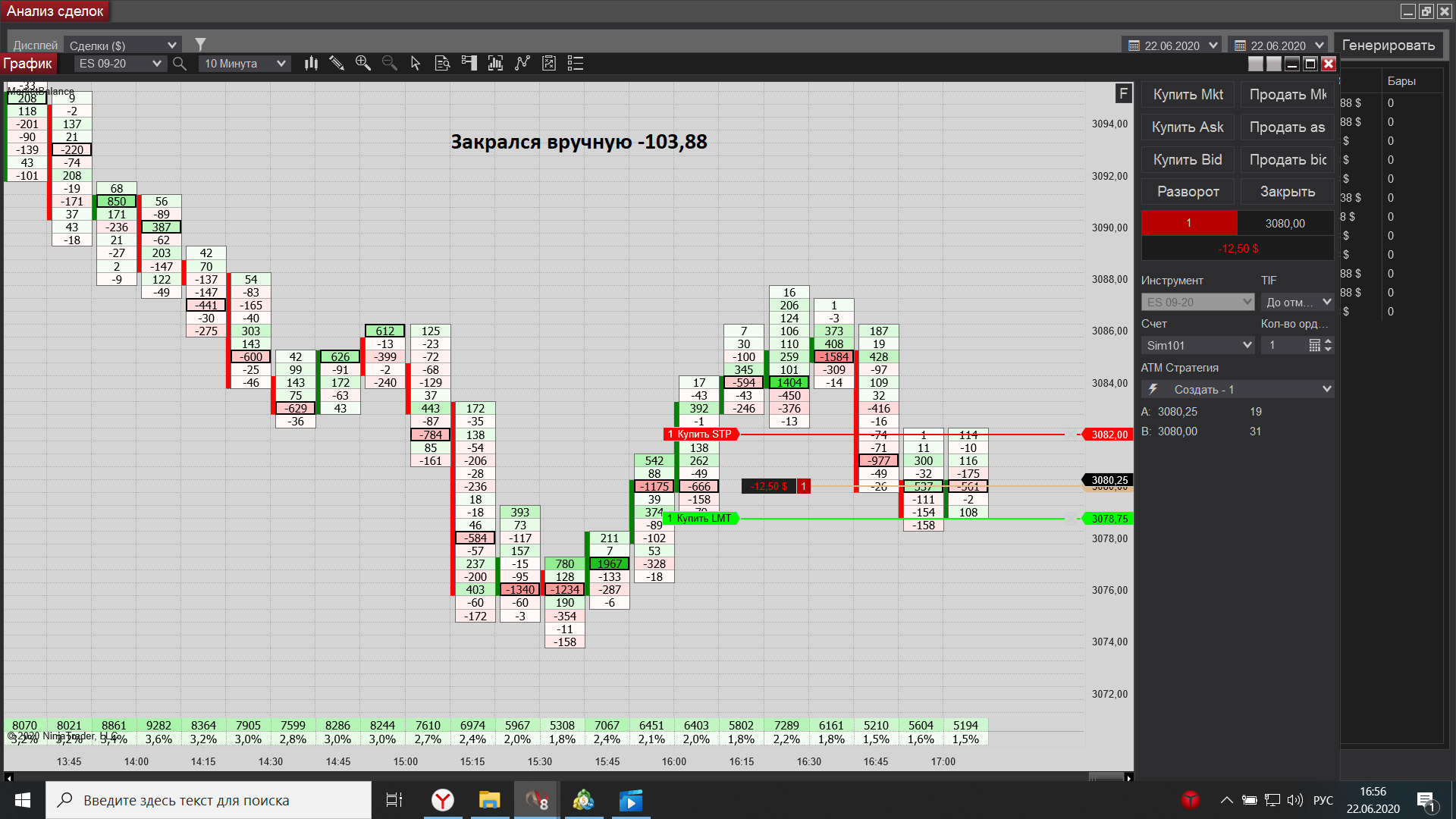 Евгений выкладываю свою торговлю за сегодня, как договаривались на вэбинаре, начиная с америки подключил истинный футпринт, он значительно лучше показывает места остановки, что значительно увеличило кол-во прибыльных сделок по сравнению с убыточными. Мне все таки кажется,что проблема моя в том, что слишком большие минуса допускаю , если цена идет против меня, т.к. в общепринятомпонимании здесь стопа нет. Получается общий минус 1587,94 , а общий плюс 1458,2, причем минусовых сделок 13, получается если бы каждый минус брал 62,5, то общий минус бы был 812,5, а прибыль 1458,2-812,5 = 645,7, а если бы каждый минус брал 50, то  1458,2 - 650=802,  причем в львиной доле случаев я мог убыток вообще брать даже 25, но дожидался стопа, вот что  обидно.