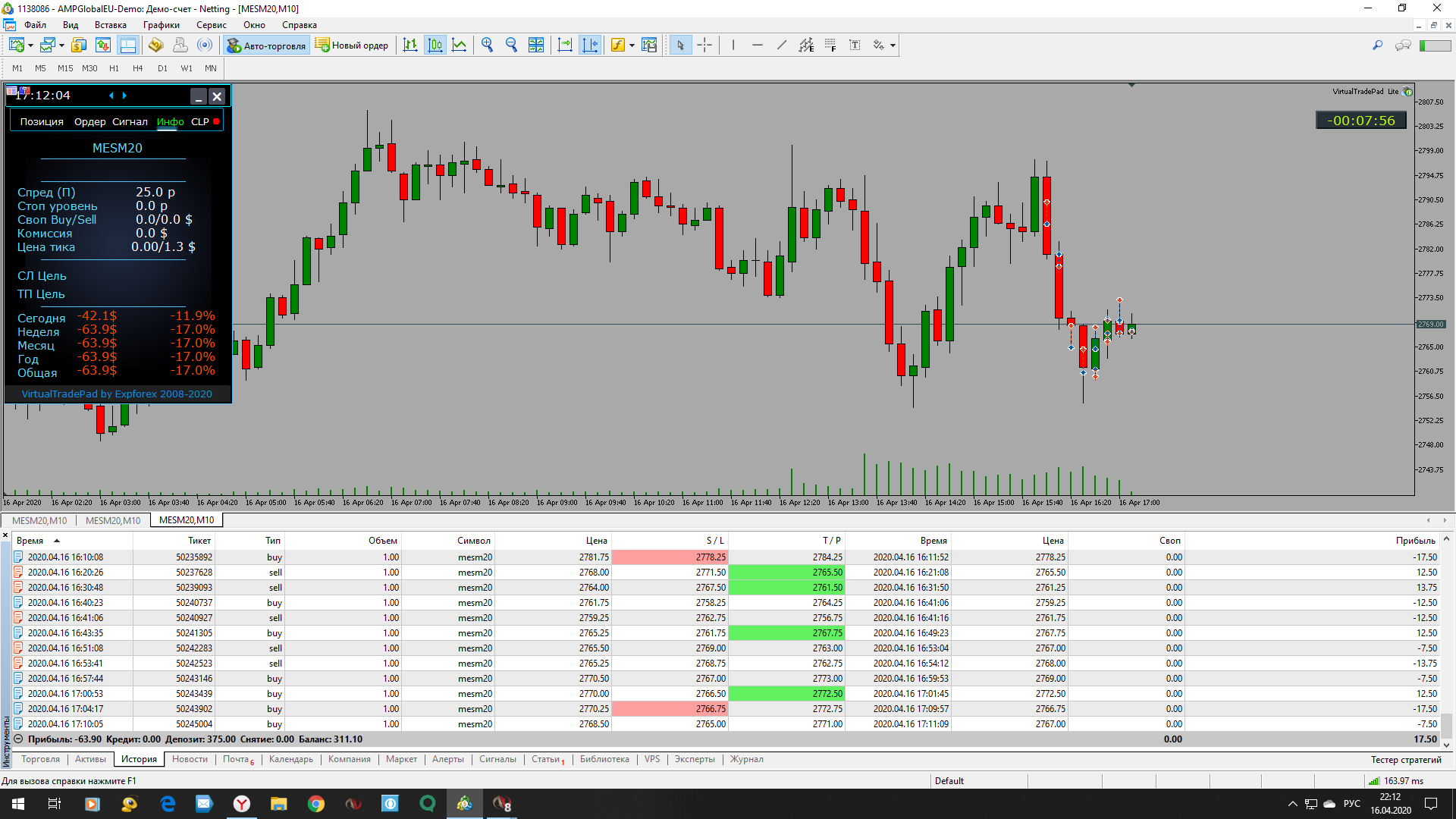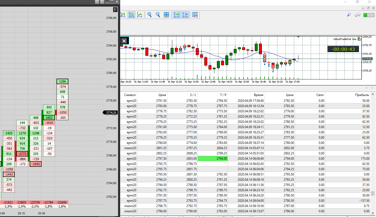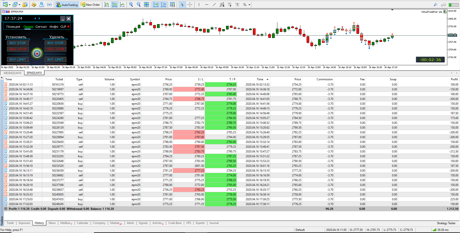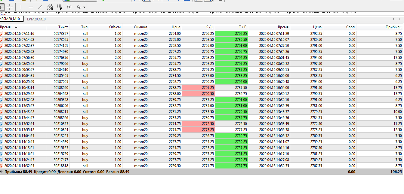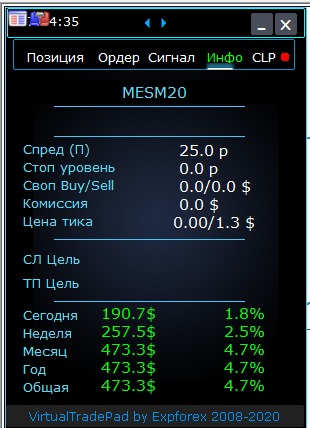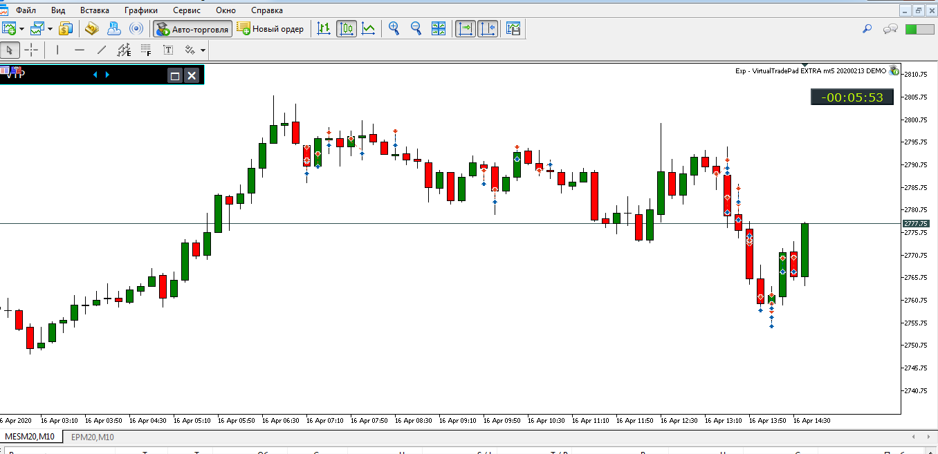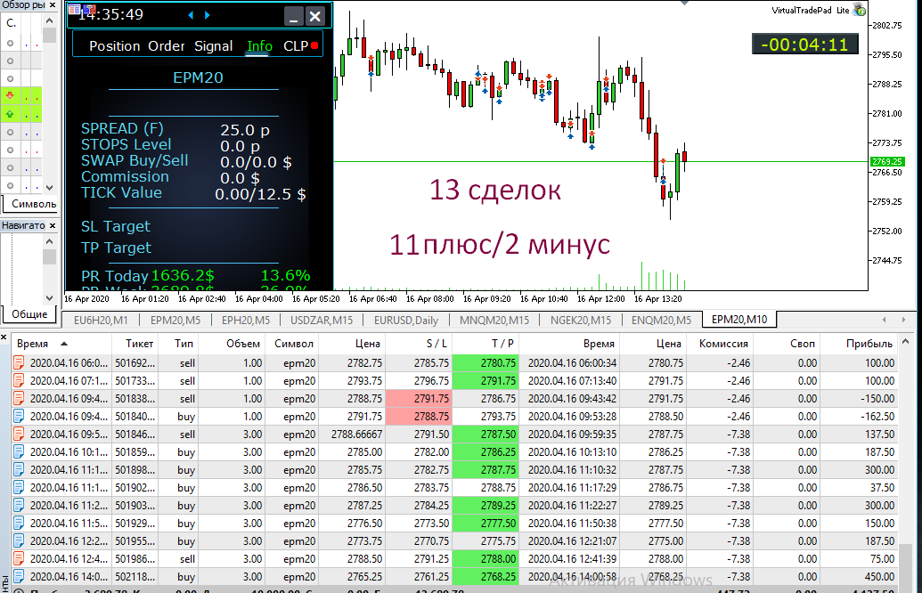 В результате торговли в течение пяти свечек выполнил 15 сделок (11 в плюс и 4 в минус, то есть 73% успешных). Старался до стоп-лосса не доводить, порой выходил раньше. В итоге чистая прибыль +42,65$ на микроконтракте.
