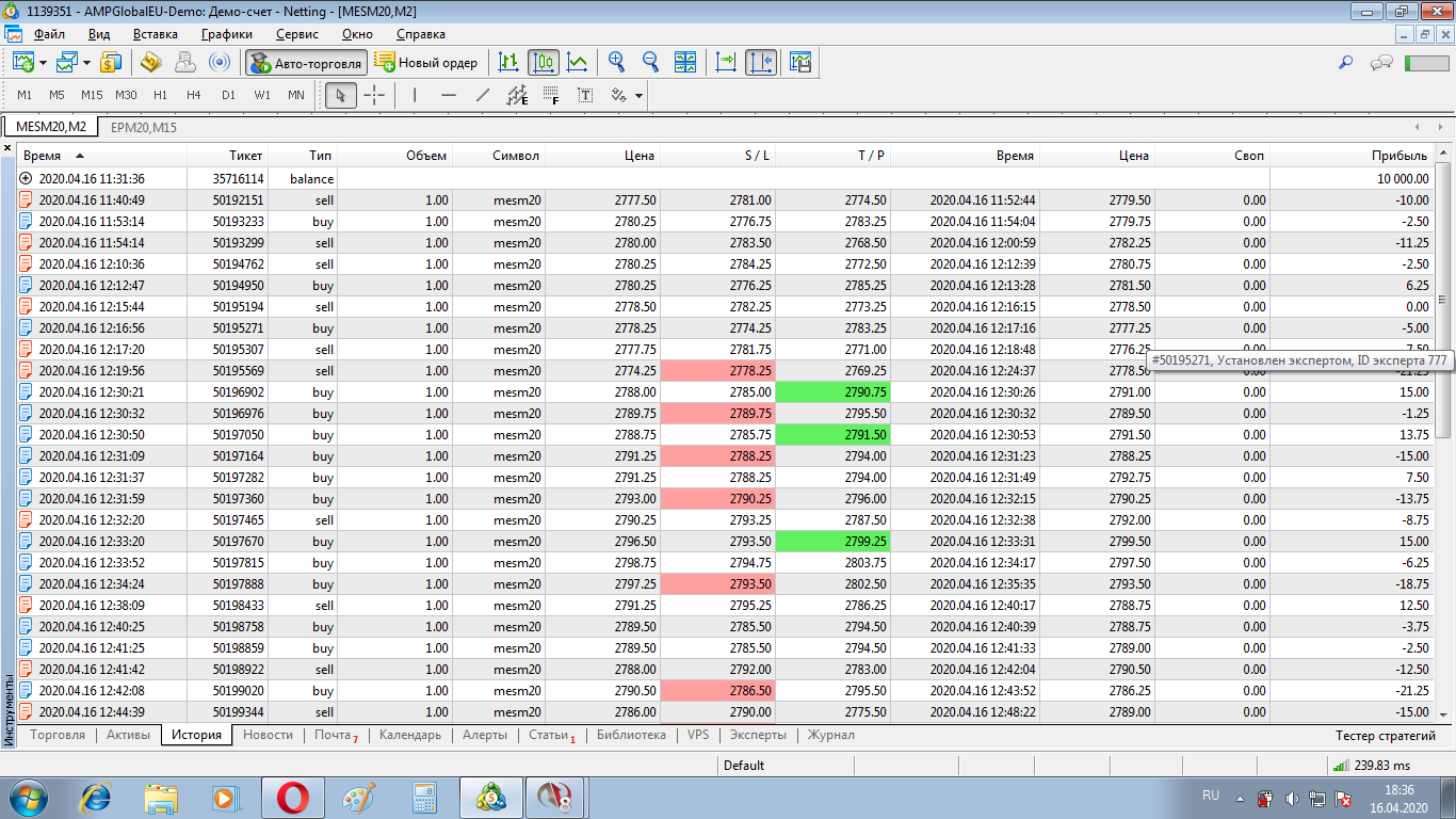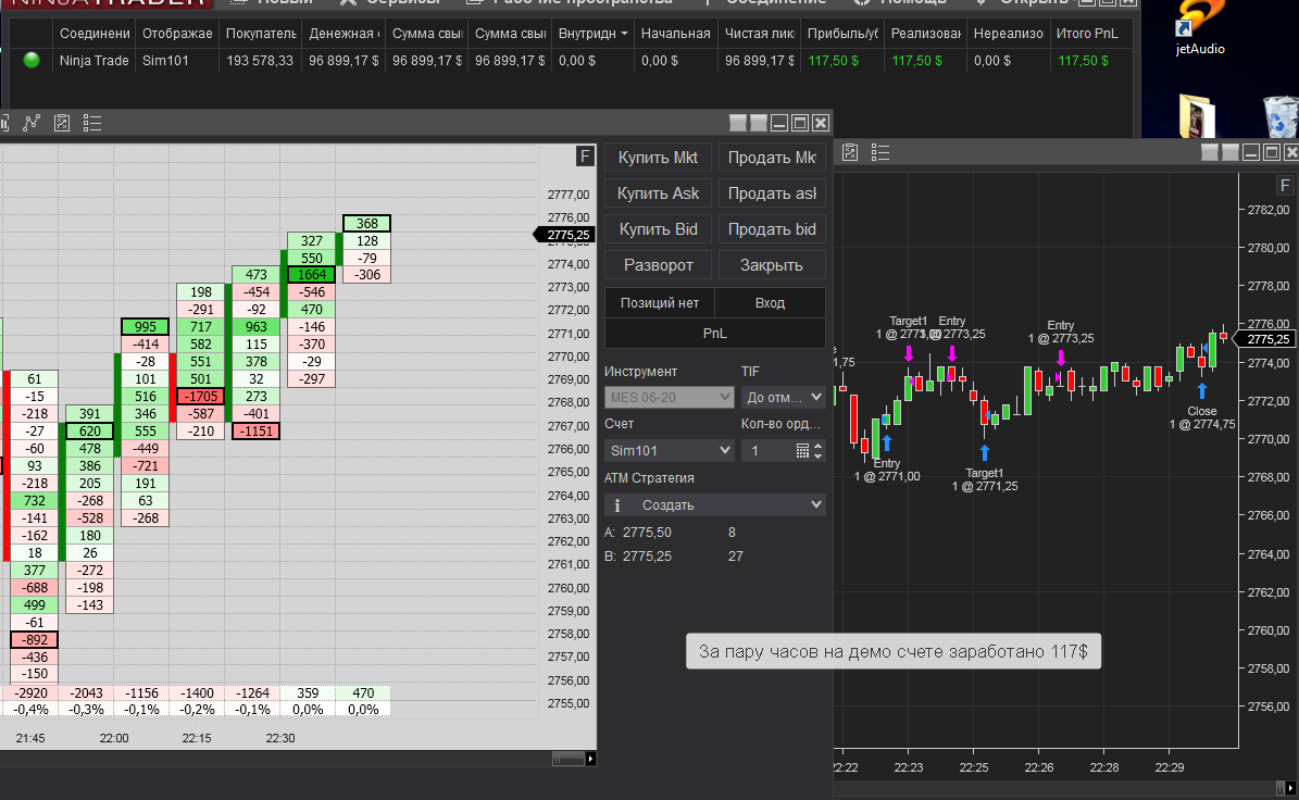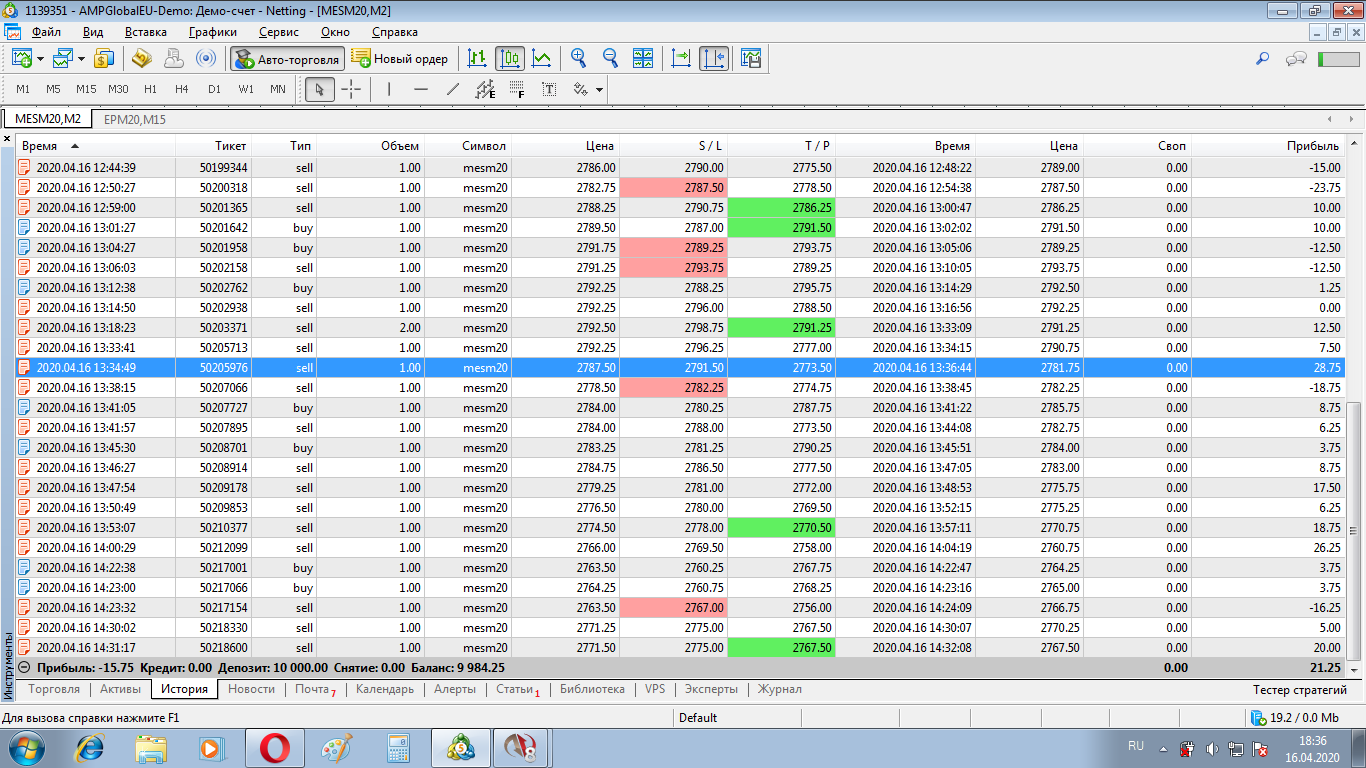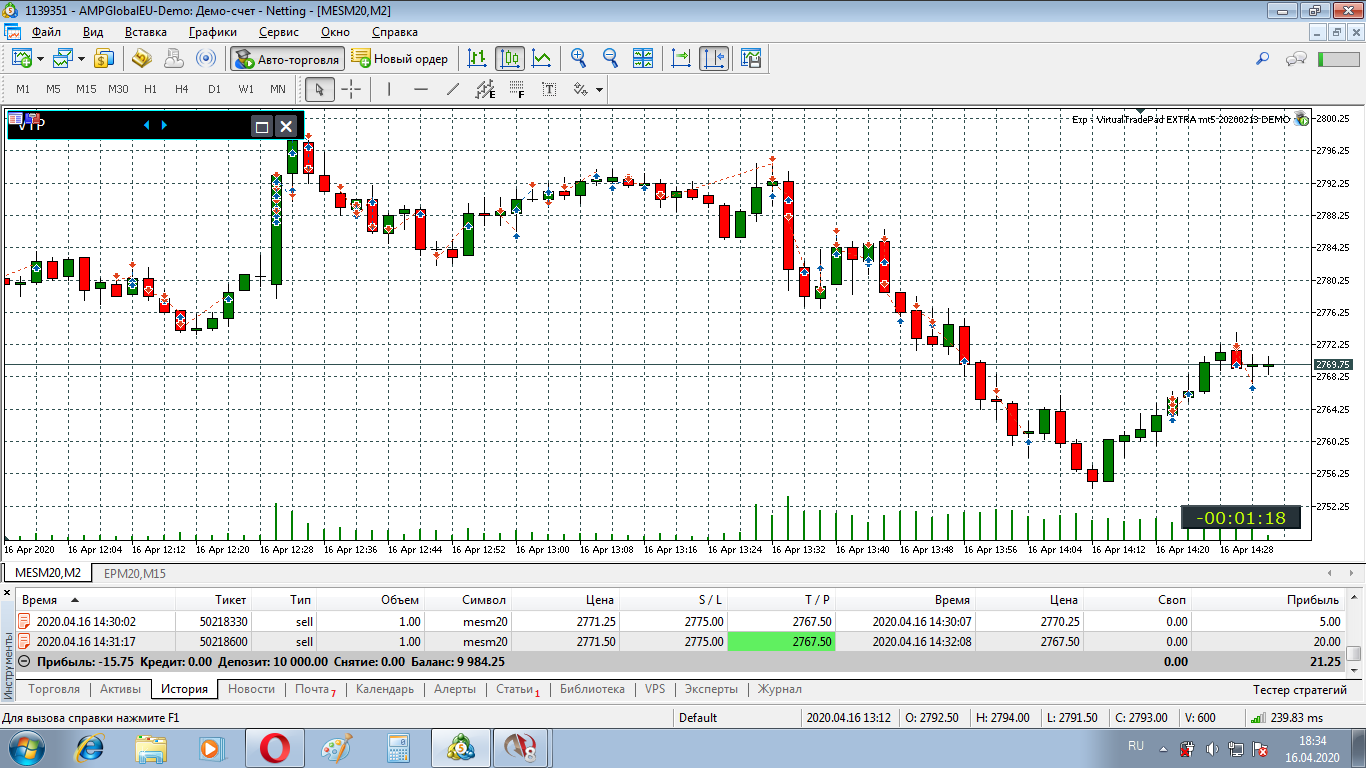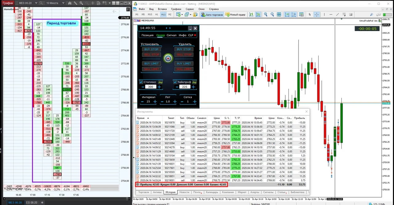 Попробовал торговать в американскую сессию. Вначале торговал на панели NT8, но начало было дёрганное, не всегда понятное. Старался находить точки входа, достаточно часто ( а может 50 на 50) сбивало стопы. Потом обратил внимание, что увлекаюсь и так как результаты видно только на графике 15сек получалось трудно соразмерять количество сделок на одну свечку в 10мин. Перешёл на торговлю на платформу AMP_Glob_EA и здесь почувствовал себя комфортнее.