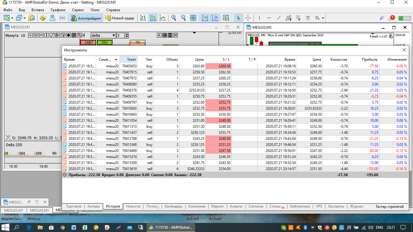 А я как обычно экспериментировал и доэкспериментировался. 19 сделок из них 5 (26.32%) убыточных и каких...Итог: -222$ на микро. Это все усреднение. причем из 5 убыточных сделок 3 мог свободно вывести в нормальный плюс 3-4 тика, но пожадничал и в результате убыток. Одна убыточная - это просто стремительный гэп, совершеннно неожиданный. последняя - это мой недосмотр тайминга, сд