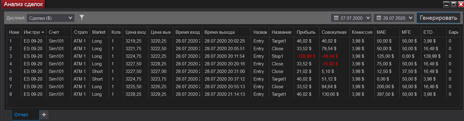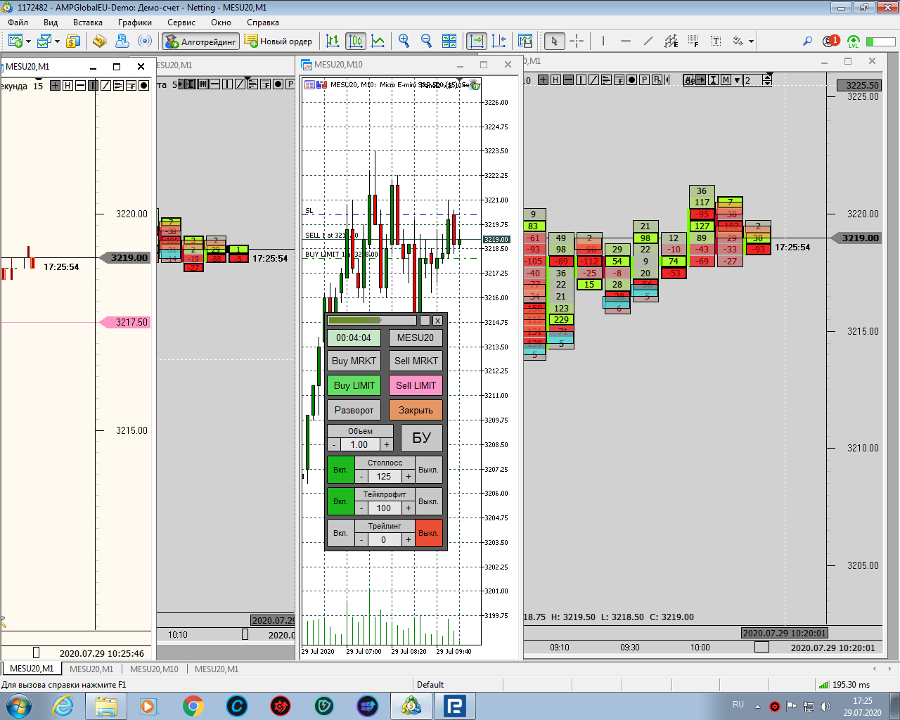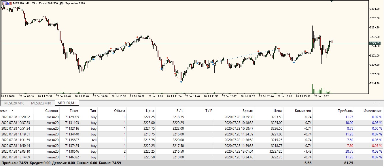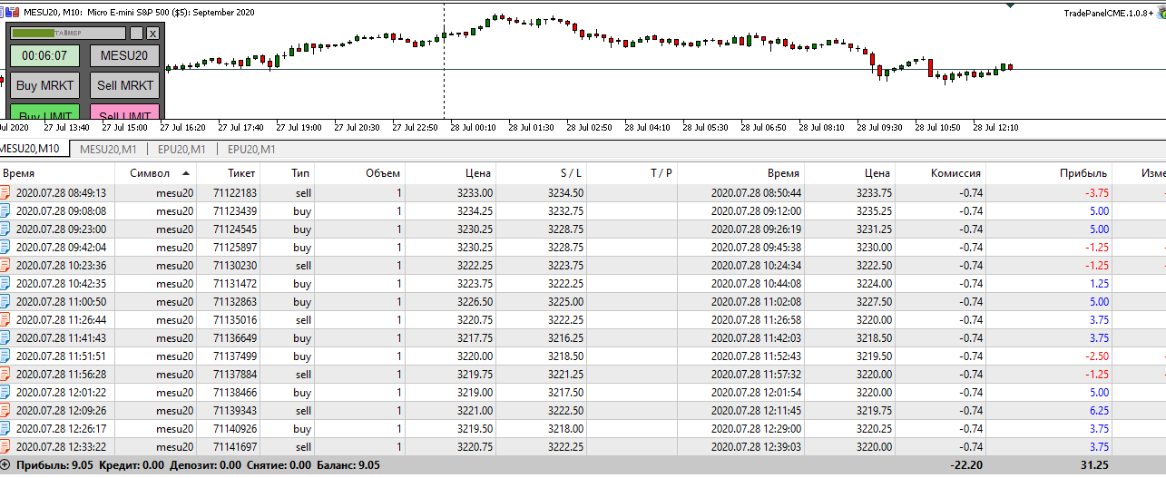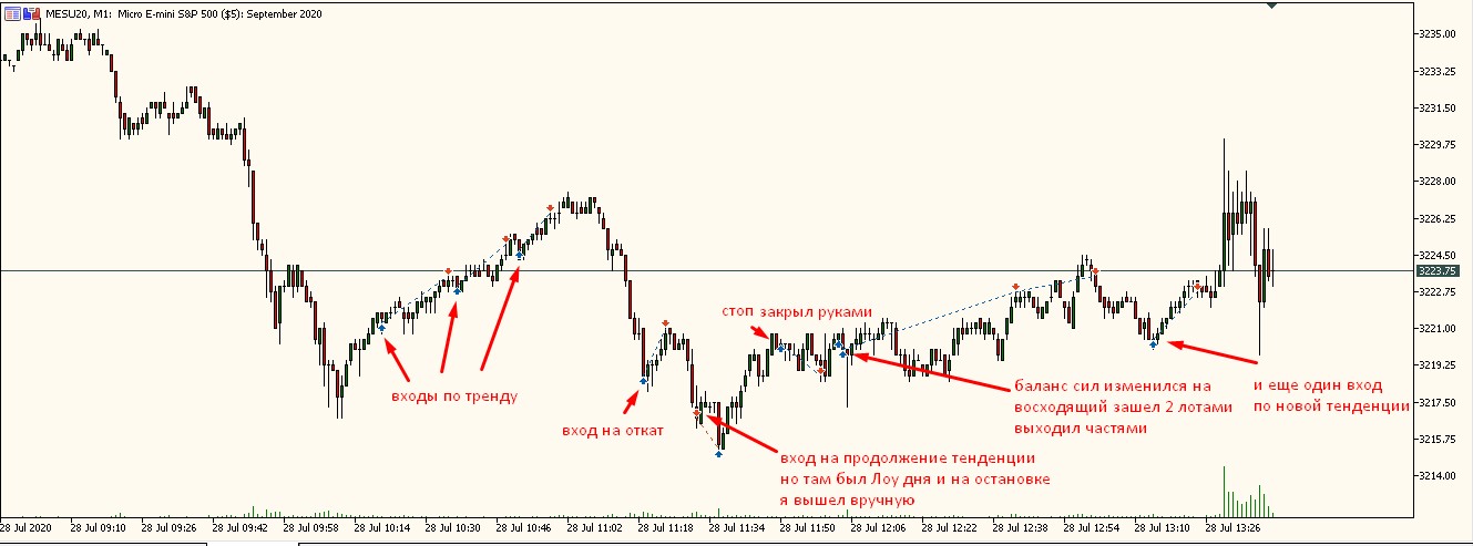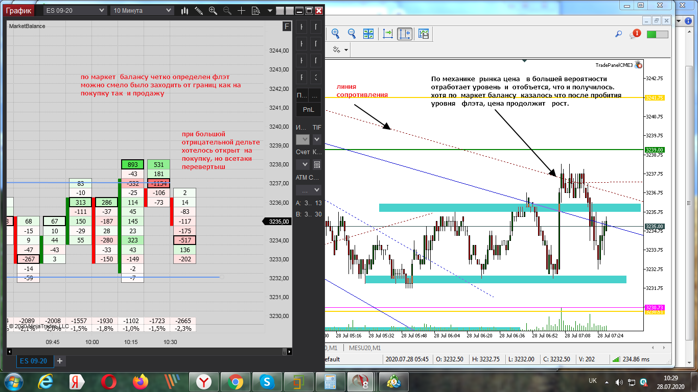 Олег Коломацкийнаписал28 июля 2020 в 17:47Поход цены вниз и сильный откат, все на футпринте! На США берем импульс и откат! И все! Конечно, если позволяет рынок... Вчера он был дерганный. Сегодня благоволит. Раз на раз не приходится. Отсюда вывод: лучше переждать, пока будут возможности, чем лезть на рожон! Самая главная (у меня) причина сливов - непонимание происходящего на рынке, когда он просто не торговый! Главный признак - цена стоит на месте и тикает туда-сюда без явного движения! Жадность и стремление совершать сделки чтобы "заработать", когда просто для этого нет условий!!! Получается спор с ценой и попытка угадать, а не работа по системе на подходящем (!) для этого рынке! Сейчас был всего один стоп на открытии США. Всего +600$ строго по импульсам и откатам.