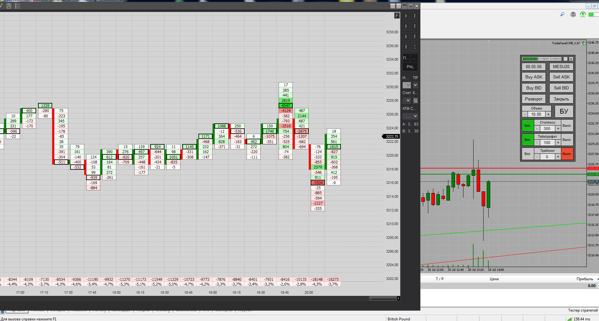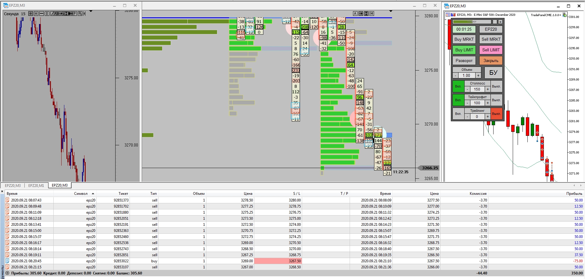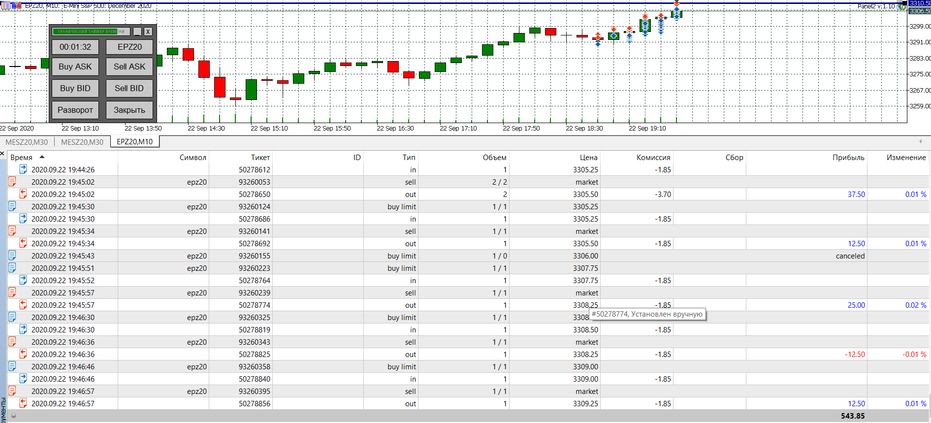 Выкладываю, смеха ради, как иллюстрацию к вопросу, ибо сие точно не скальпинг!..))) Экспериментировал намедни с усреднением. Развлекся, благо счёт царский!.. Наторговал мини контрактом за сутки, в два захода, без малого 20 тыщ мериканьских рублей. В 1-й заход закрывался вручную. А на 2-й выставил лимитник, так как биржа закрылась на перерыв, а я засыпал. По моим прикидкам график должен был достигнуть "стопа," в лучшем случае, к утру. Однако он сработал сразу же, после открытия ночной сессии, разбудив сообщением, что "ордер заполнен", хотя тот находился ещё в добром десятке пунктов от графика.