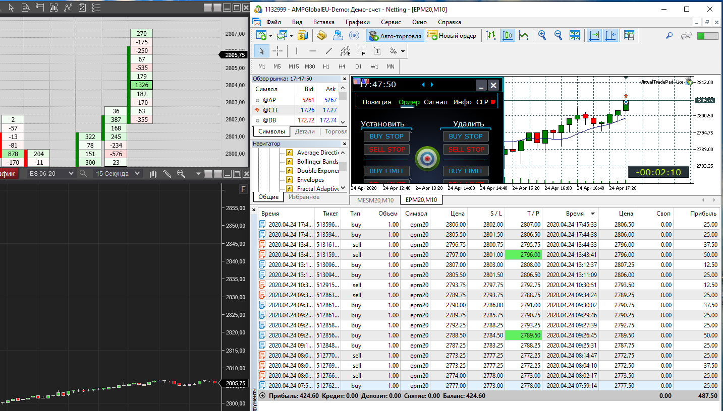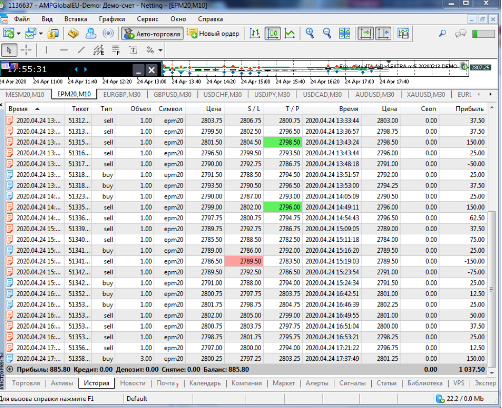 Лариса, доброго времени. Я уже выше писала в ветке, что на демо в АМР невозможно понять реального результата, т.к. закрытие сделок происходит молниеносно. Все ваши сделки, закрытые не по тейку, а вручную - это ваши потенциальные минусы. Особенно сделки, закрытые в 1-2 тика. На Ниндзе эта картина была бы очевидной, т.к. там на демо происходит все как на реале и сделки не закрываются сразу при касании тейка. Цена может несколько раз биться о тейк и сделка при этом не закроется, хотя при этом ситуация уже может измениться и цена развернется в другую сторону и уже может закрыть по стопу. На реале в АМР все будет происходить также. Если вы будете закрывать сделки вручную, то это тем более будут минусы, т.к. вы всегда будете закрываться по худшей цене. Лариса, я не хочу вас как-то задеть, но именно поторговав на демо Ниндзи, вы получите реальный результат и поймете, что не все так просто и результат у вас будет другой. Вы будете подготовлены к торговле на реальном счете. Вы же уже пробовали торговлю на Ниндзе и уже видели, что там по-другому все происходит, вот это и есть те реалии, которые вас ожидают на любом реальном счете хоть в Амр, хоть в Ниндзе.