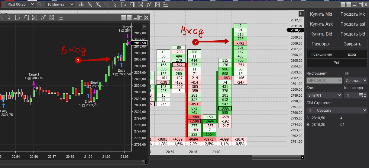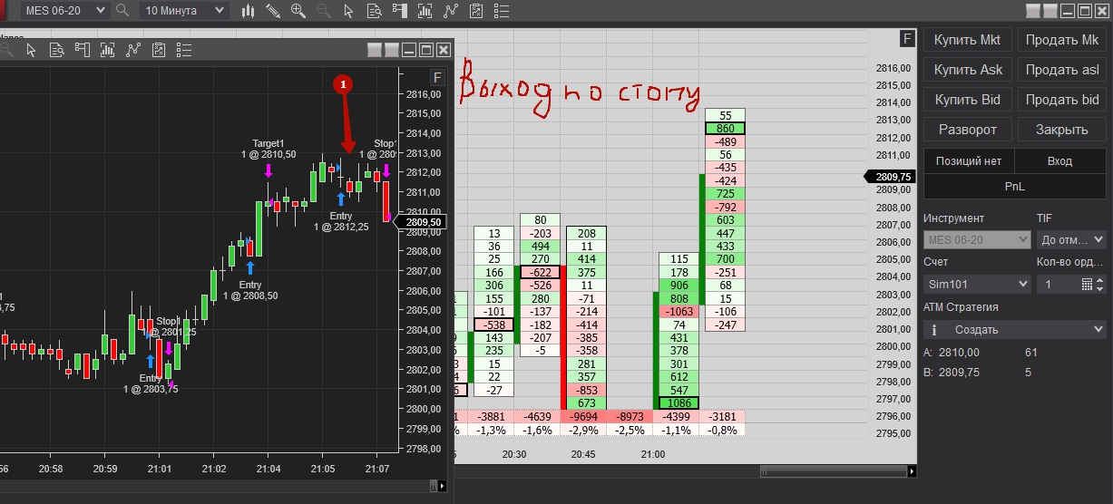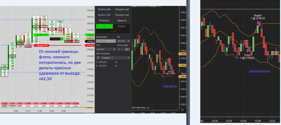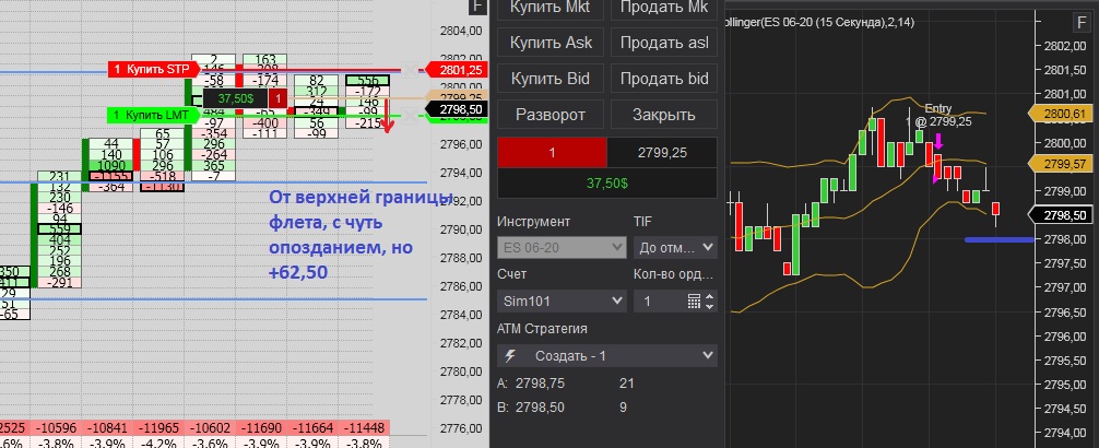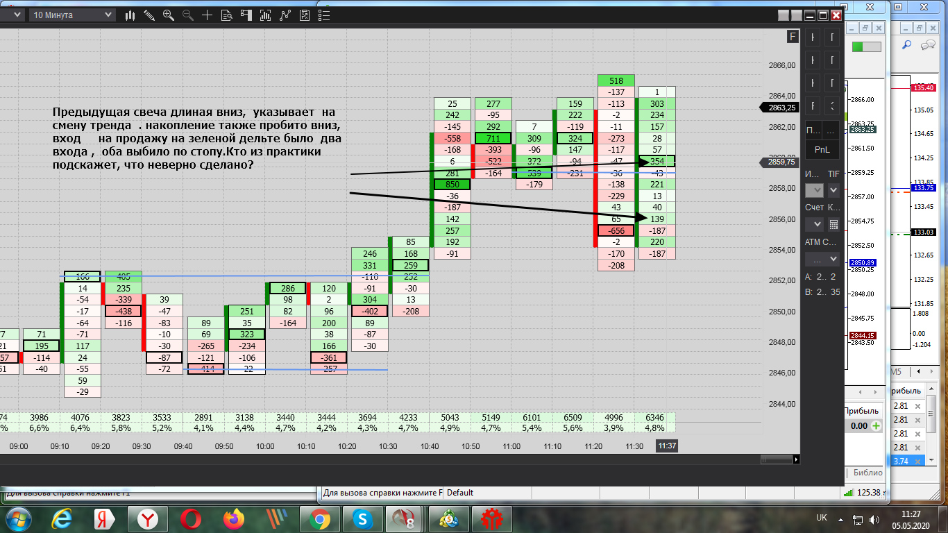 Покупка при накопление негативной дельте и остоновки продаж, но проезашол срыв на несколько пунтов и активирался стоп. После того зашол сразу в обратную сторану, после как заметил, что остановляют покупки. Достиг таргет, как на сделки, так и на заработку.
