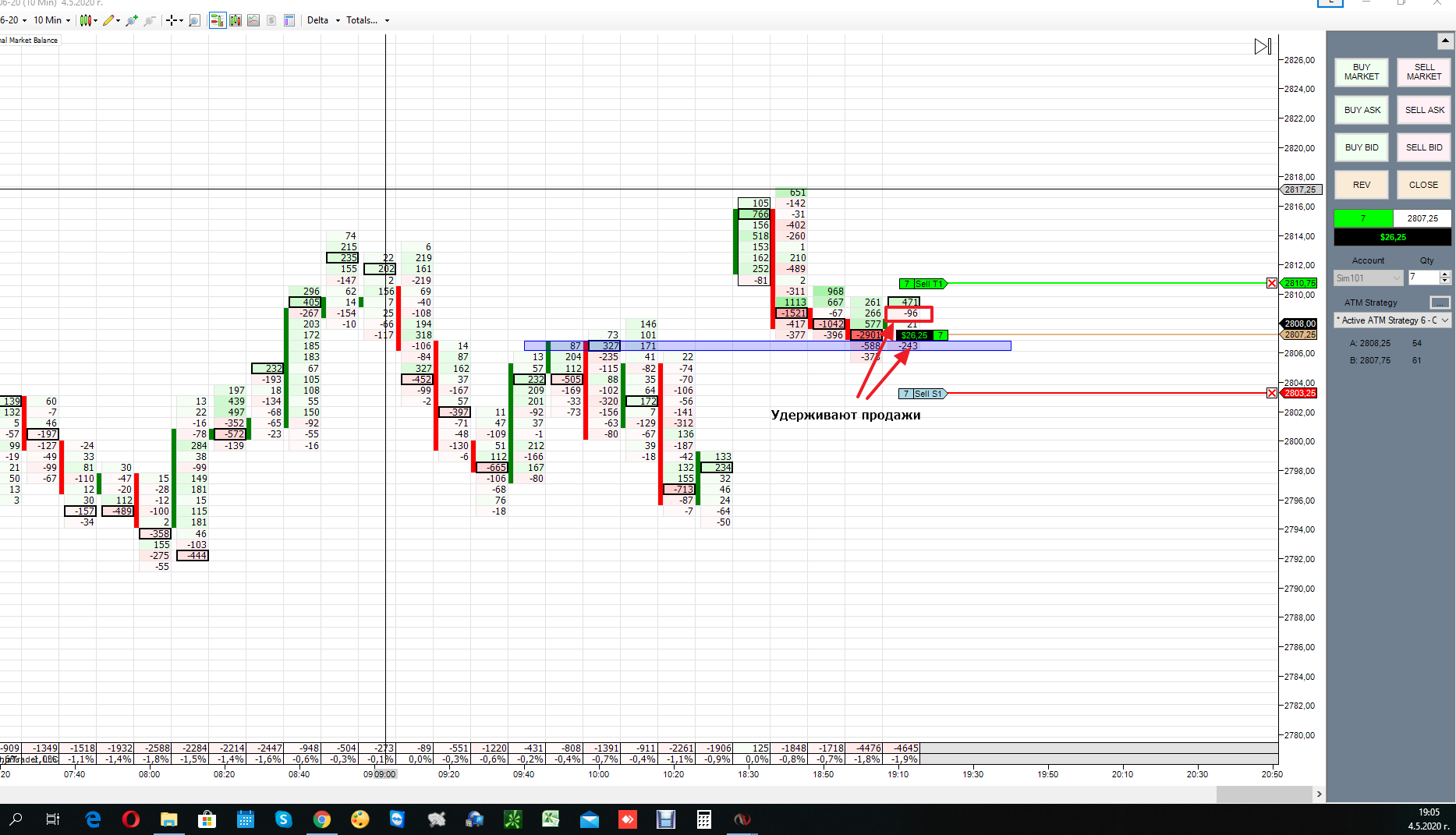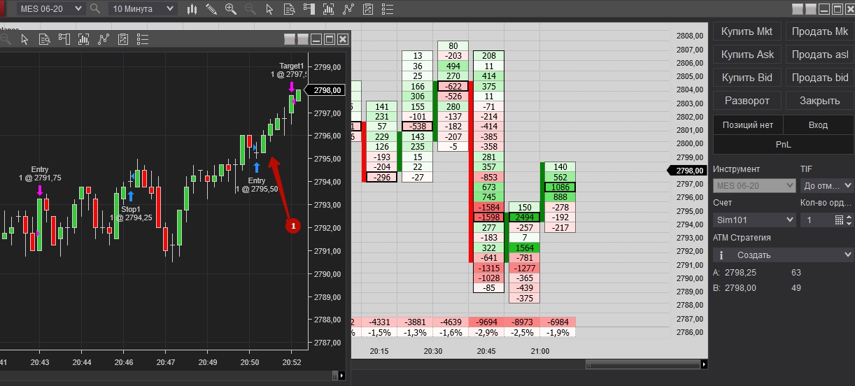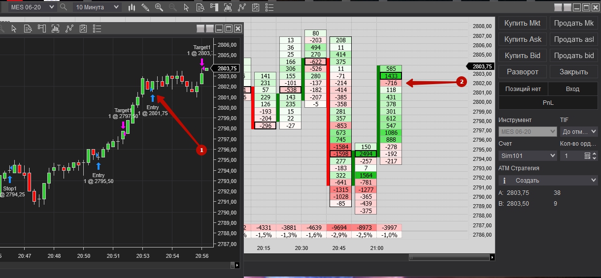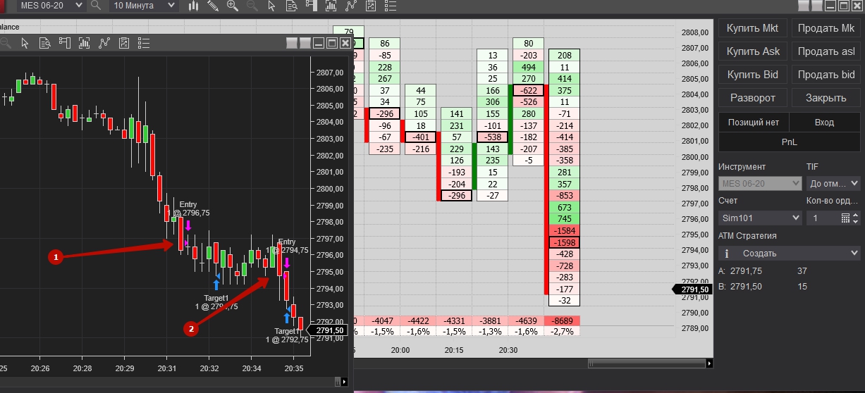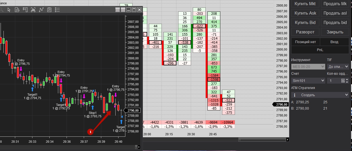 Покупка при накопление негативной дельте и остоновки продаж, но проезашол срыв на несколько пунтов и активирался стоп. После того зашол сразу в обратную сторану, после как заметил, что остановляют покупки. Достиг таргет, как на сделки, так и на заработку.