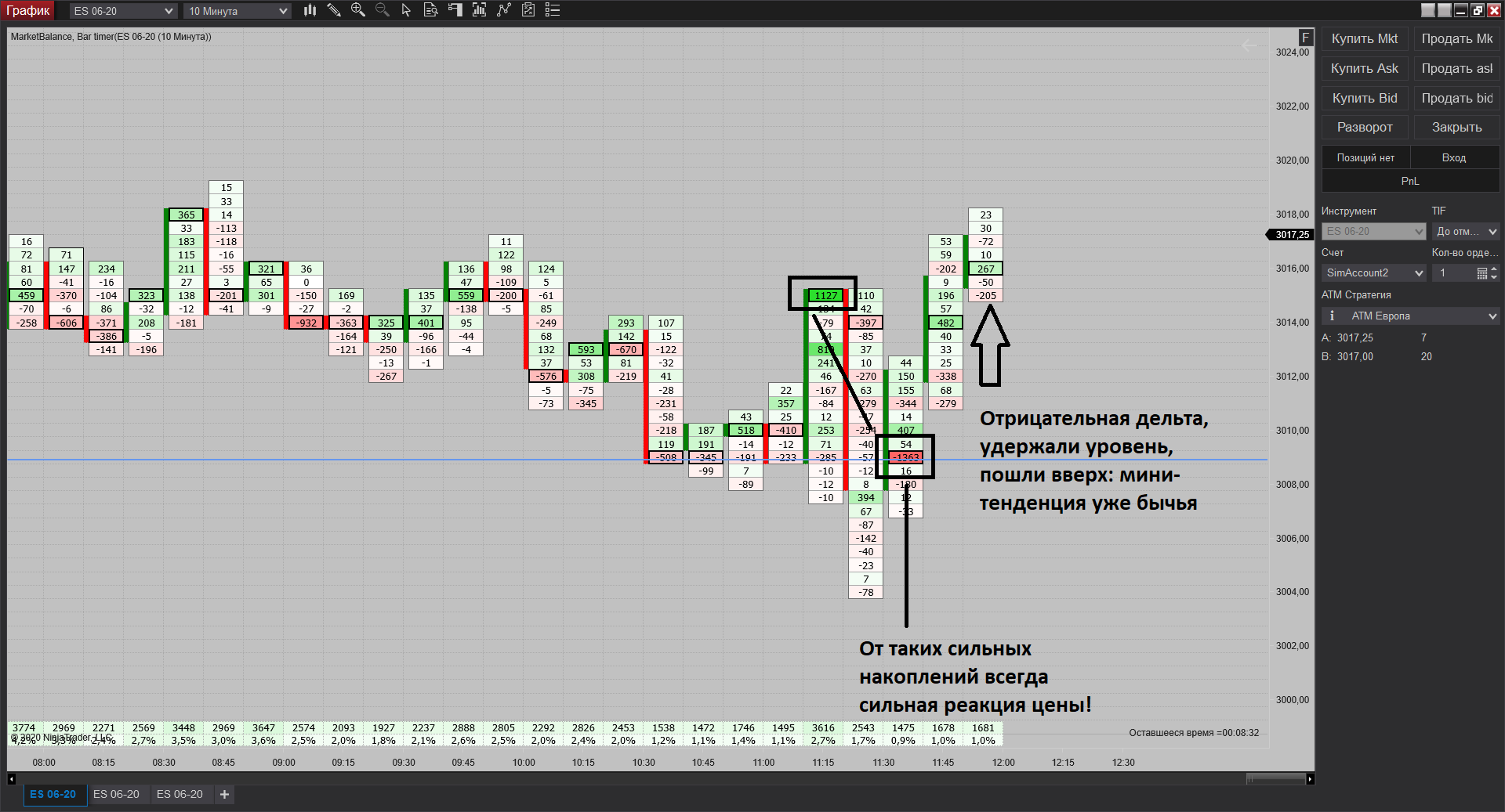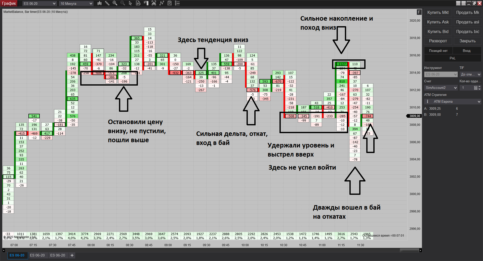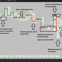 я сейчас готовлю по курсу вопросы, там много не очевидного, так то торговать получается, но если один в один как евгений делать получается угадайка 50 на 50, например есть боковик, наверху накопление большое с зеленой дельтой на истории и цену прогнали вниз, подошли опять к уровню где это накопление было,формируется новое зеленое накопление, как только оносоизмеримо с теми, которые прогоняли цену, евгений открывает сделку в шорт , согласны?